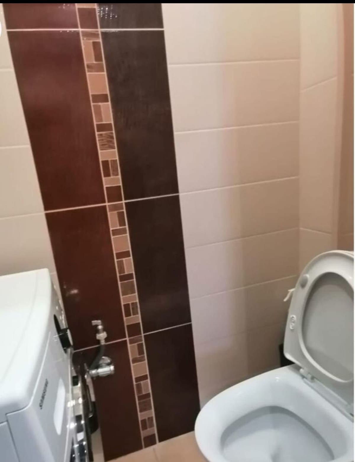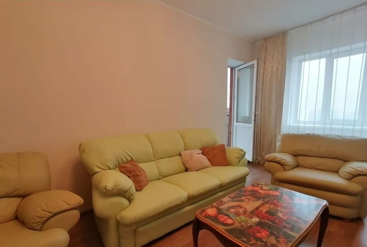 Просторная гостиная (диван, 2 кресла, также с гостиной выход на лоджию), спальня (новая кровать, шкаф), раздельный санузел с современным кафелем (в туалете: унитаз и стиральная машинка; в ванной душевая кабина и раковина); на кухне современный кухонный гарнитур, обеденная зона, 2 стула.