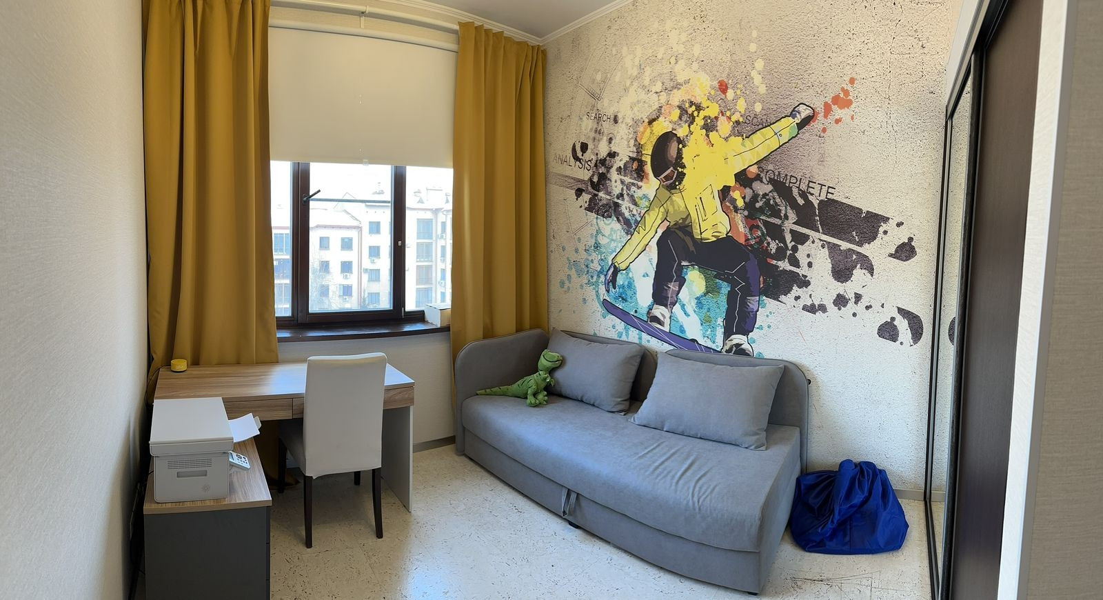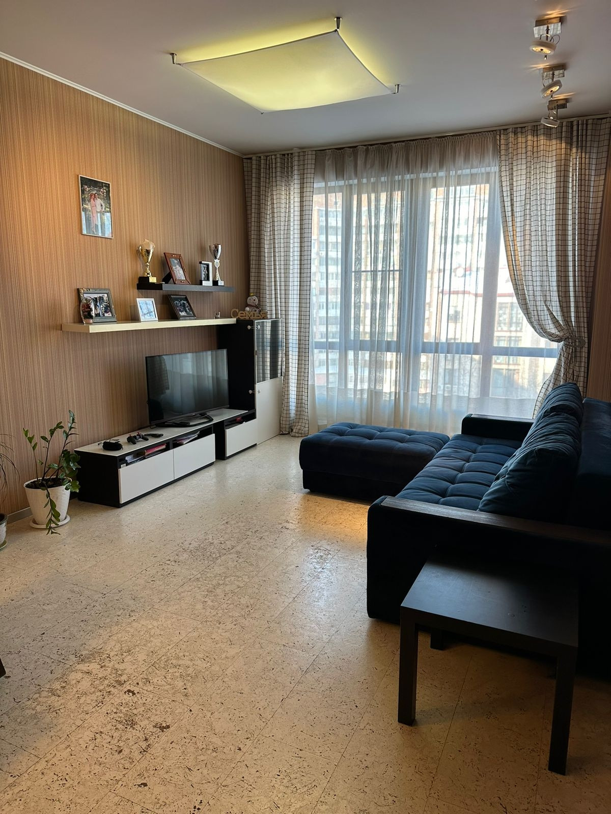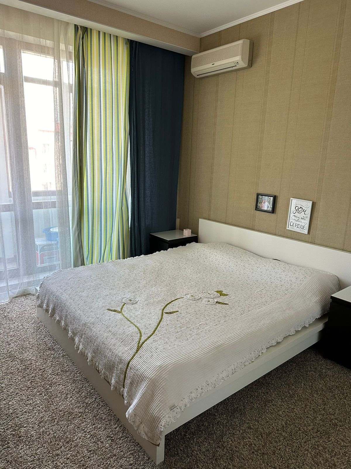 Большая кухня-гостиная 25,5 кв.м. с панорамными окнами, спальня 14,3 кв.м и детская 10,2 кв.м. Встроенные глубокие и вместительные шкафы-купе. Напольное покрытие - пробка, ковролин и кафель. Видеодомофон. 2 кондиционера. Бойлер - водонагреватель.