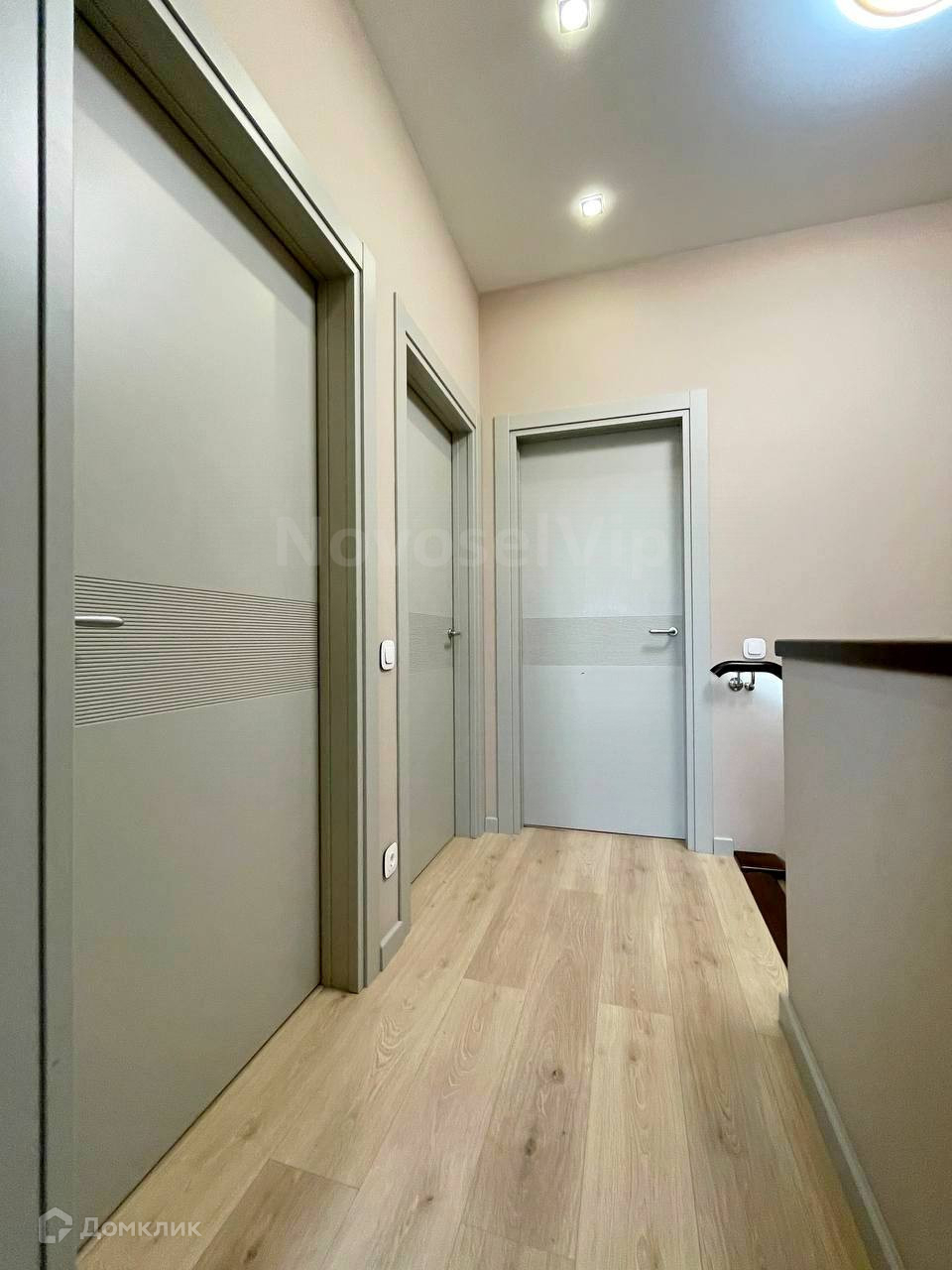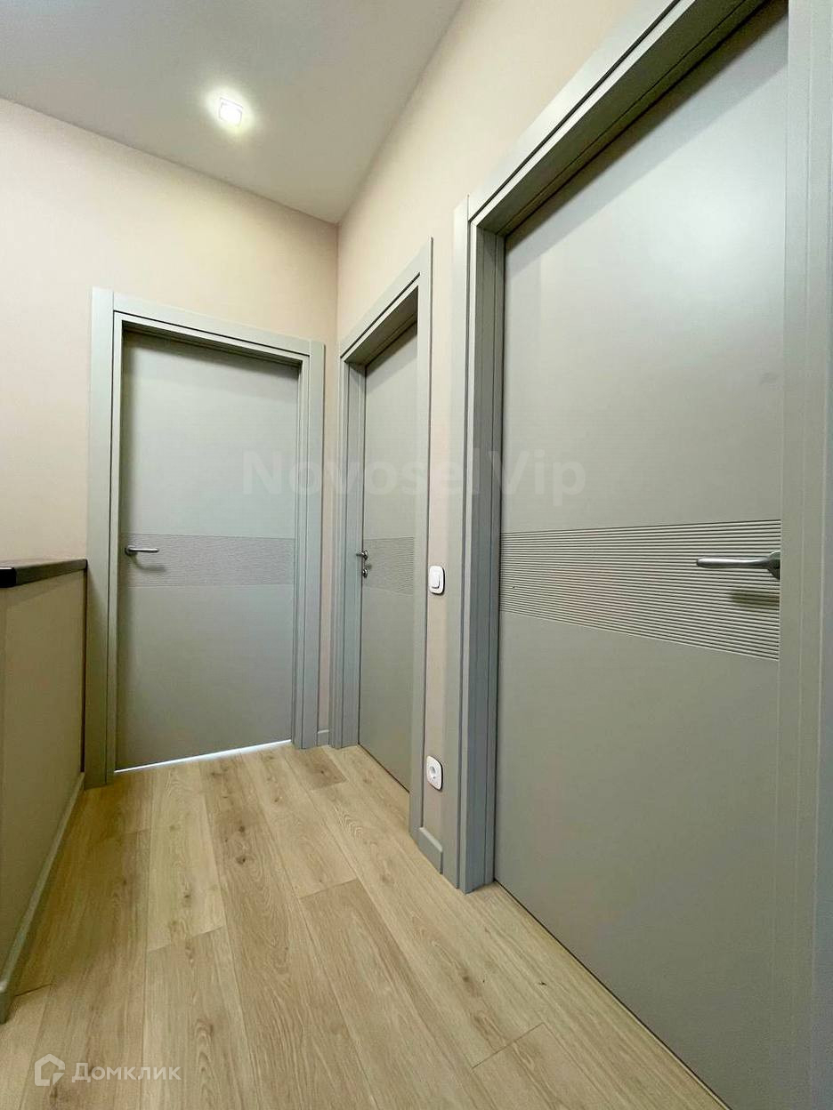 декоративная штукатурка. ламинат высокой прочности. гипсокартоновые потолки с дизайнерским решением, плитка в санузлах, инсталяция и сантехника в рабочем состоянии фирмы GROHE, двери фирменные Bonait, в прихожей дверь ПРОМСТРОЯ заменена на дверь с теморазрывом, лестница натурльаный материал БУК с освещением, в спальнях сделаны оригинальные дизайнерские рисунки ручной работы.