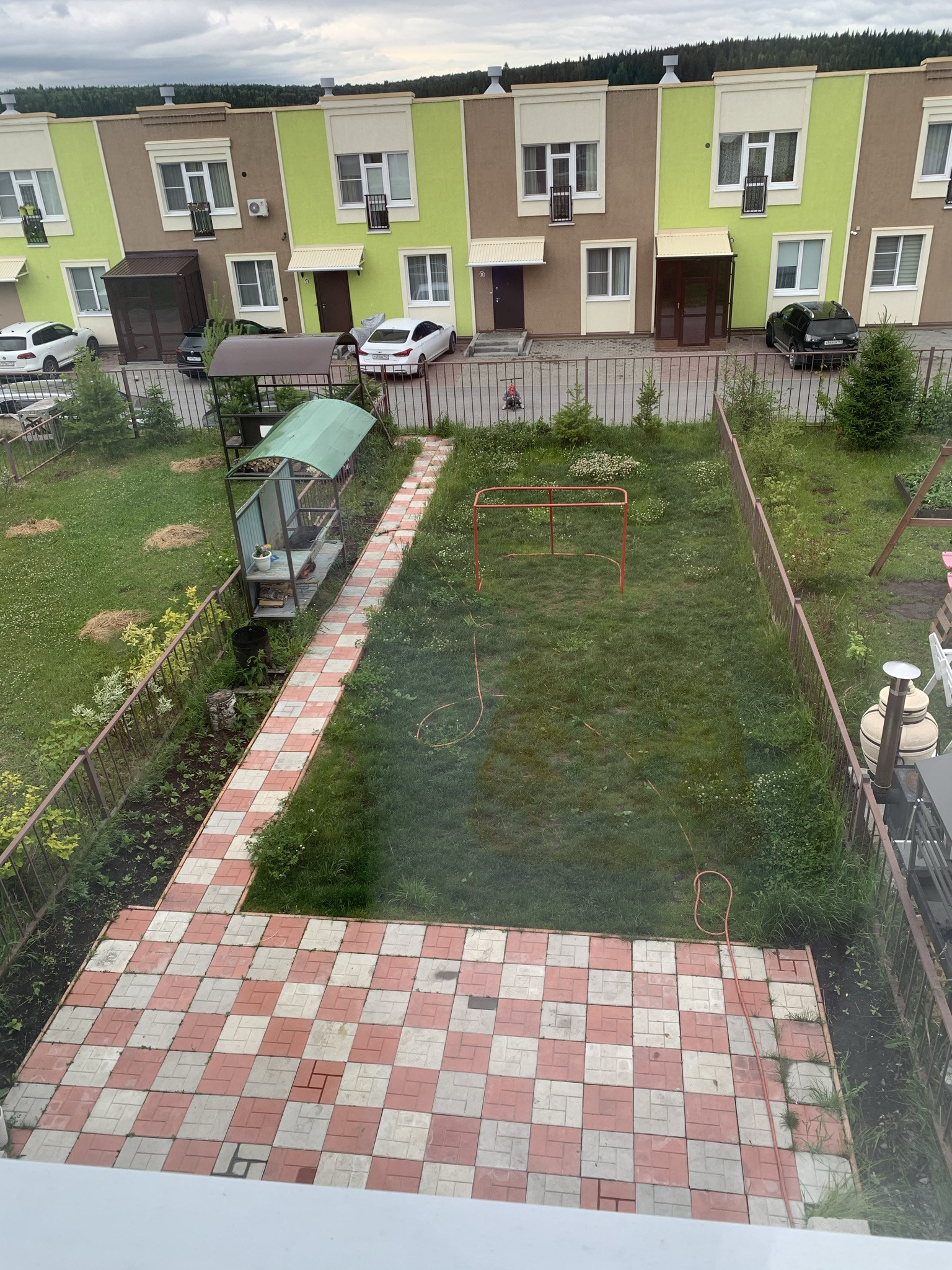 Со стороны заднего двора площадка для пикника с мангальной зоной и газоном.