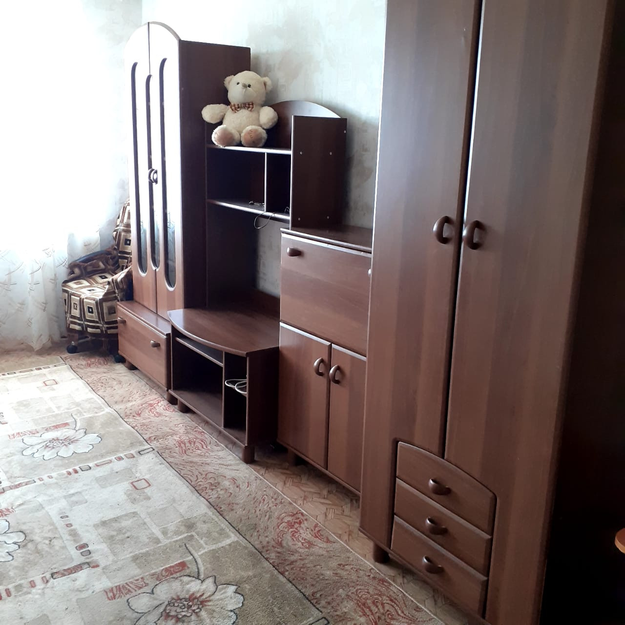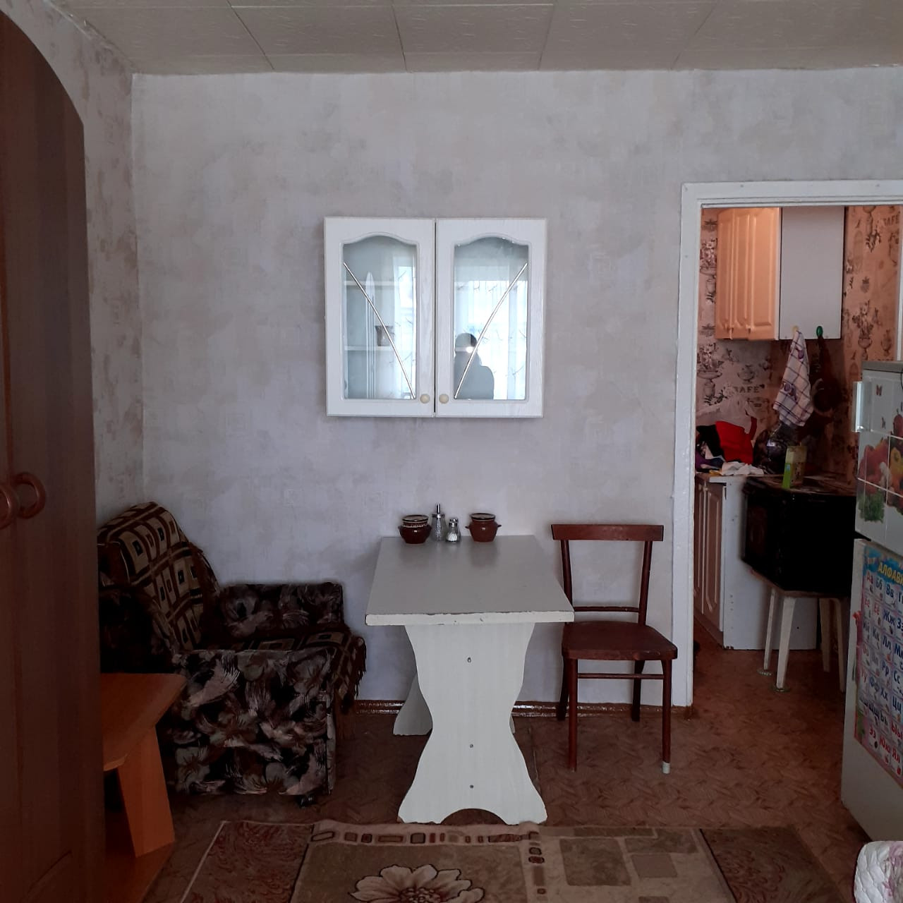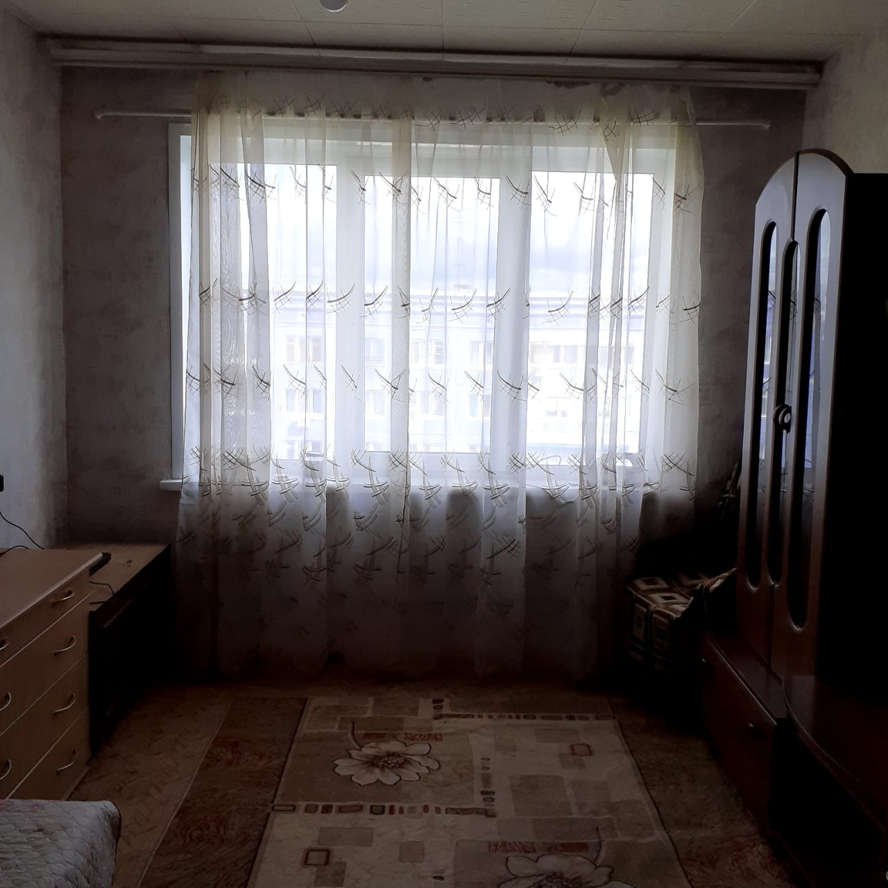 Состояние обычное, комната светлая, есть необходимая мебель и бытовая техника, нет спального места.