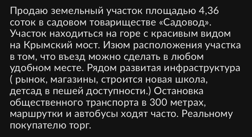 Продаю земельный участок площадью 4,36 соток в садовом товариществе «Садовод». Стоимость участка 1 500 000, 00 руб. Участок находится на горе с красивым видом на Крымский мост. Изюм расположения участка в том, что въезд можно сделать в любом удобном месте. Рядом развитая инфраструктура ( рынок, магазины, строится новая школа, детсад в пешей доступности).Остановка общественного транспорта в 300 метрах. Маршрутки и автобусы ходят часто. Все документы на руках ( выписка из единого гос. реестра, топографическая съёмка, градостроительный план) Реальному покупателю торг.
