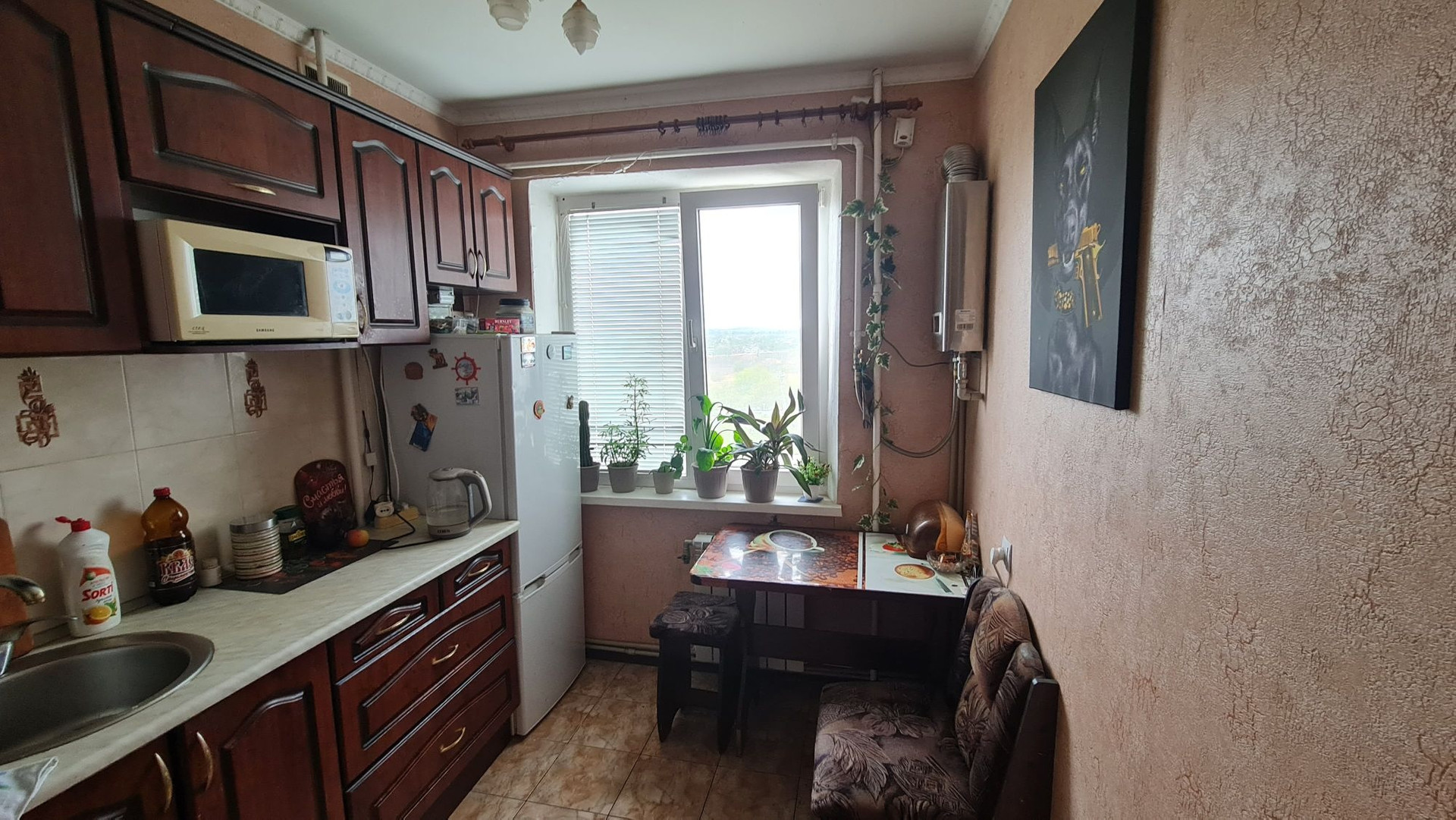 Квартира с косметическим ремонтом, в хорошем жилом состоянии. Кухня увеличена за счёт совмещения санузла. Трубы и радиаторы отопления заменены, установлена газовая колонка.