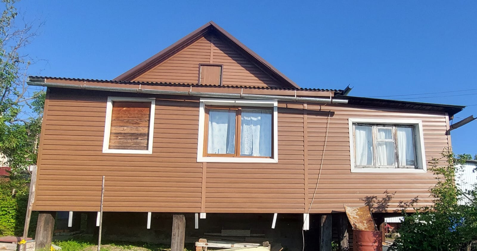 Обшит сайдингом по всему периметру. Пластиковые окна.