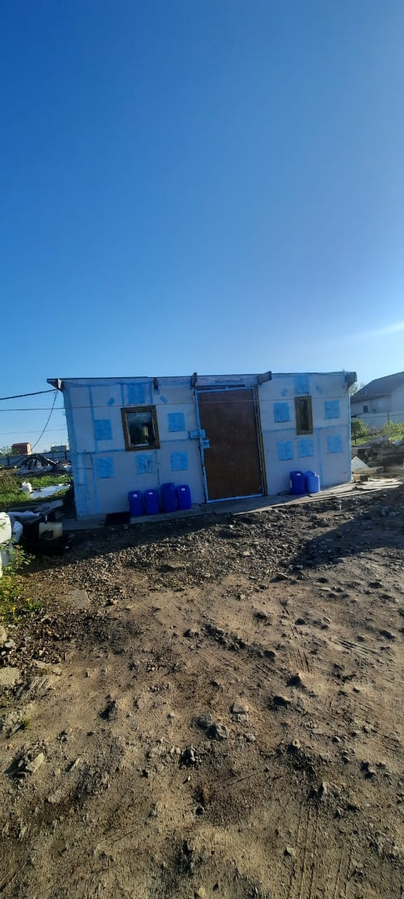 Дом модульный: размер 6*8м, каркас металлическая труба 18*18 см, обшит сэндвич панелями, утеплитель "Базалит", фундамент ЖБ блоки. Накопительный бак для воды, бойлер.