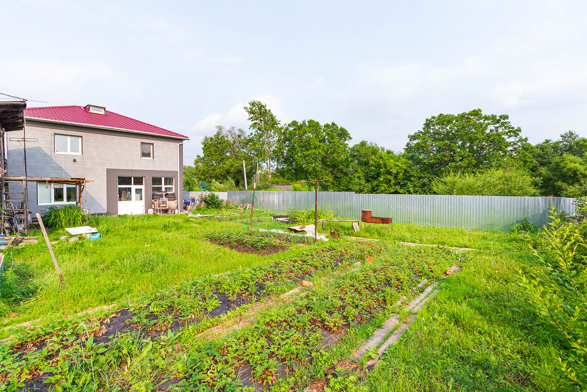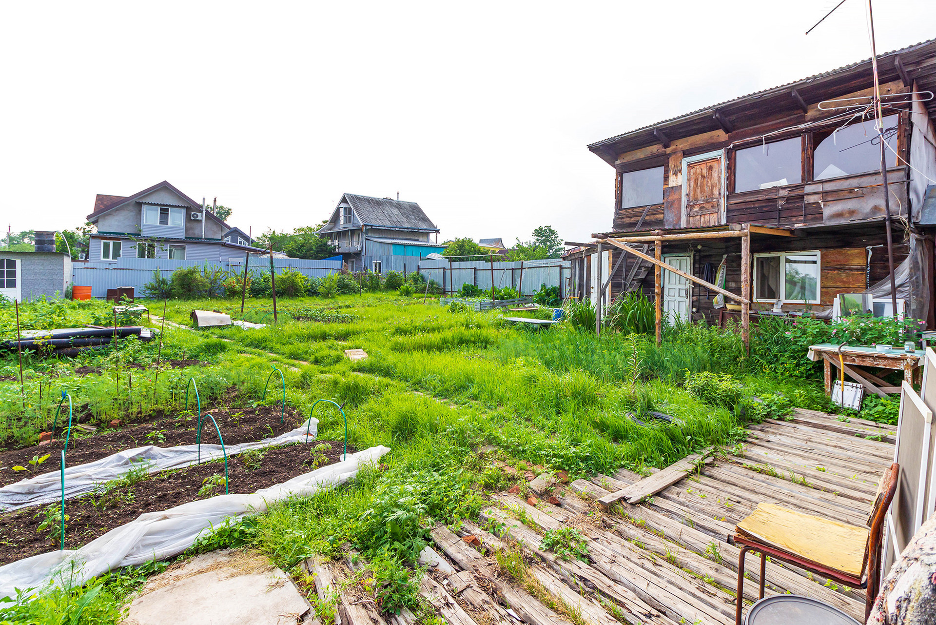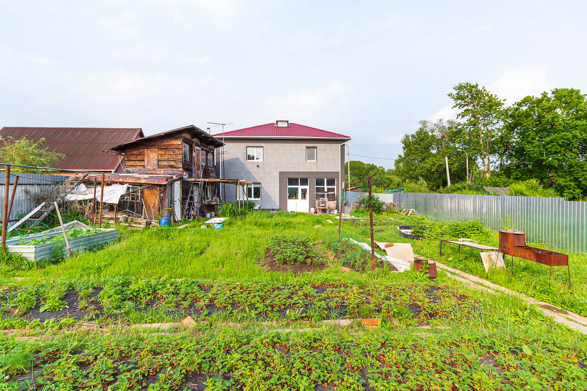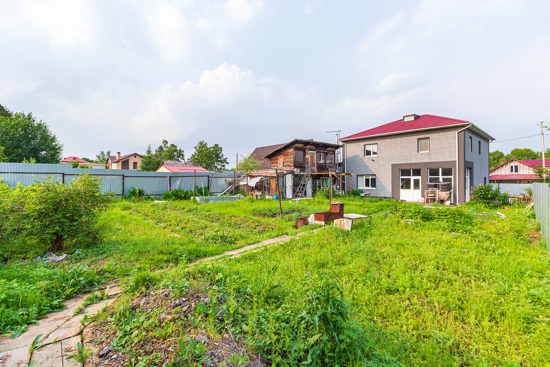 На участке расположена летняя кухня из бруса и летний душ. В план все постройки внесены, летний душ можно перестроить в баню.