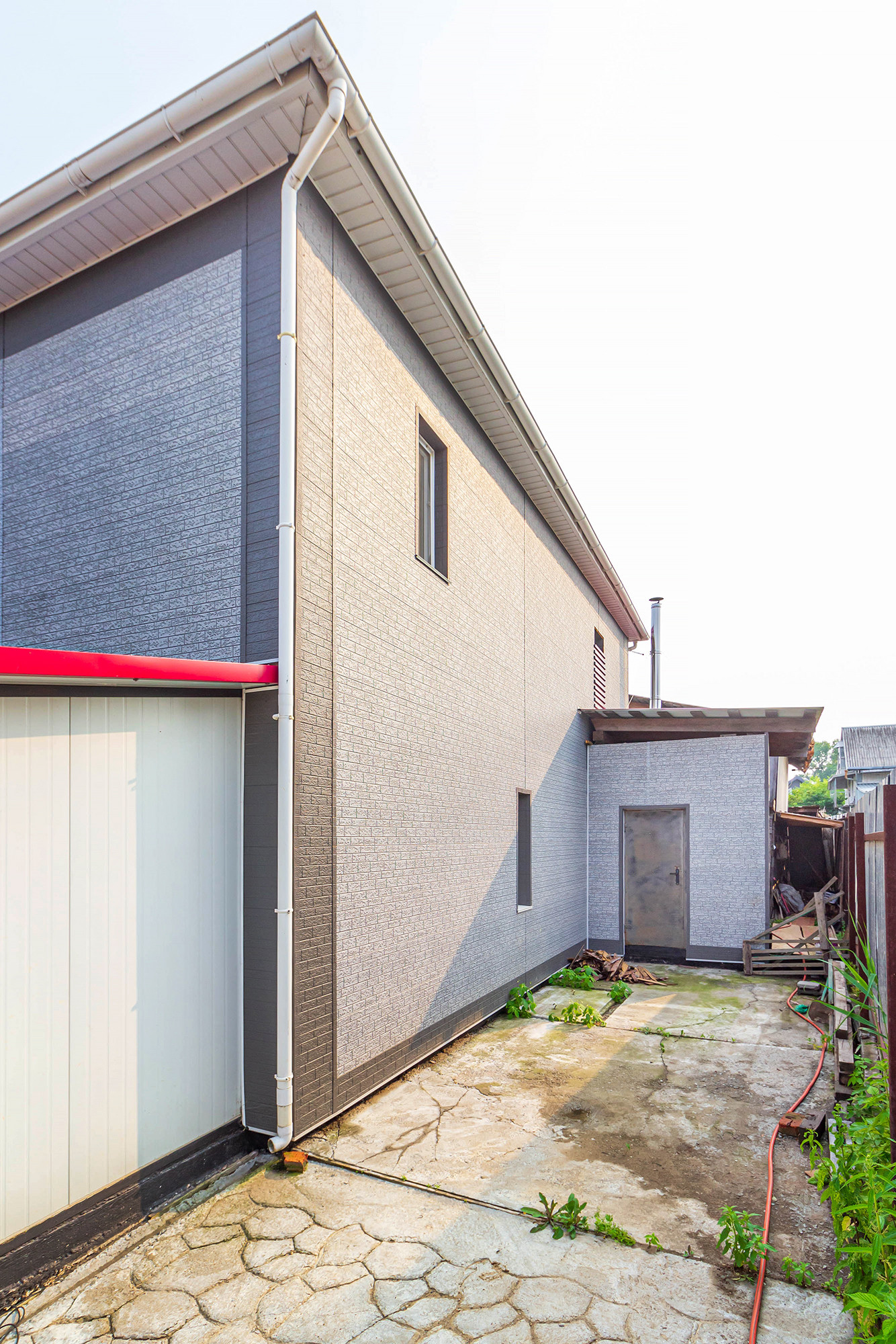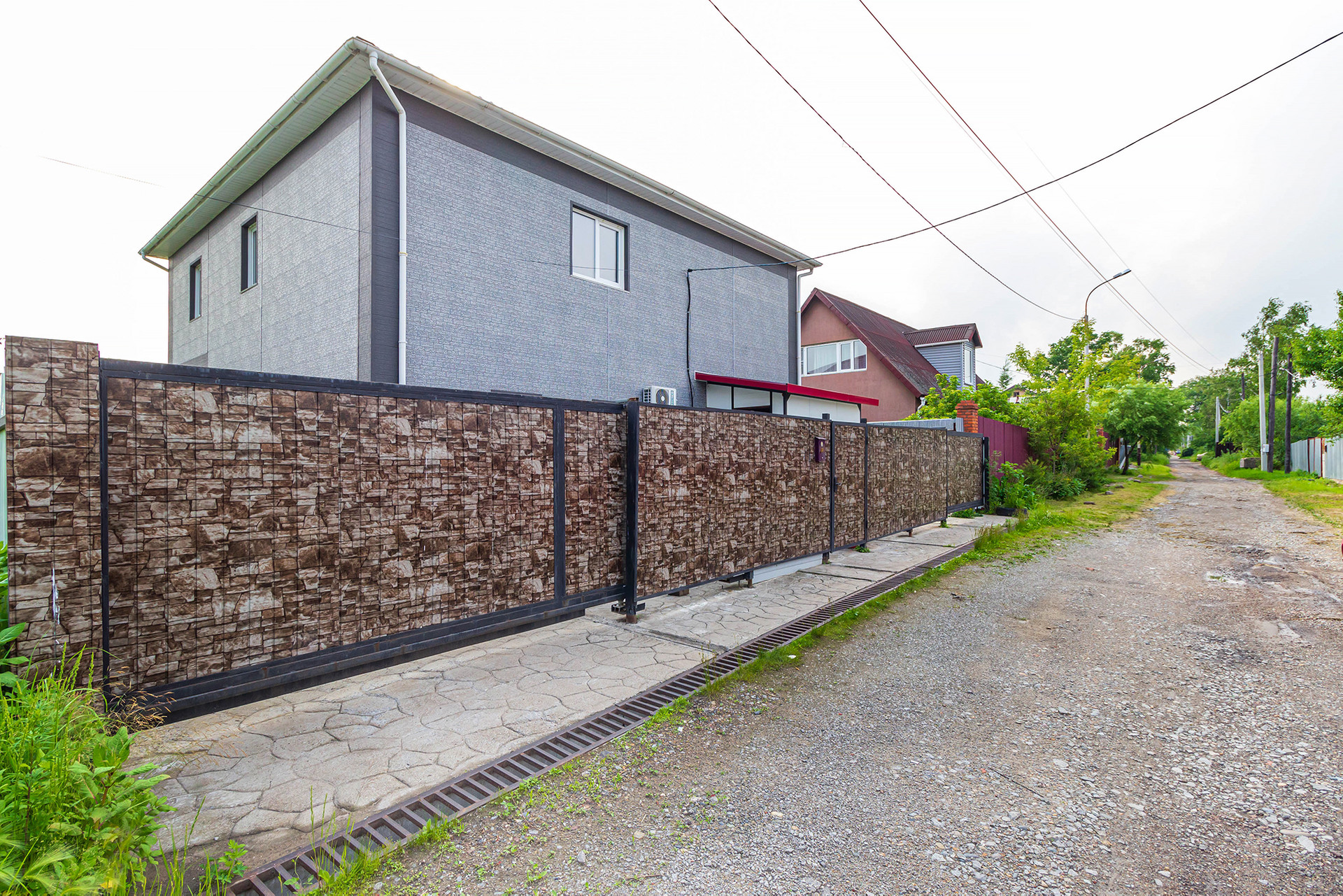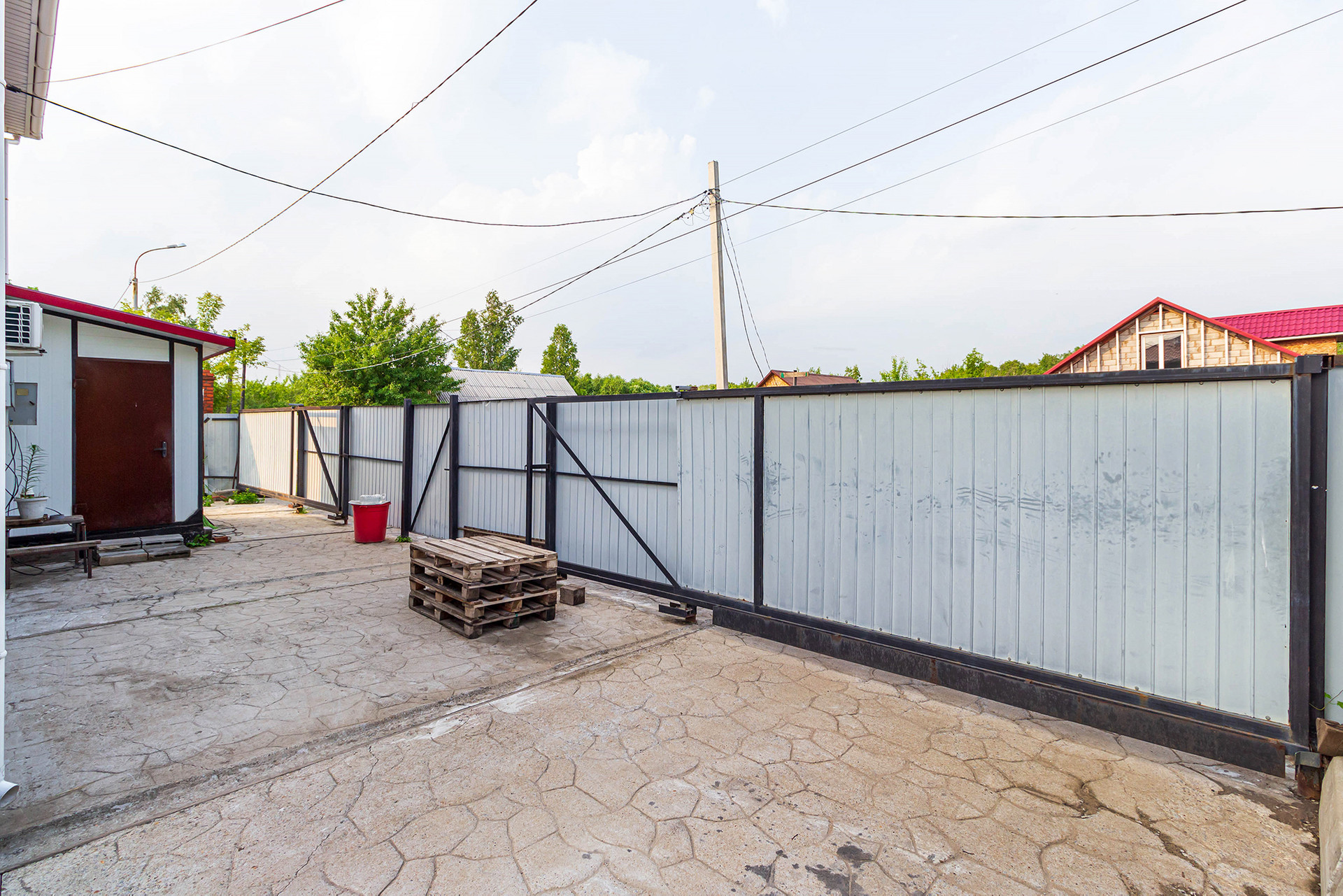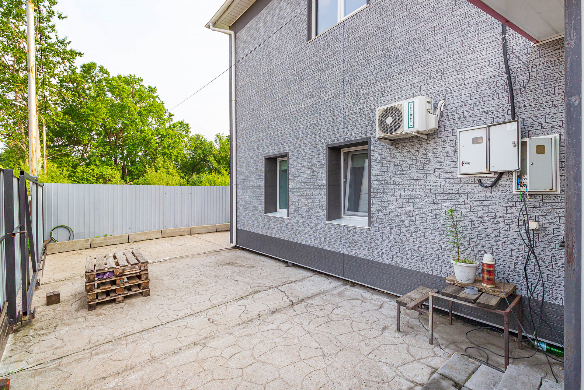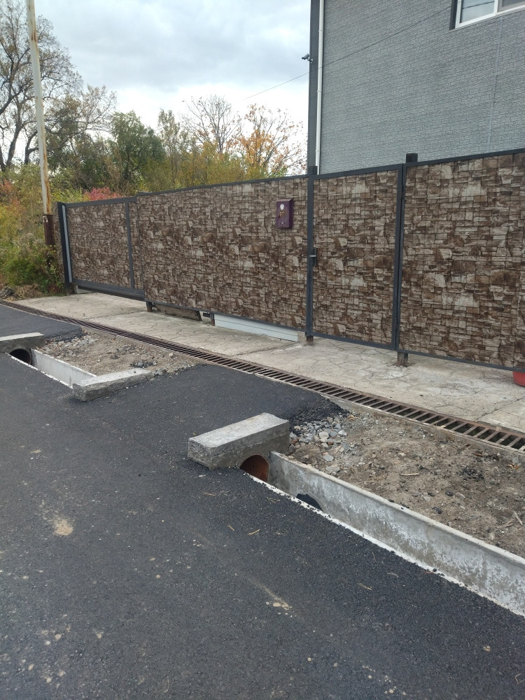 Двор полностью забетонирован, что является преимуществом перед брусчаткой. Парковка на 4 авто, двое откатных ворот