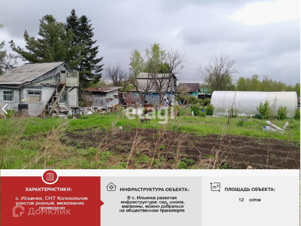 Продается земельный участок площадью 12 соток в селе Ильинка, СДТ Колокольчик. Межевание проведено, участок ровный, имеются подъездные пути, проведено электричество, столб рядом с участком. Участок находится в собственности. Земля плодородная, подходит для любых насаждений, а также для ландшафтного дизайна на любой вкус. На участке есть небольшой дачный домик и сарай.Территория, активно застраивается, грунтовая дорога проходит до участка.