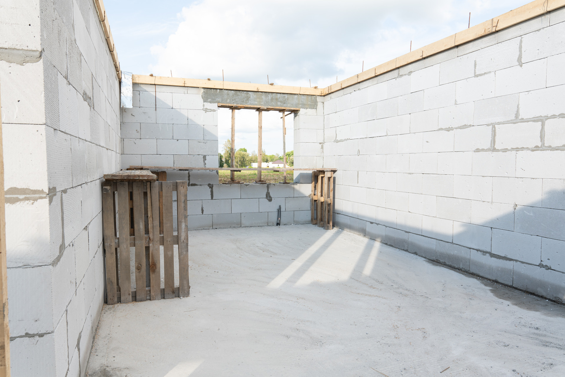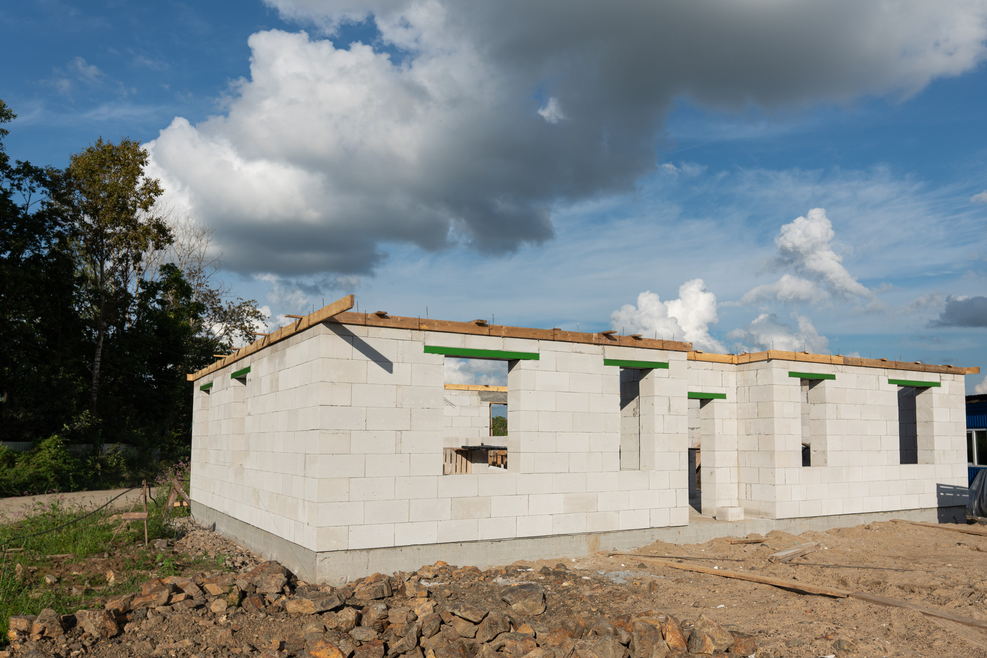 Кладка стен выполняется из газобетонных блоков 400 мм. плотностью D600! Данный вид блоков отлично зарекомендовал себя в нашем регионе за счет своих теплоизоляционных характеристик! Армирование блоков производится каждые 3 венца арматурой сечением 12мм!