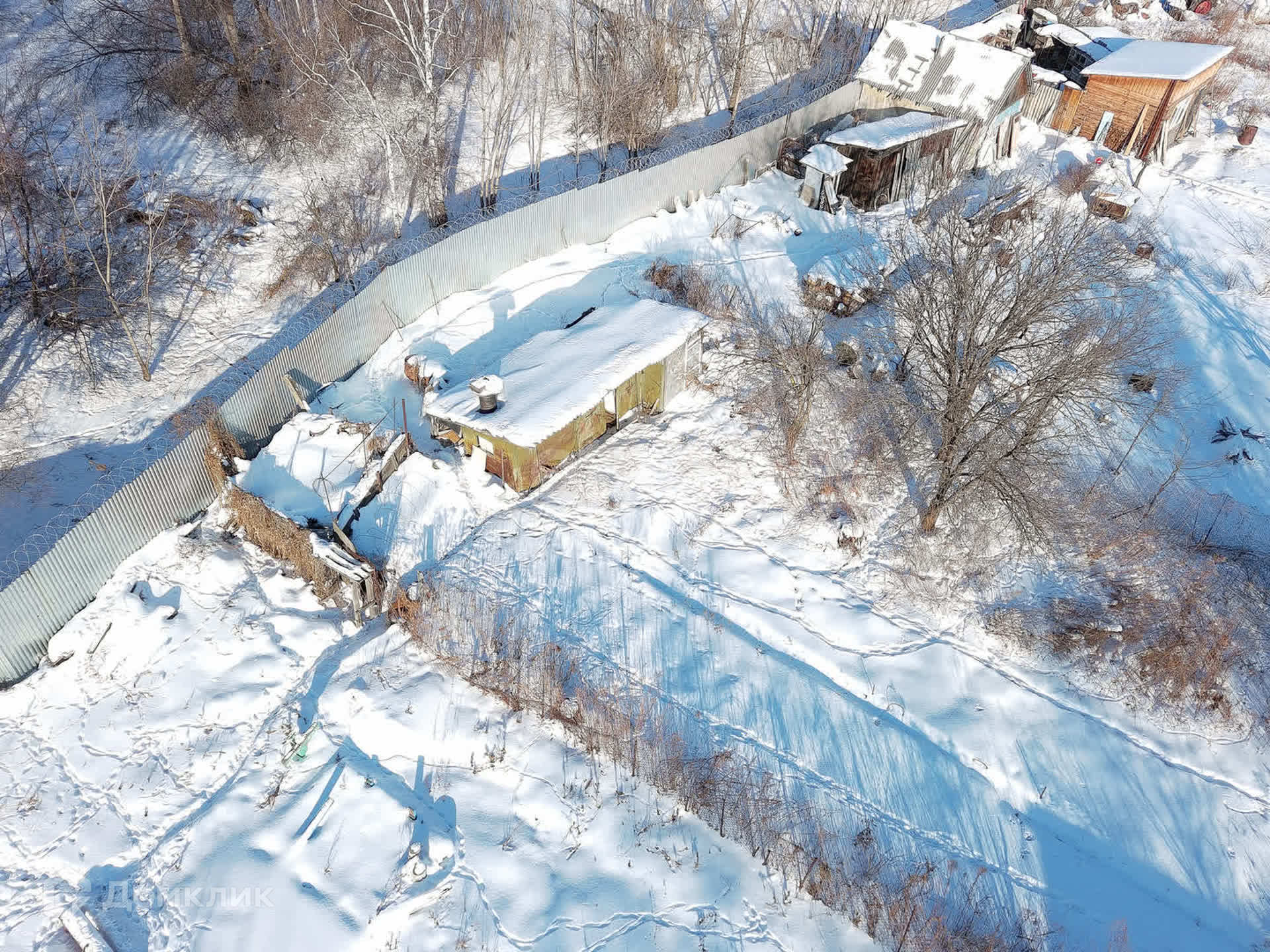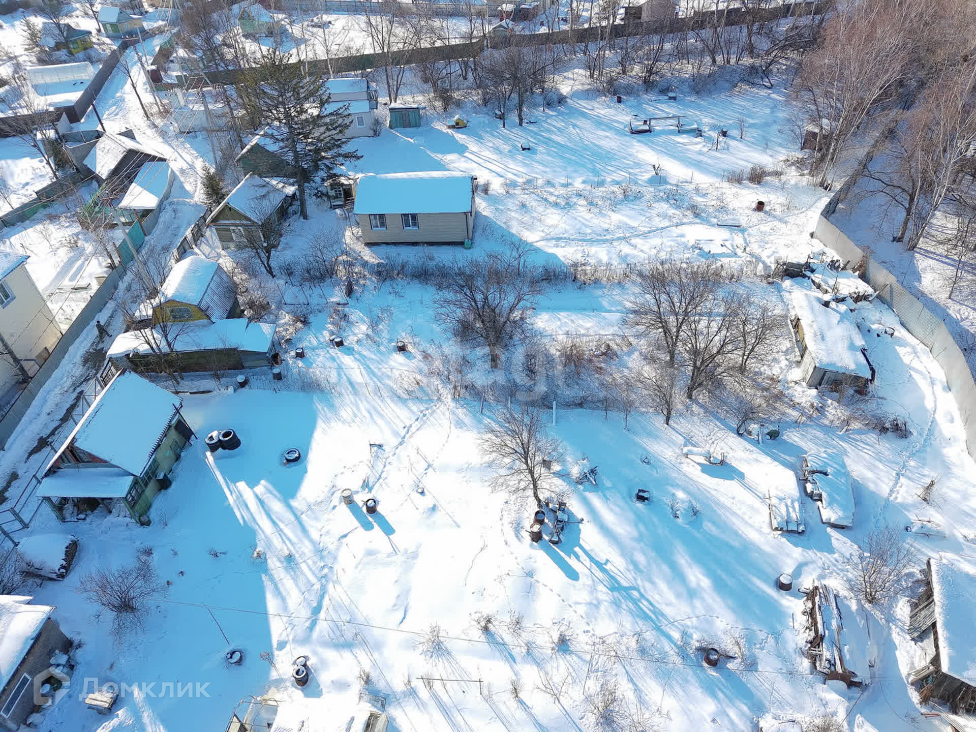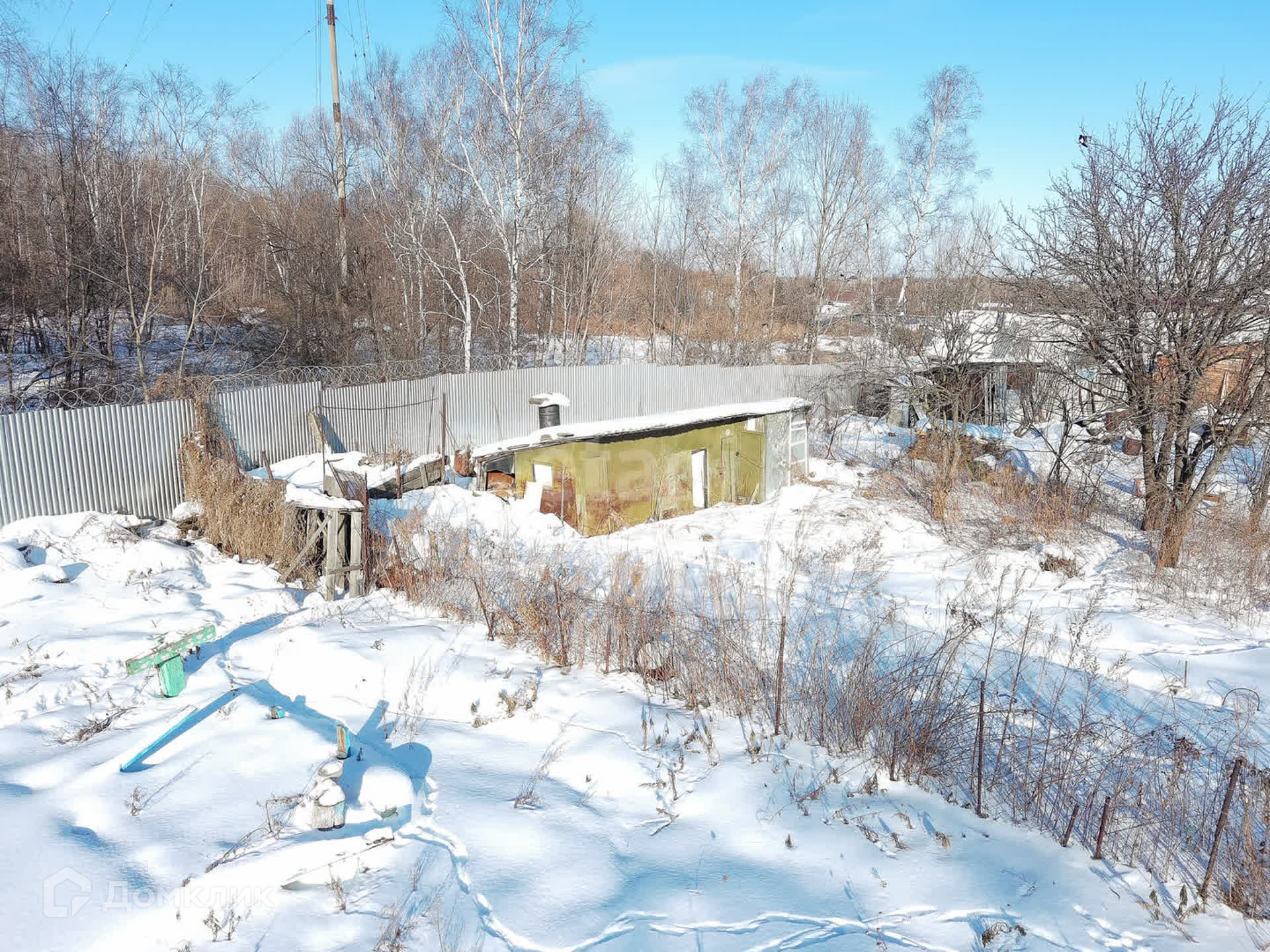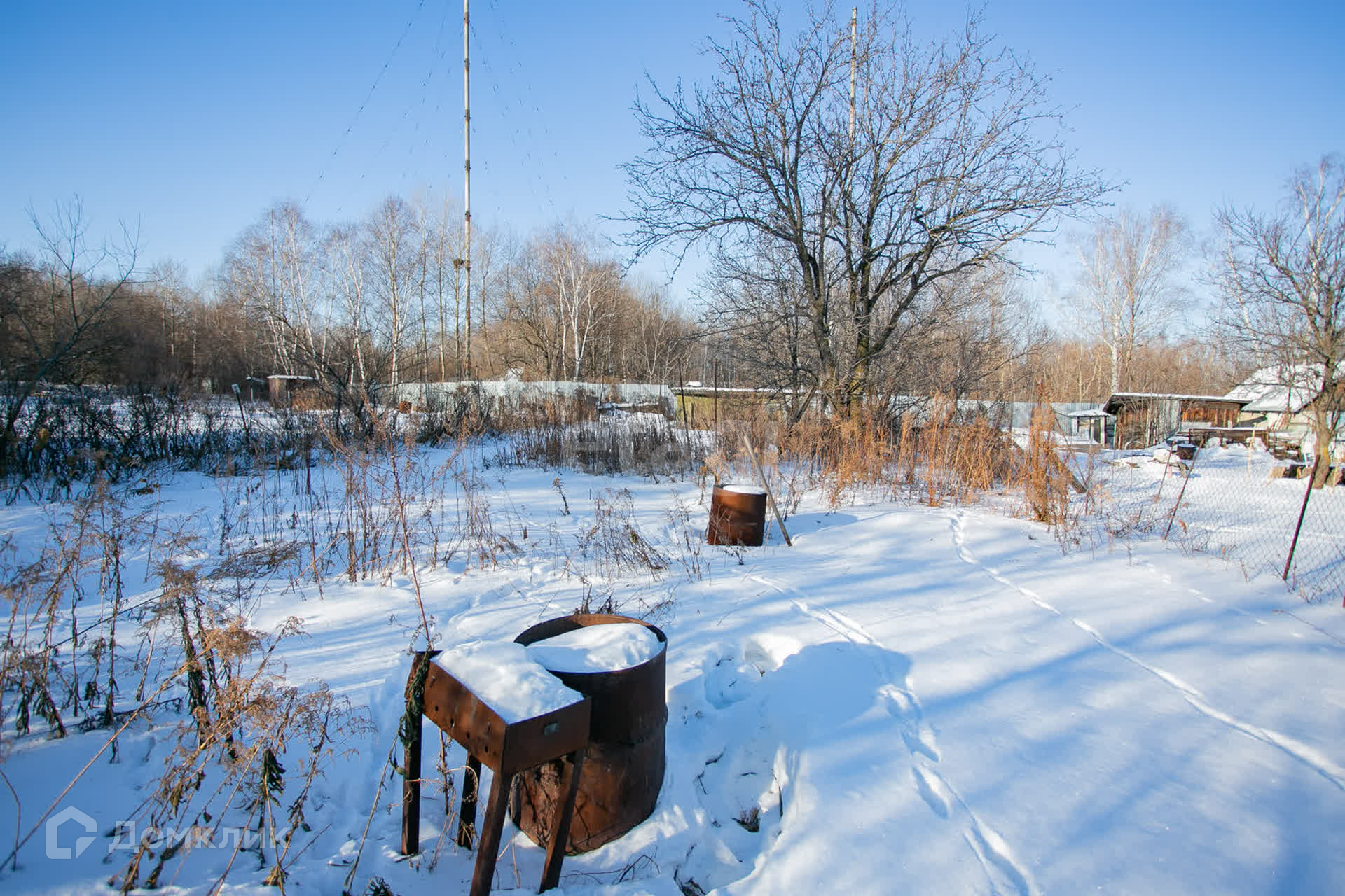 Участок огорожен сеткой рабицей, а с тыльной стороны установлен глухой забор, что обеспечивает ощущение уединения и приватности.