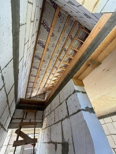 Материал стен отсевоблок, толщина 40 см., крыша - Shinglаs дорогая гибкая черепица, исключающая шум дождя.
