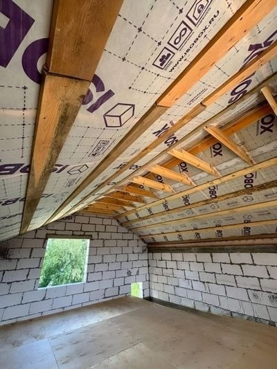 Высота потолков 2,6 и 2,8 м. Теплоизоляция крыши КNАUF, гидроизоляция АХТОN. Большое чердачное помещение.