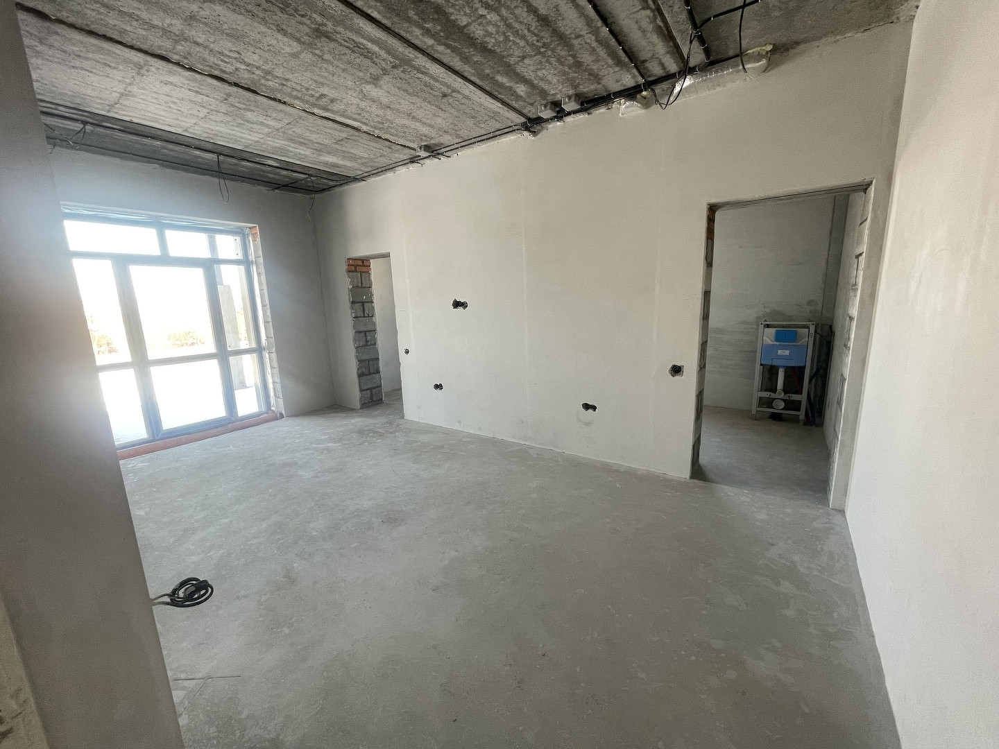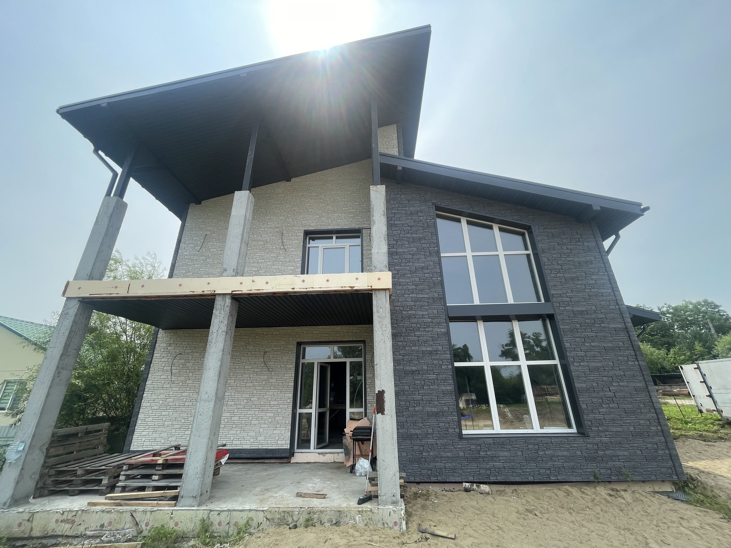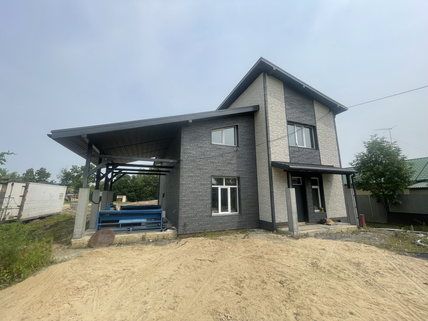 Большая кухня гостиная, в гостиной второй свет, высота потолков 6 метров, две гардеробные, на первом этаже для верхней одежды и на втором в спальне, три санузла, прачечная. Дом построен строительной компанией КИТ, стены-отсевоблок, базальтовый утеплитель на два слоя, японский фасад. Полностью готов к чистовой отделке, оштукатурены стены, разводка электрики, согласно дизайн проекту. Шамбо, скважина, отопление, все коммуникации подведены к дому.
