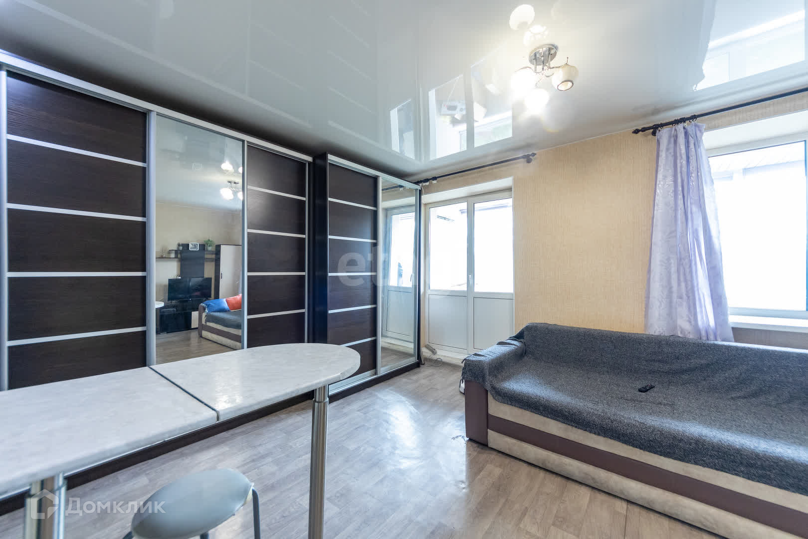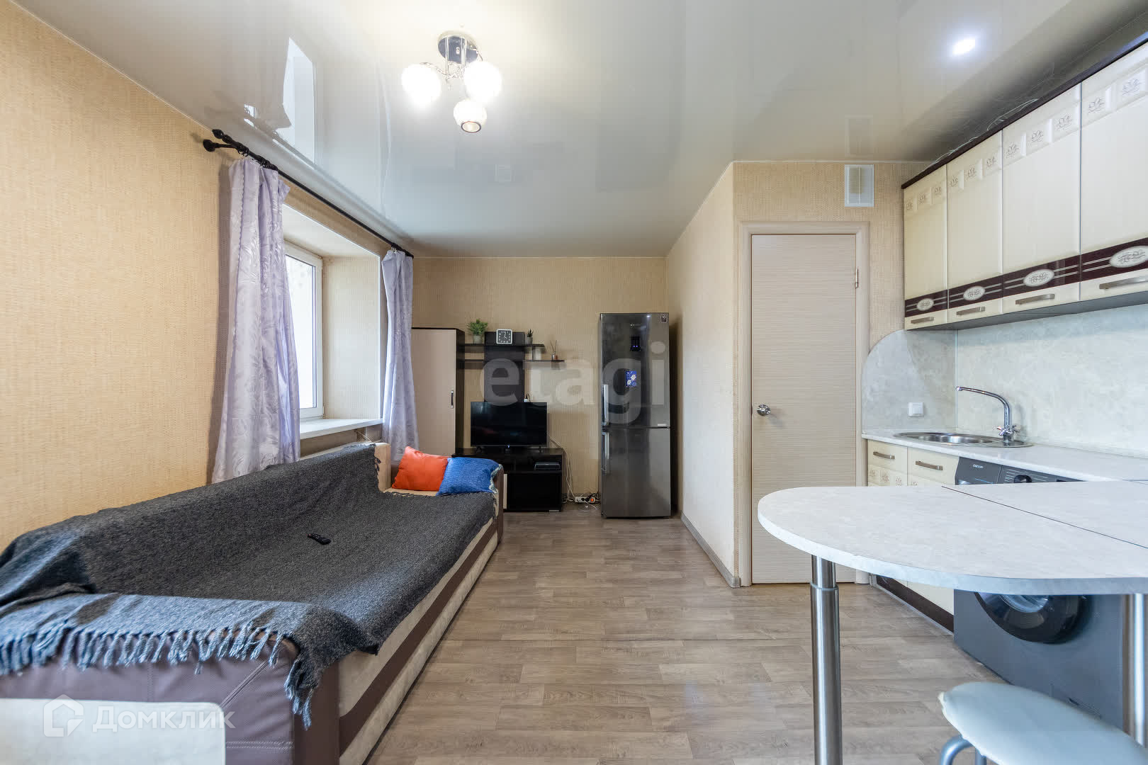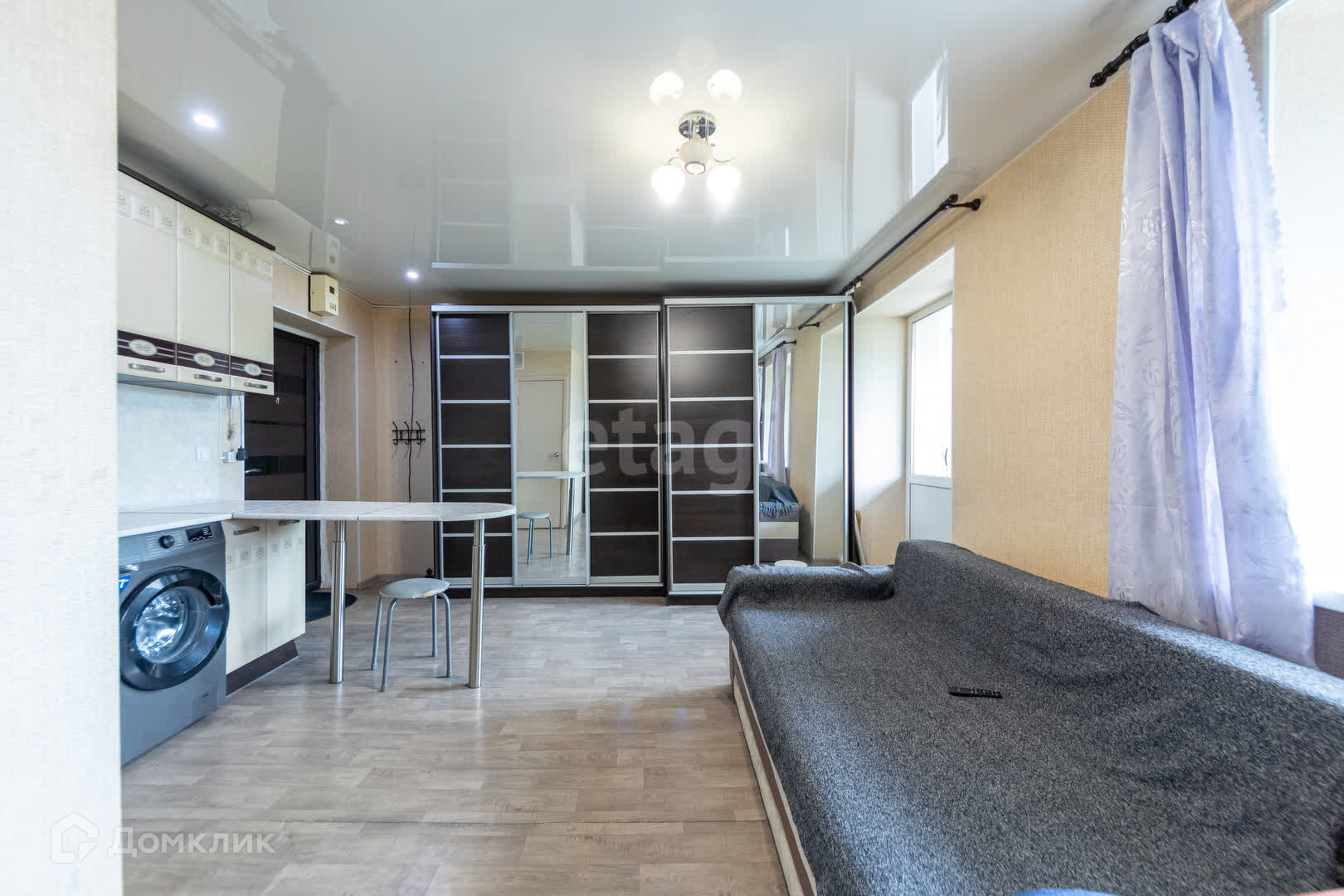 Комната очень светлая, расположена на восточной стороне, что создает уютную атмосферу и позволяет наслаждаться первыми лучами утреннего солнца. Общая площадь объекта составляет 21,7 кв.м., использовано для размещения всё необходимое: кухонная плита, совмещенный санузел, стиральная машина, удобный раскладной диван и два больших шкафа-купе.