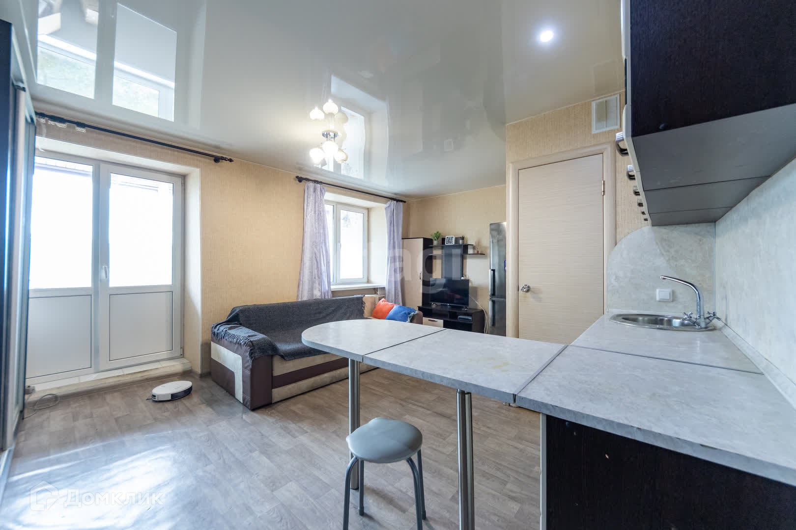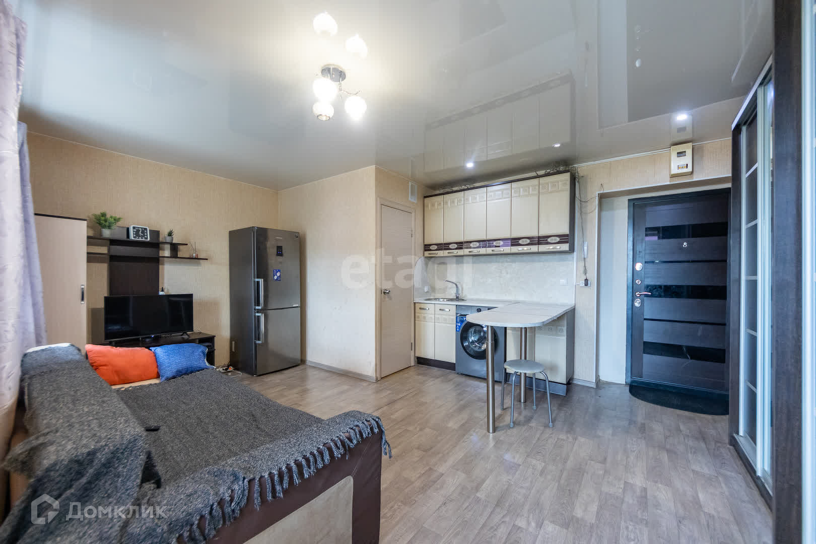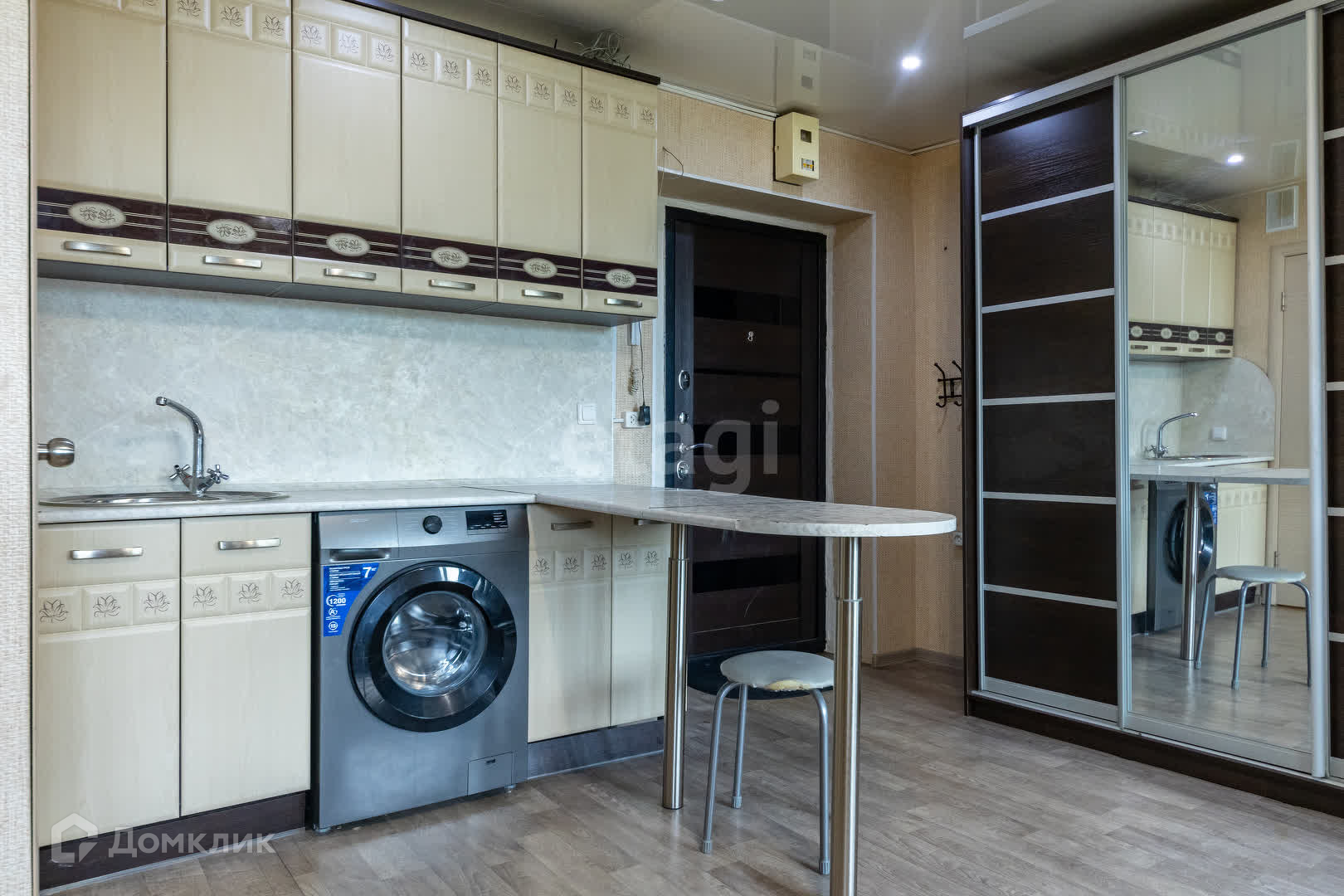 Комната очень светлая, расположена на восточной стороне, что создает уютную атмосферу и позволяет наслаждаться первыми лучами утреннего солнца. Общая площадь объекта составляет 21,7 кв.м., использовано для размещения всё необходимое: кухонная плита, совмещенный санузел, стиральная машина, удобный раскладной диван и два больших шкафа-купе.