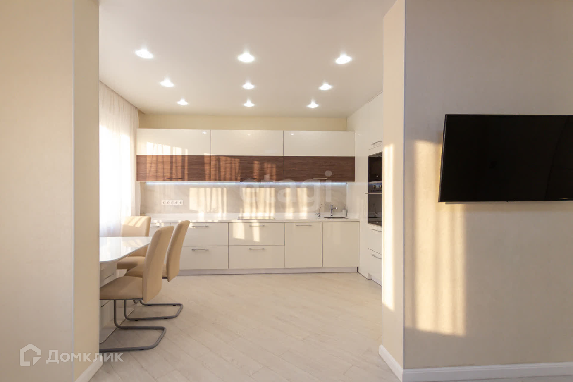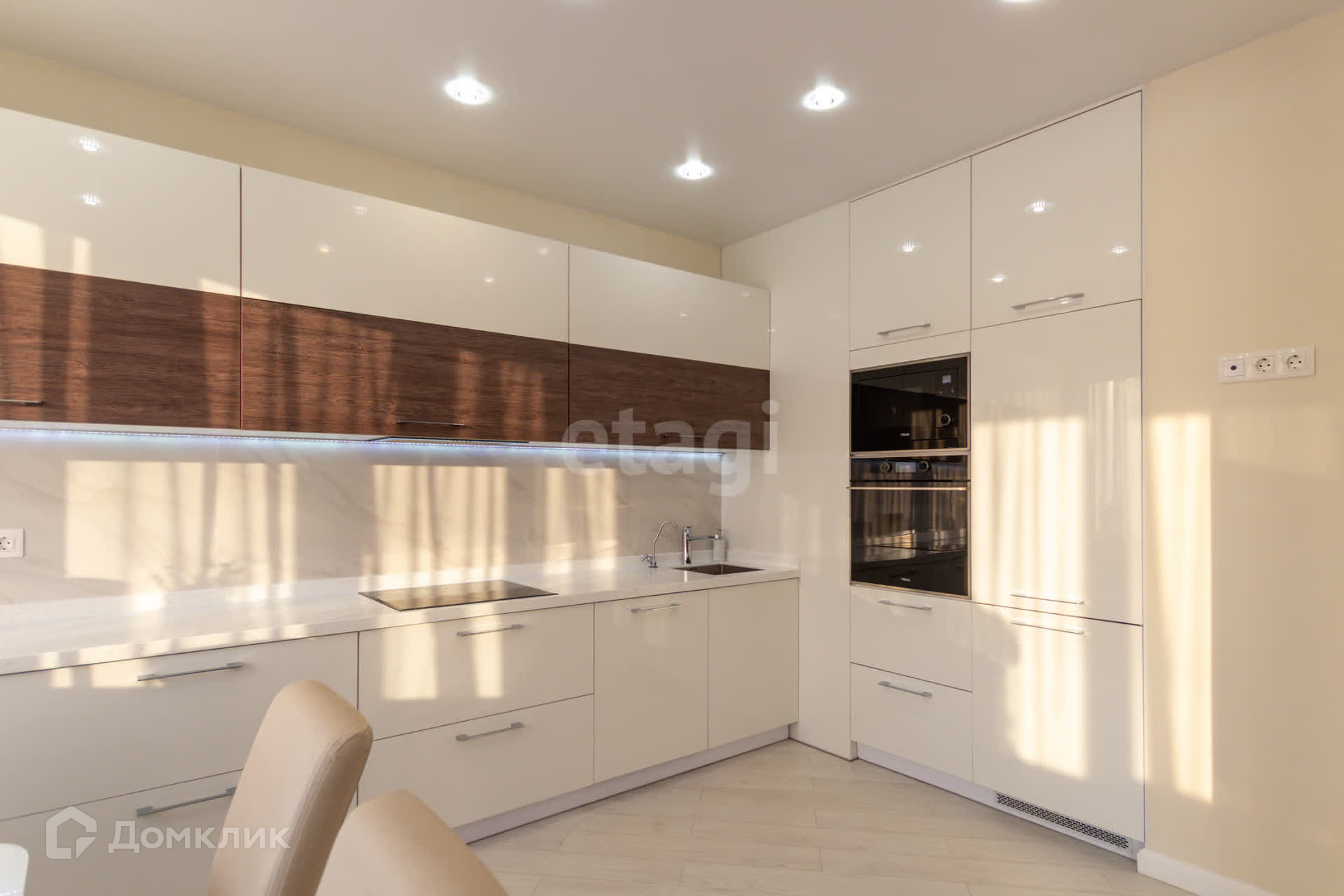 Встроенный кухонный гарнитур, сделанный под заказ оборудован новой дорогой бытовой техникой и имеет стильный дизайн.