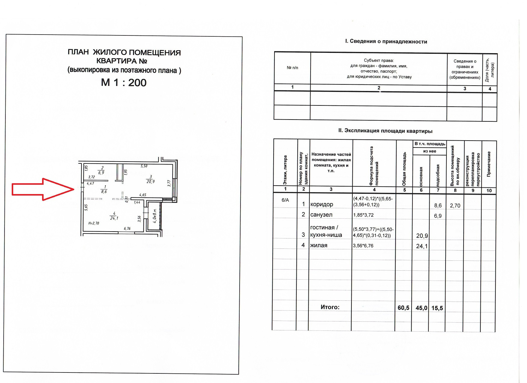 + общая площадь составляет 60,5 кв.м., из них кухня-гостиная 20,9 кв.м., комната 24,1 кв.м. (см.фото тех плана);