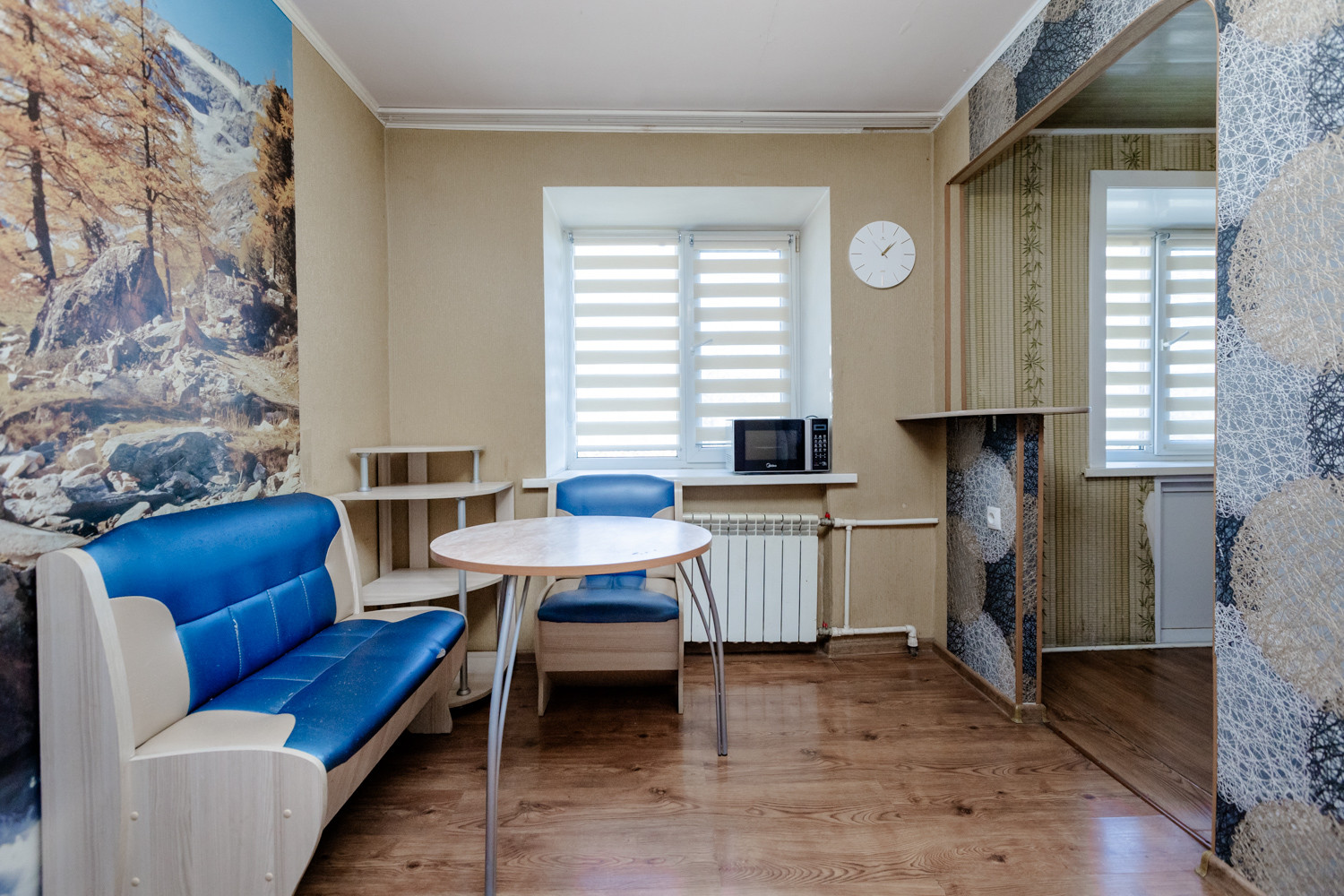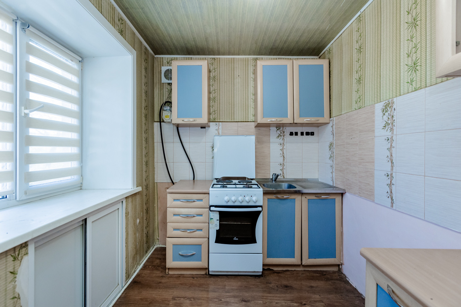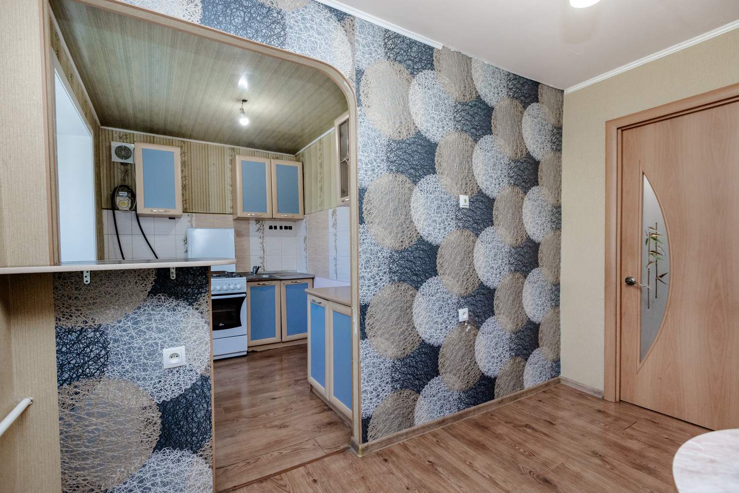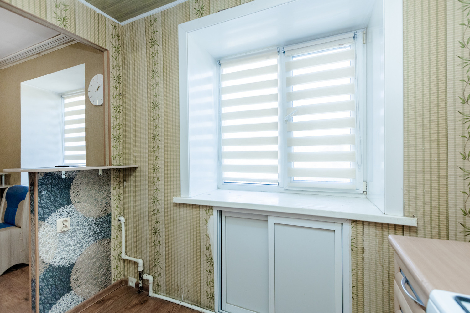 -Кухня - гостиная ,с двумя окнами , зоной готовки, барной стойкой.