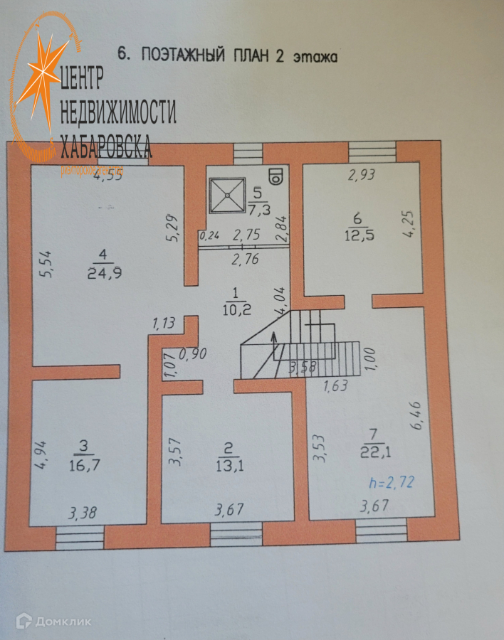 На втором этаже 5 жилых комнат 24,9/16,7/13,1/12,5/22,1 кв.м, там же расположена ванная комната 7,3 кв.м . Высота потолков 2,72 м.