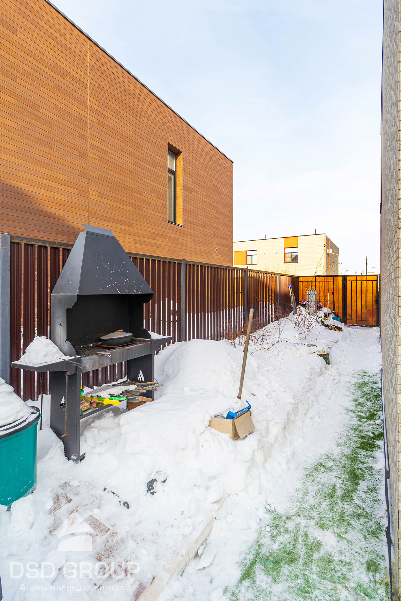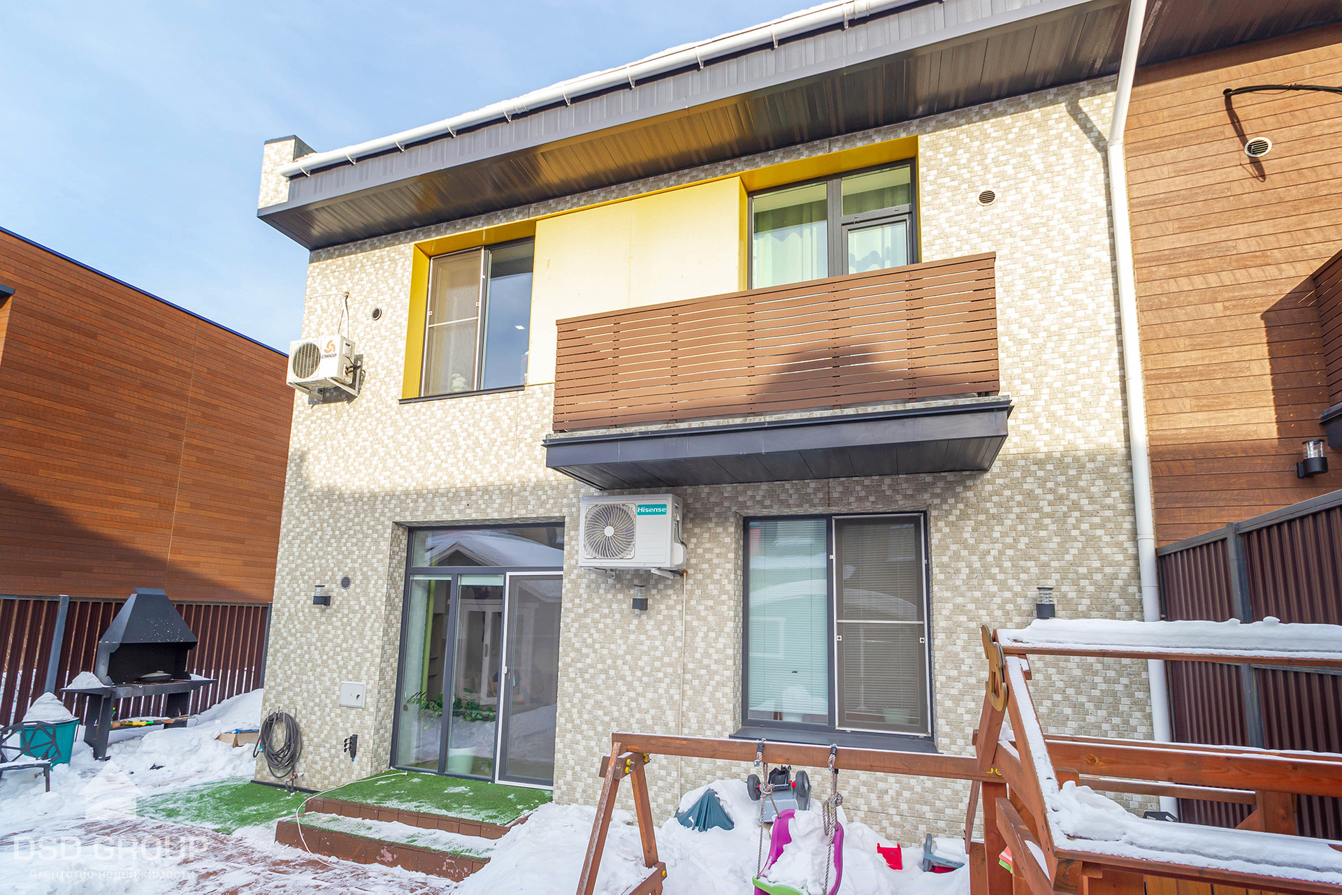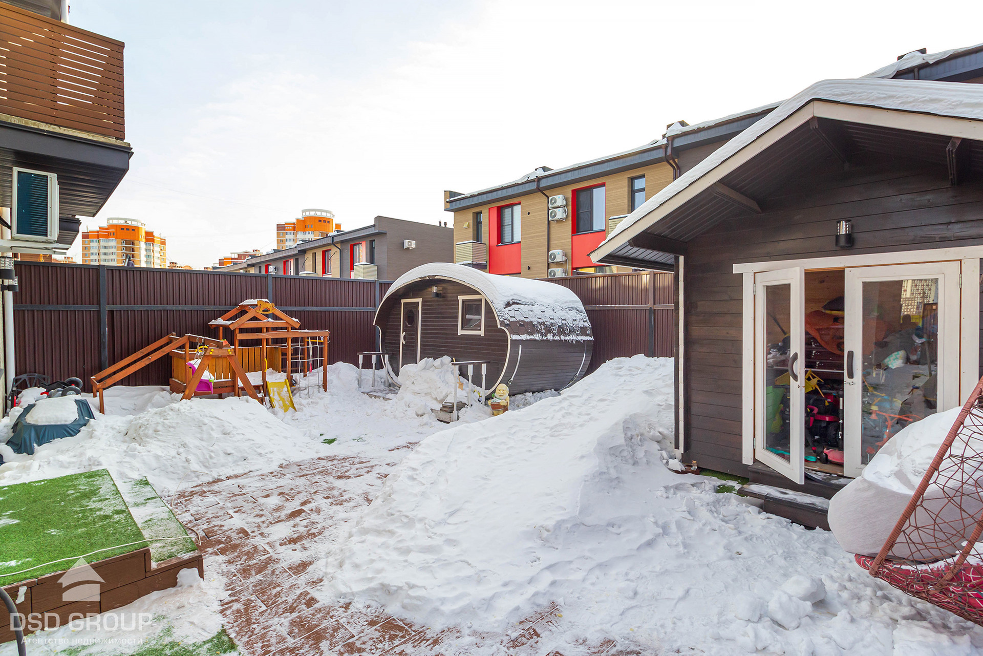 На заднем дворе есть баня, беседка, детская игровая зона.