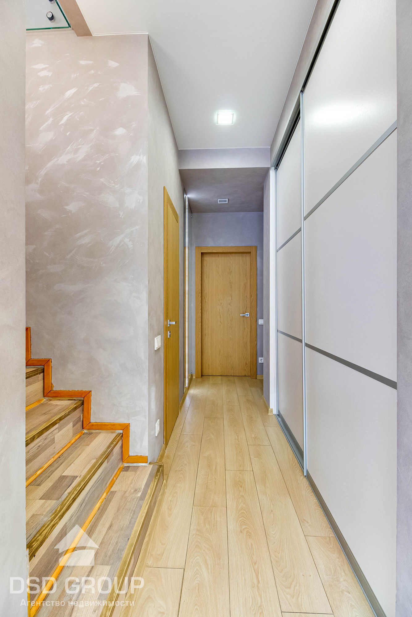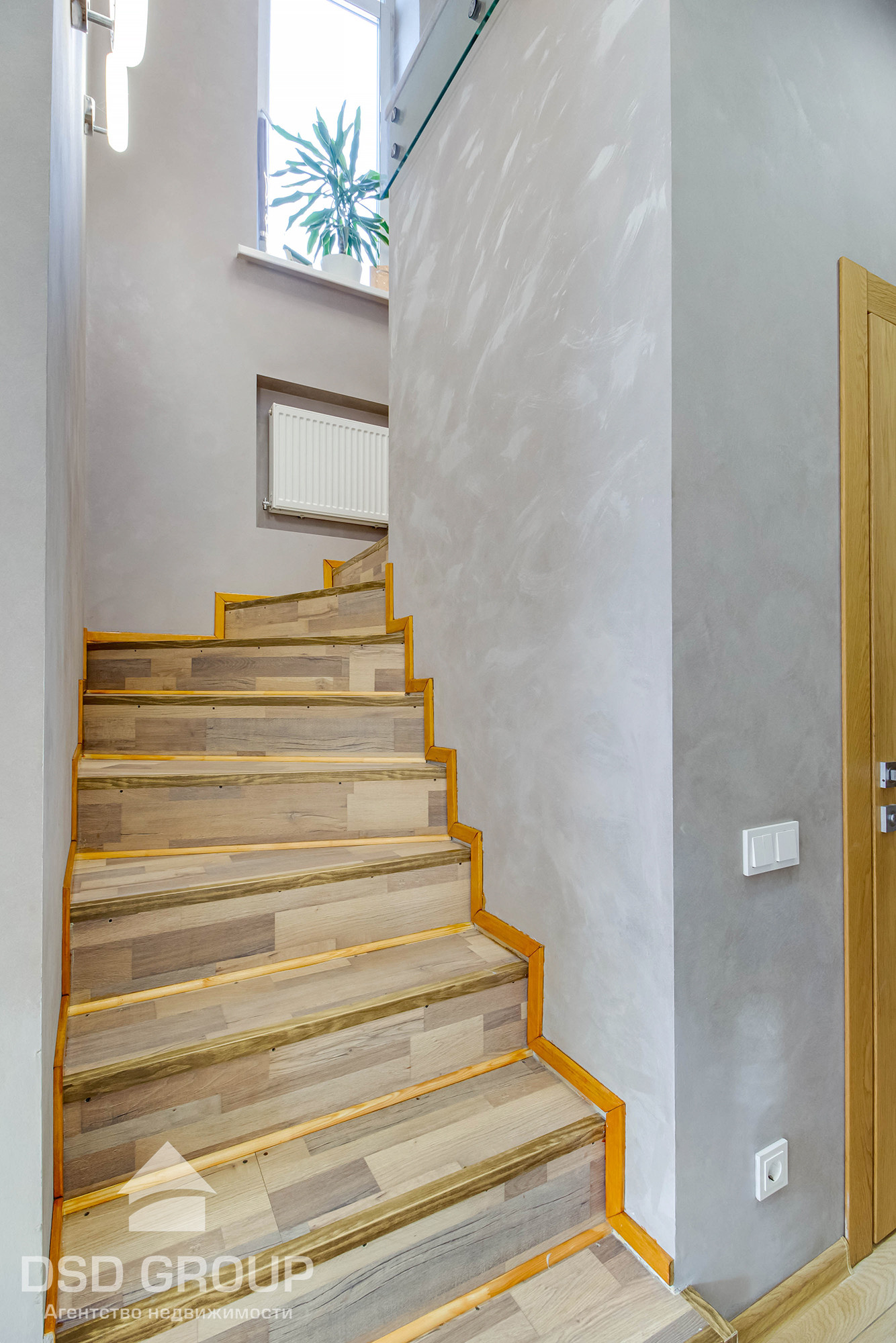 На полу ламинат, стены -покраска и декоративная штукатурка, санузлы-керамогранит.