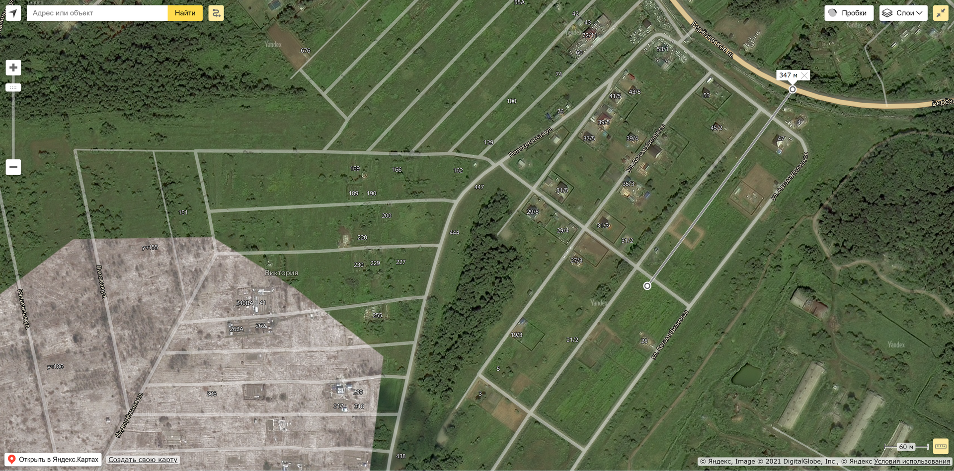 Участок расположен очень удобно, не сильно близко к главной трассе (350 метров), что исключает шум машин, и не сильно далеко, что позволяет дойти до остановки пешком всего за 5 минут (450 метров). Постоянно ходит 46 автобус в обе