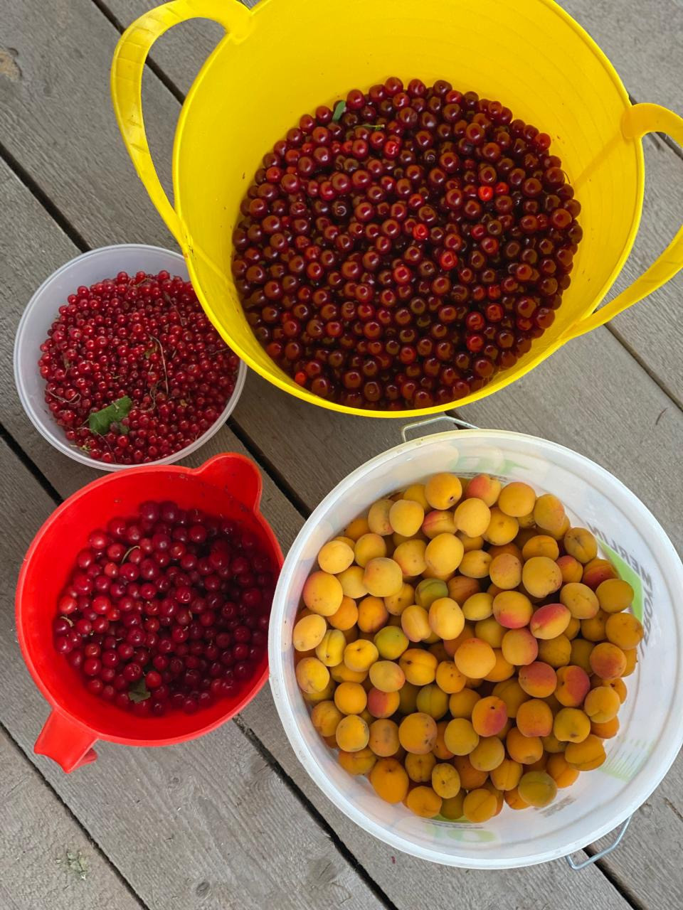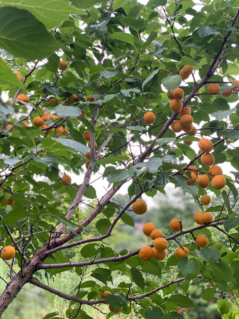Пять деревьев абрикосов, 3 дерева шелковицы, груша, много вишни, черевишни, различной малины и смородины, рябина, лимонник, жимолость, красивейший виноград в различных локациях и многое другое.