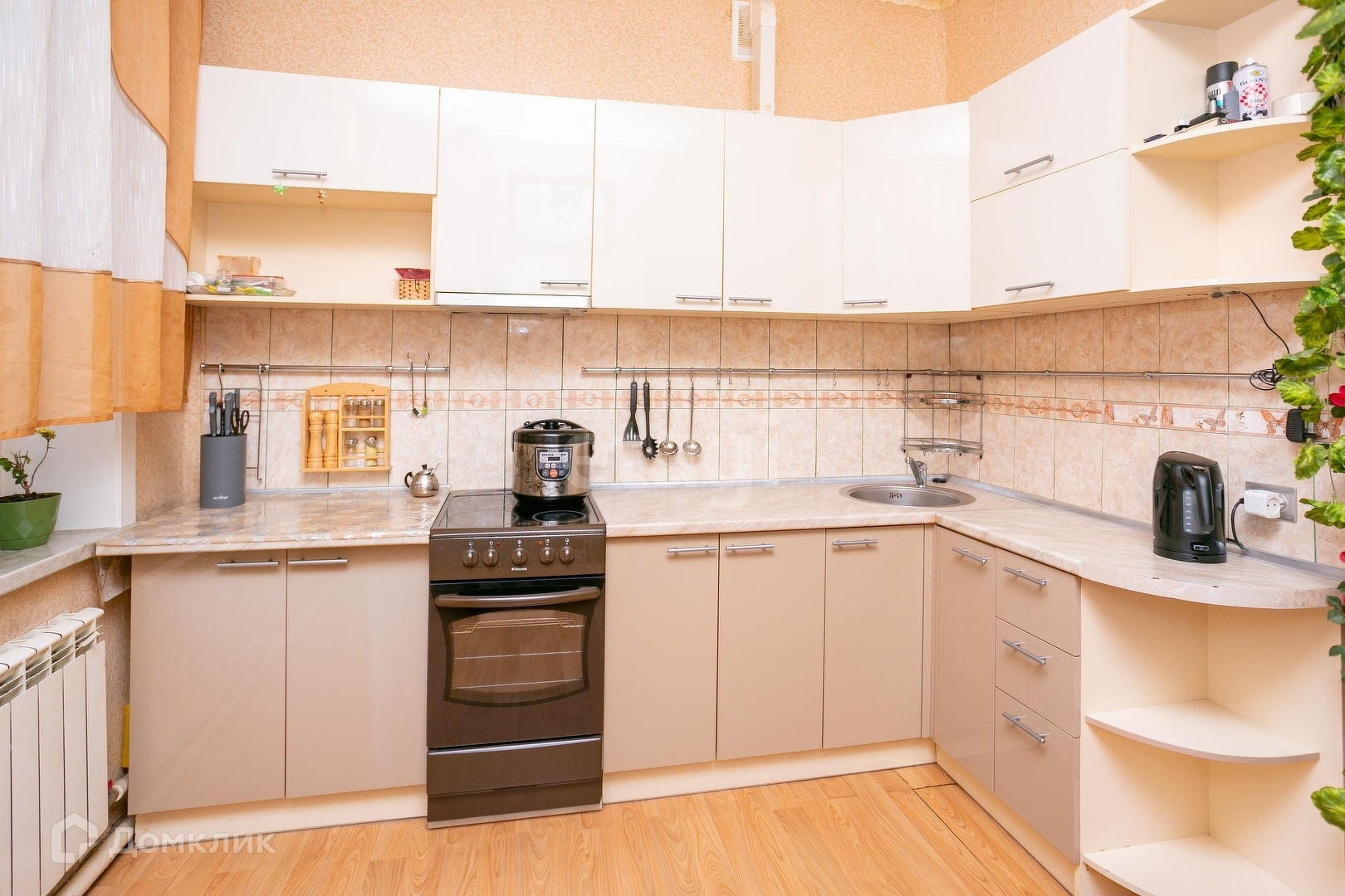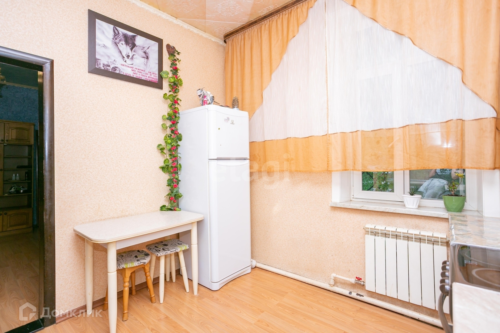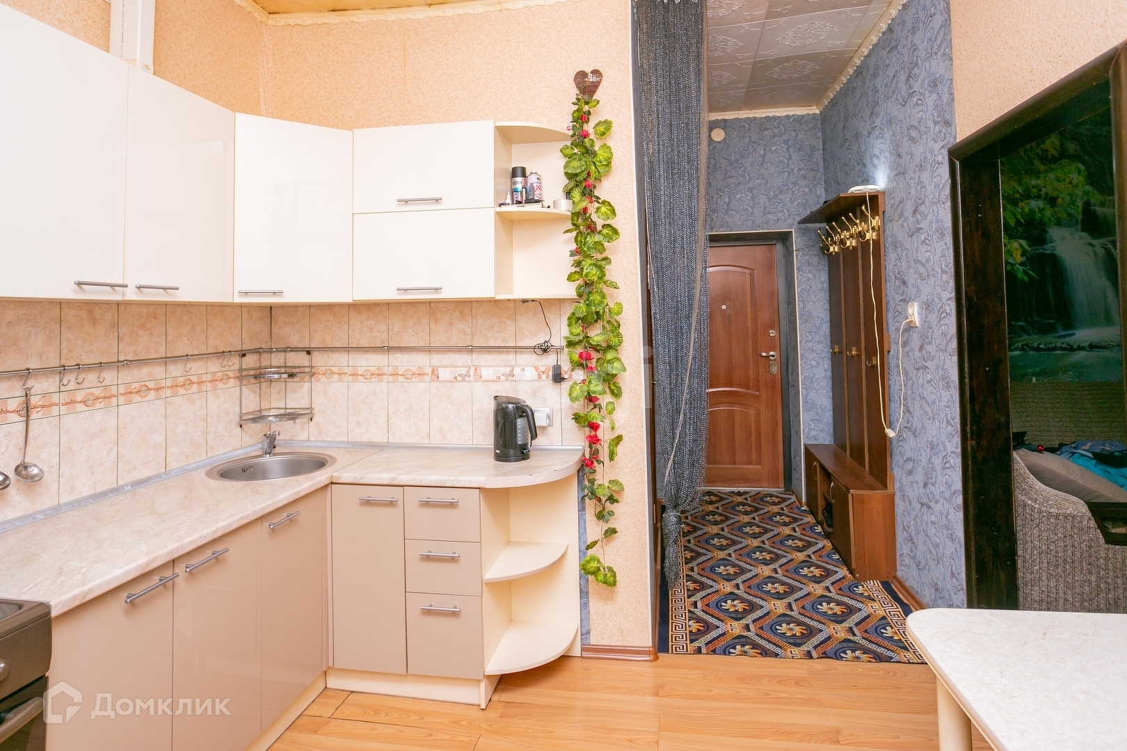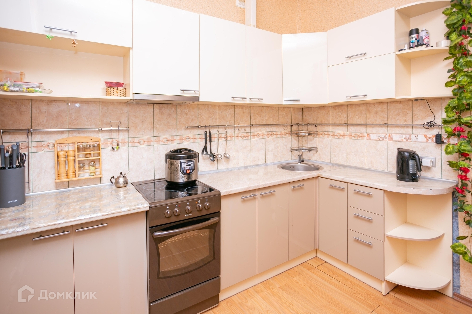 В квартире есть всё необходмиое для комфортного проживания: диван, кресло, кухонный гарнитур, стиральная машина, холодильник, чайник, шкаф.