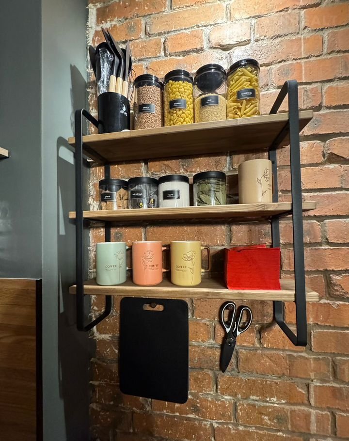 В кухонной зоне капсулы для кофемашины, чай, крупы, специи.