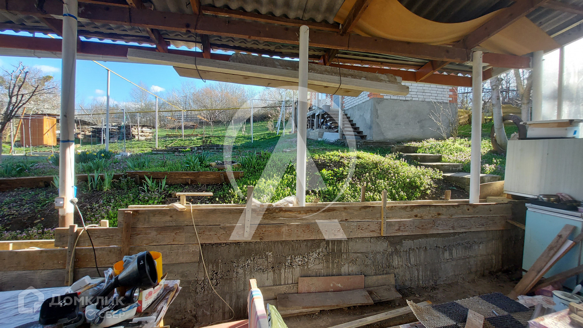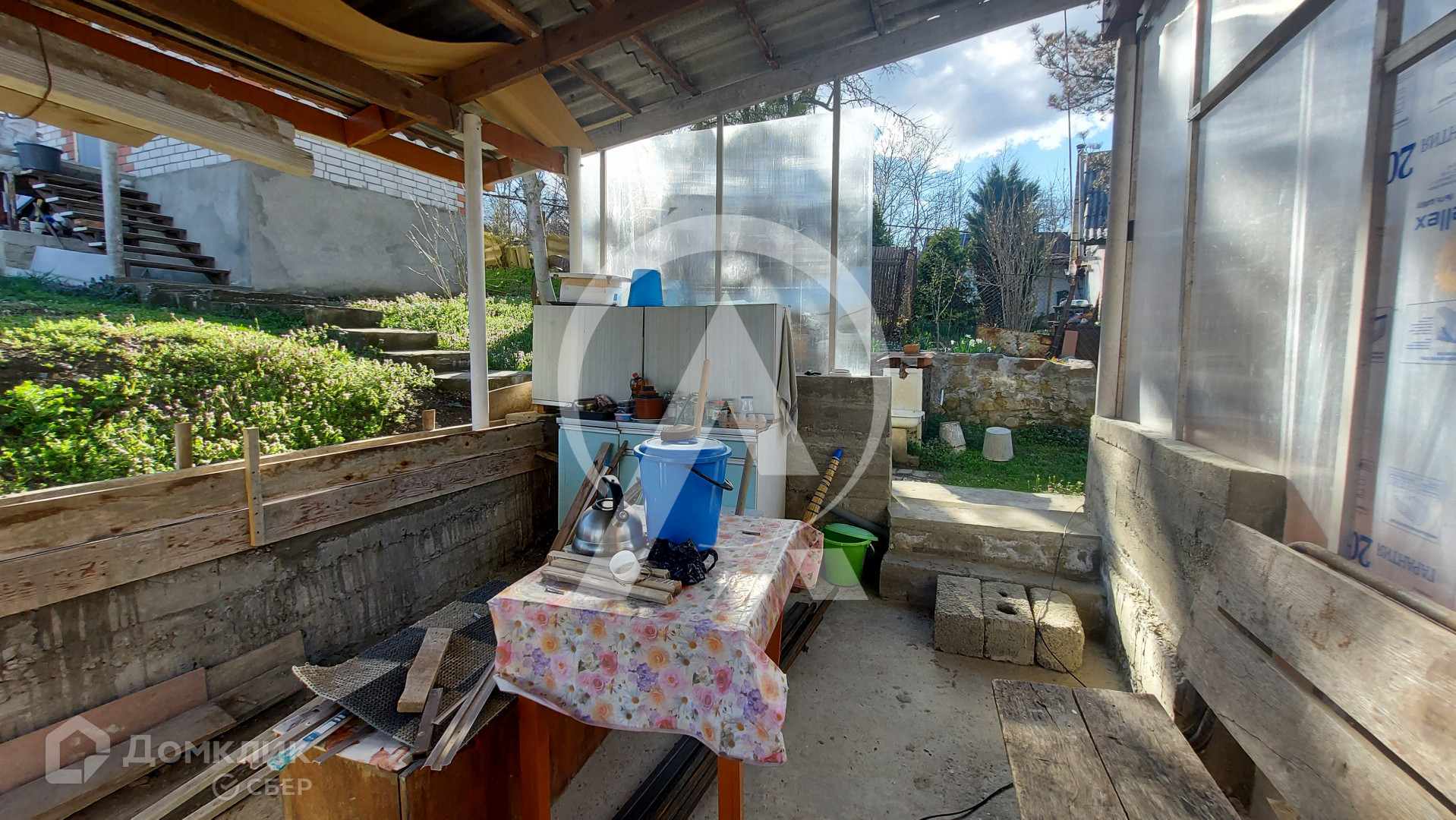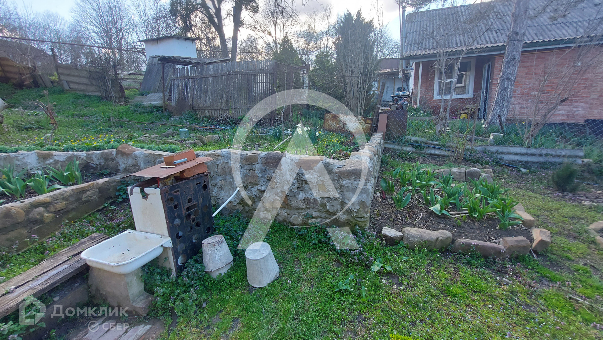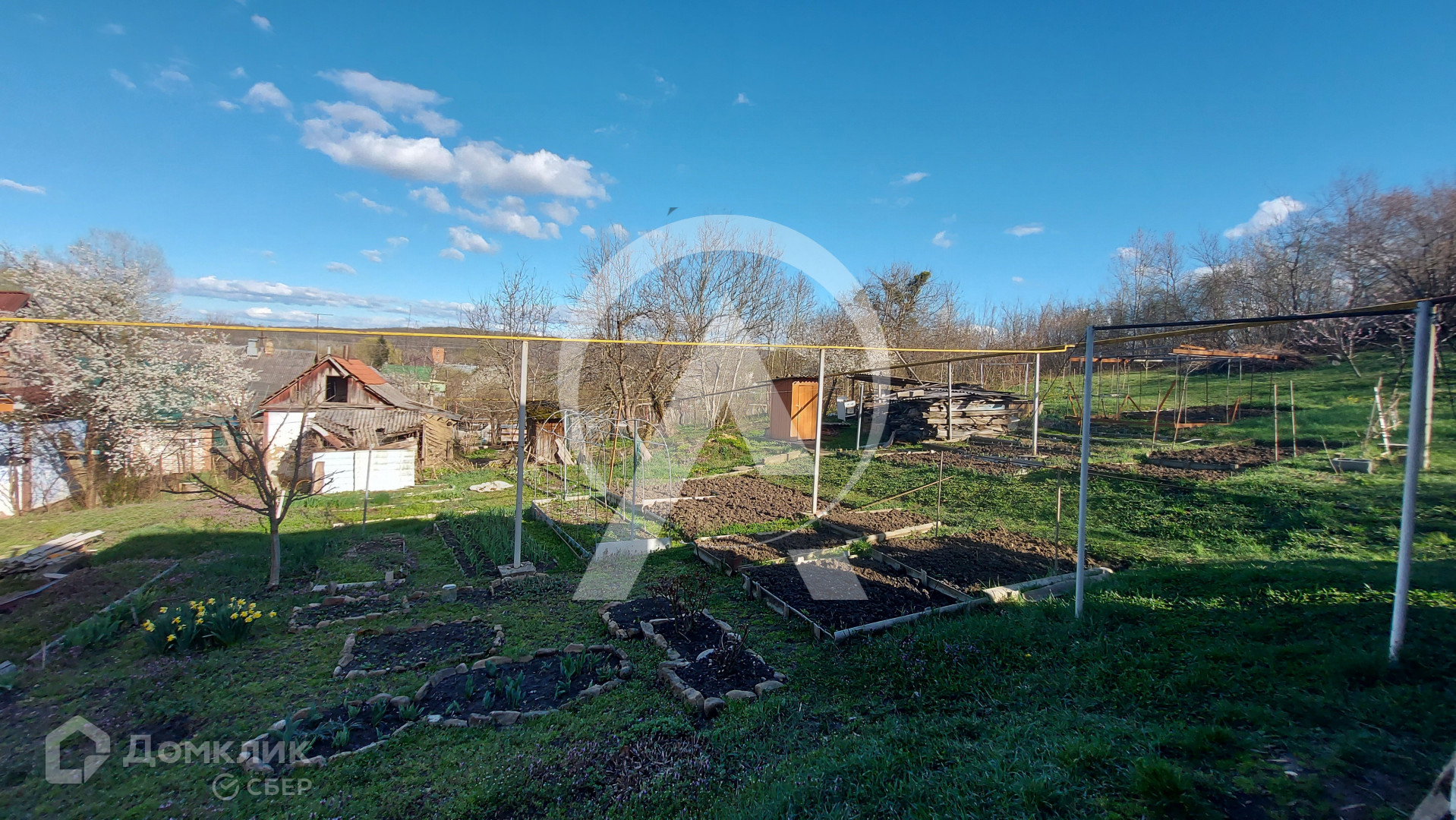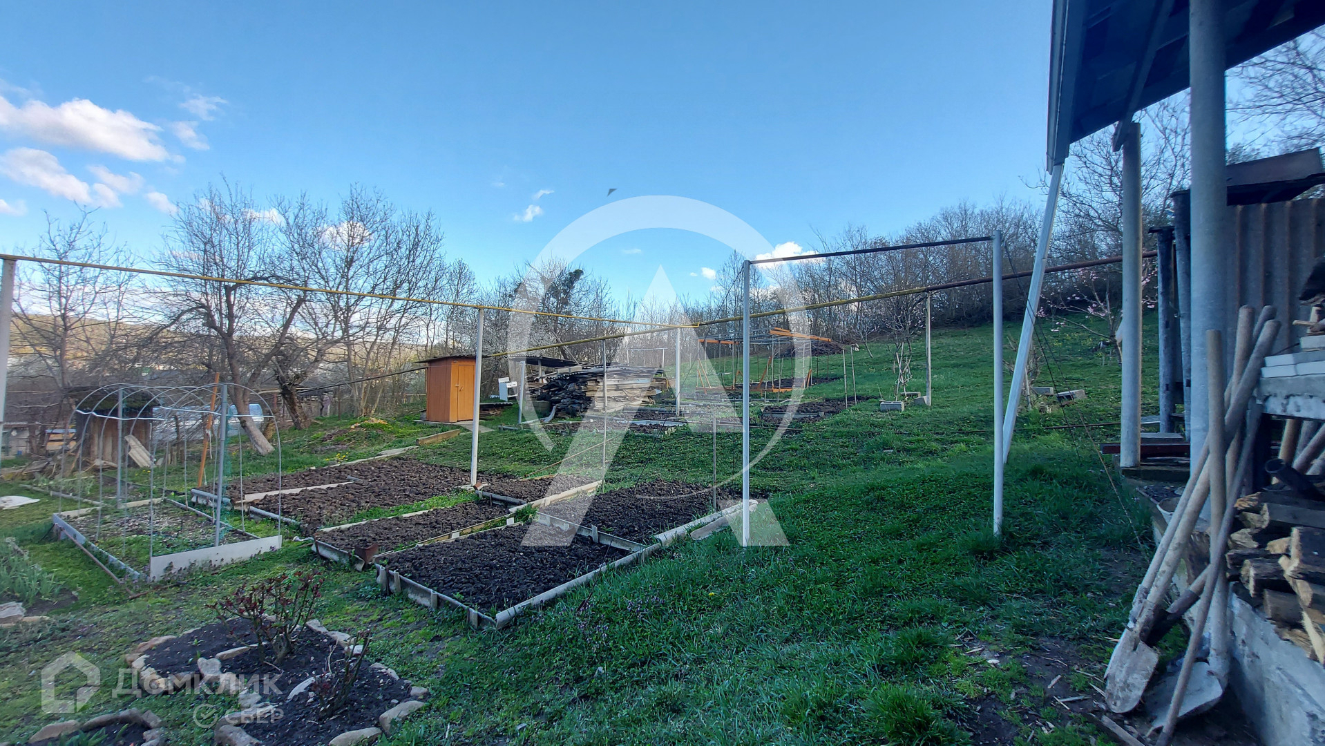 Огород , теплица, плодоносящий молодой сад на котором растут: яблони, орехи, груши, сливы, вишня, инжир, ежевика, крыжовник, виноград, малина, смородина. Имеется колодец с насосом для полива сада и огорода.