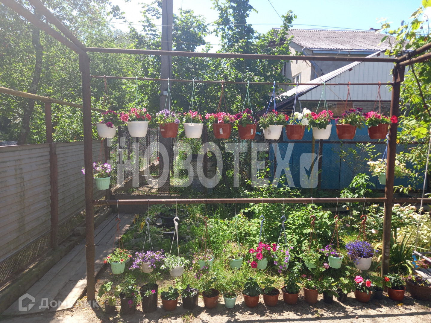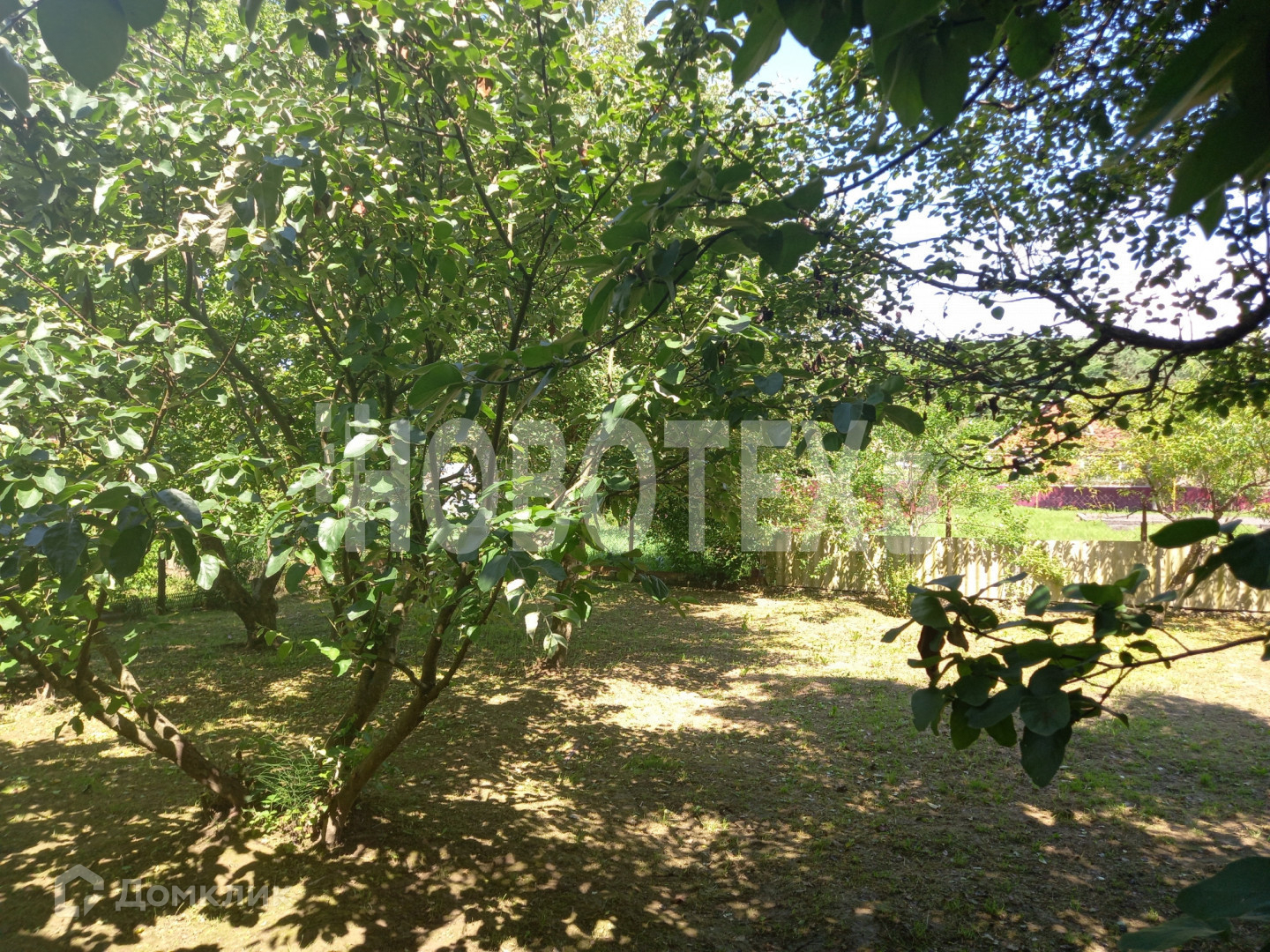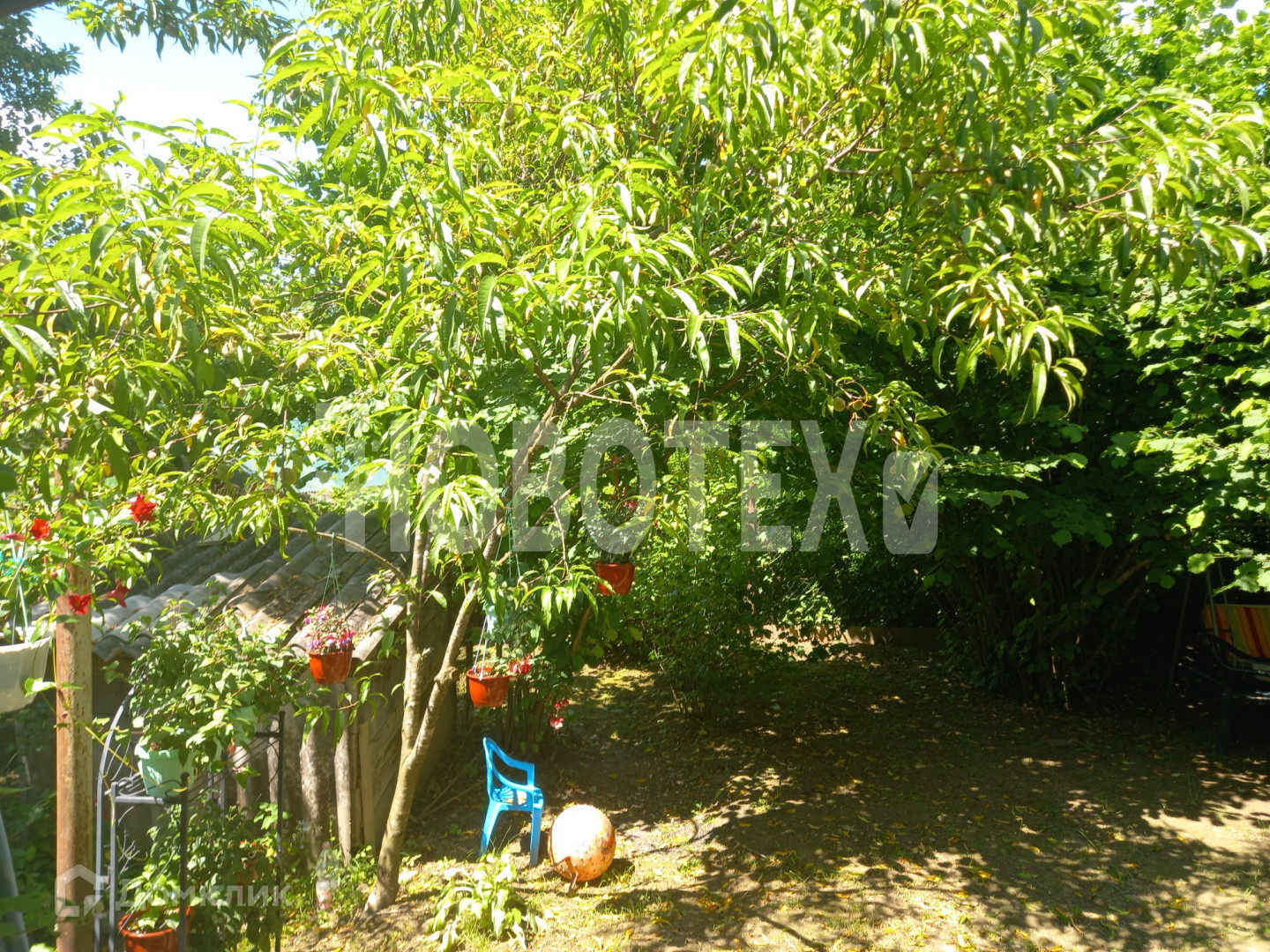 Большой участок. На котором растут персики, груша, айва, яблони, вишня. Также есть виноград. Есть место для грядок или теплицы. А также зона отдыха.