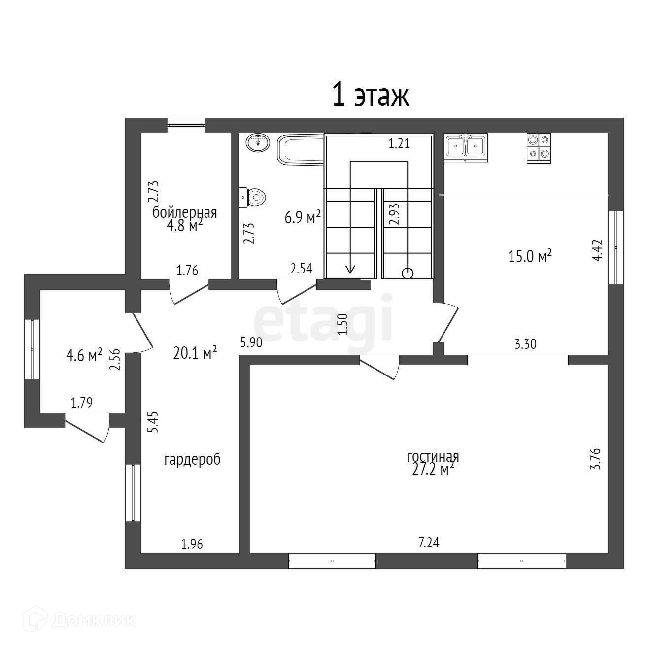 На первом этаже расположены: кухня, гостиная, санузел, прихожая, бойлерная⁣⁣.⠀