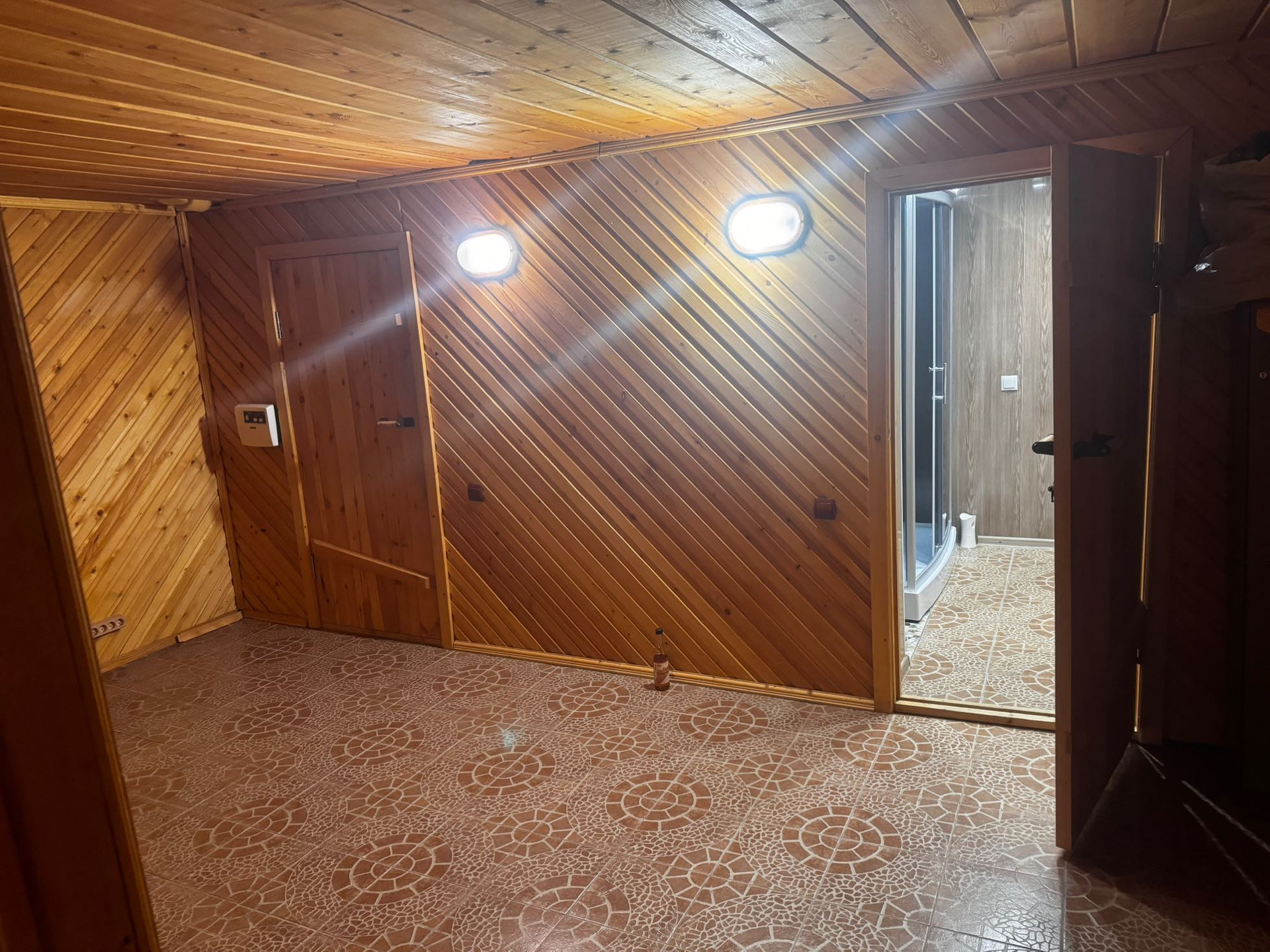 На первом этаже прихожая, гардеробная, санузел , гостевая комната, сауна с комнатой отдыха, санузел с душевой, комната отдыха.