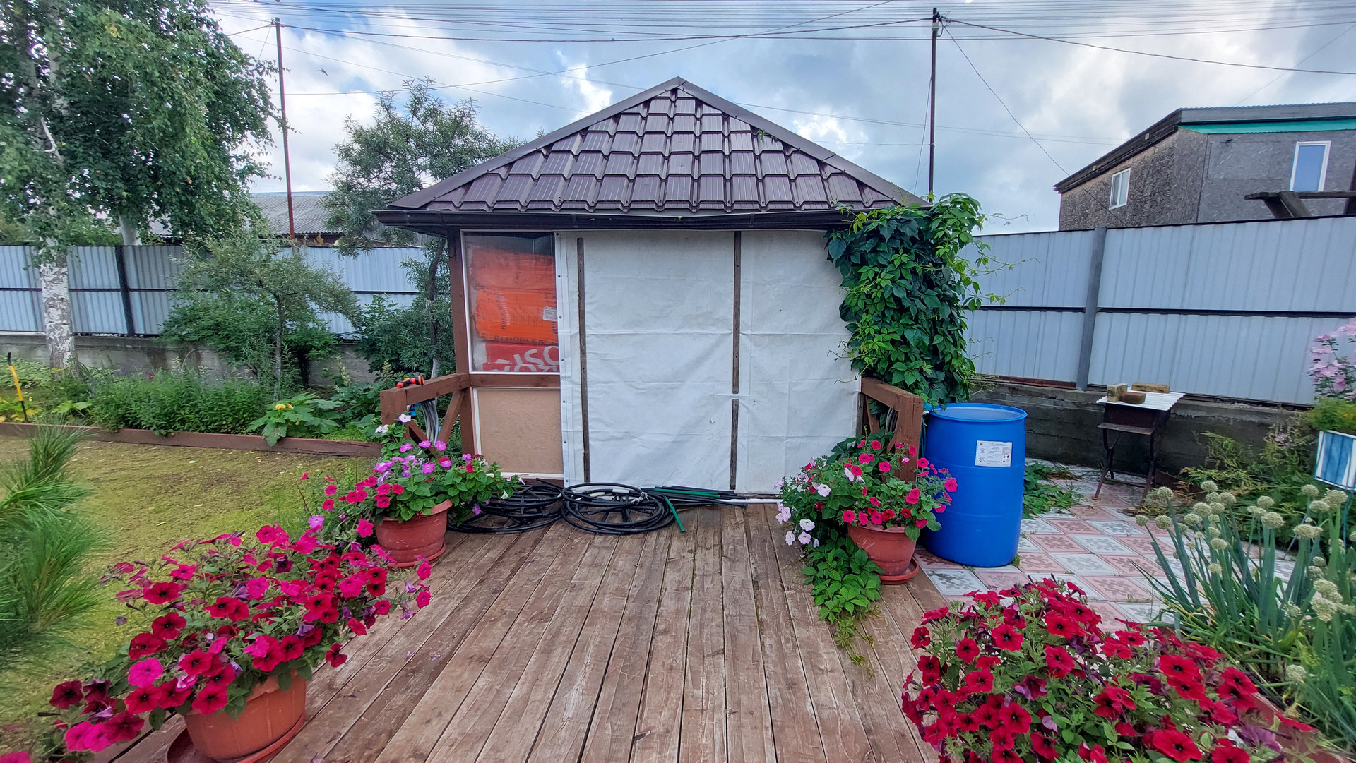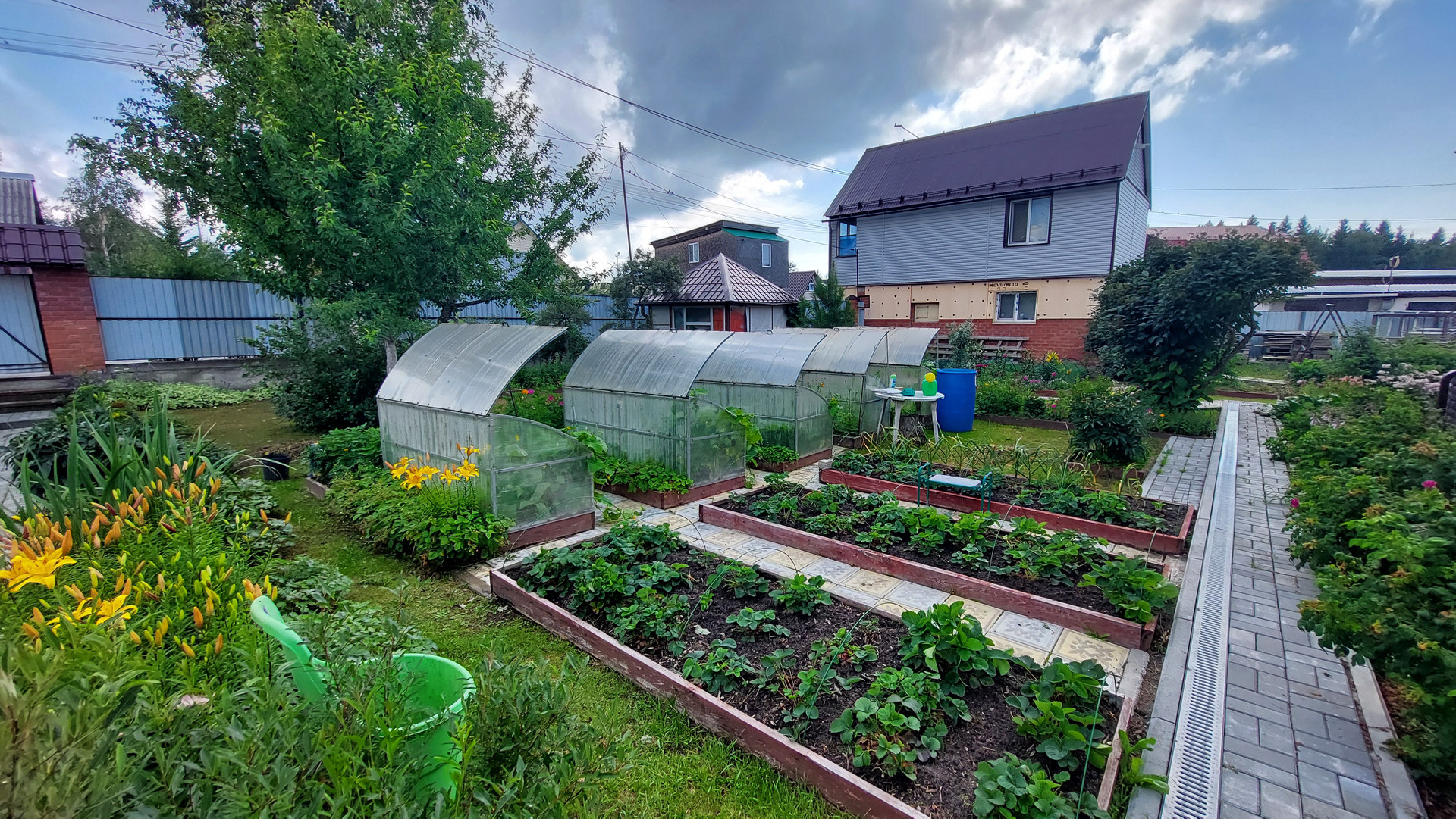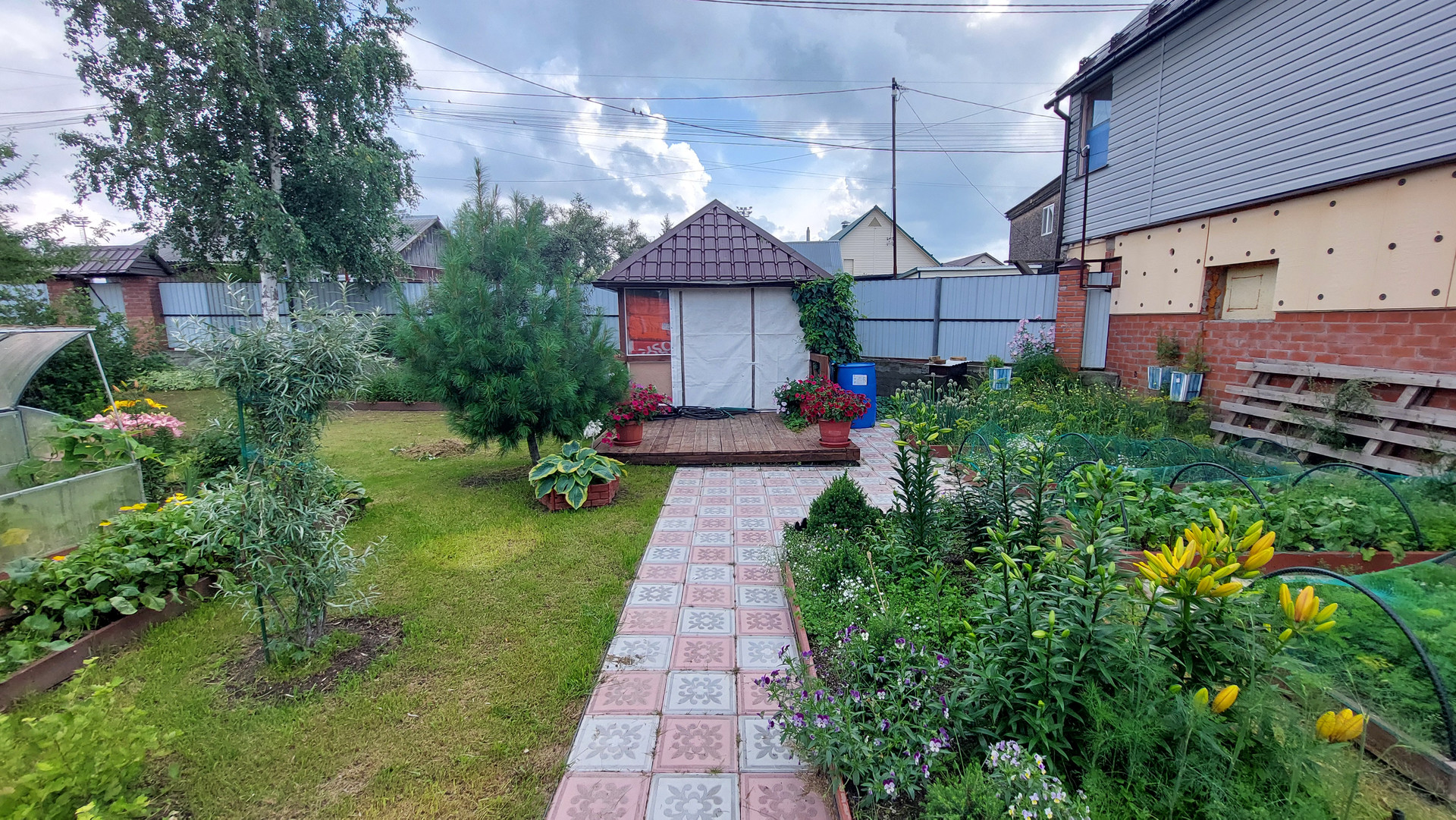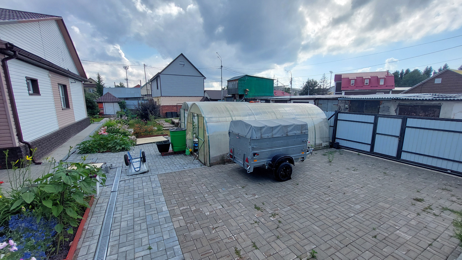 Участок огорожен капитальным забором, площадь участка 1202 кв. м., на нем имеется капитальный гараж на две машины с автоматическими воротами, въезд в гараж осуществляется сразу с асфальтированной дороги, техническая постройка для хранения вещей и мастерская, обустроена беседка для отдыха, две теплицы, многолетние растения, цветы, ягоды, кустарники, деревья.
