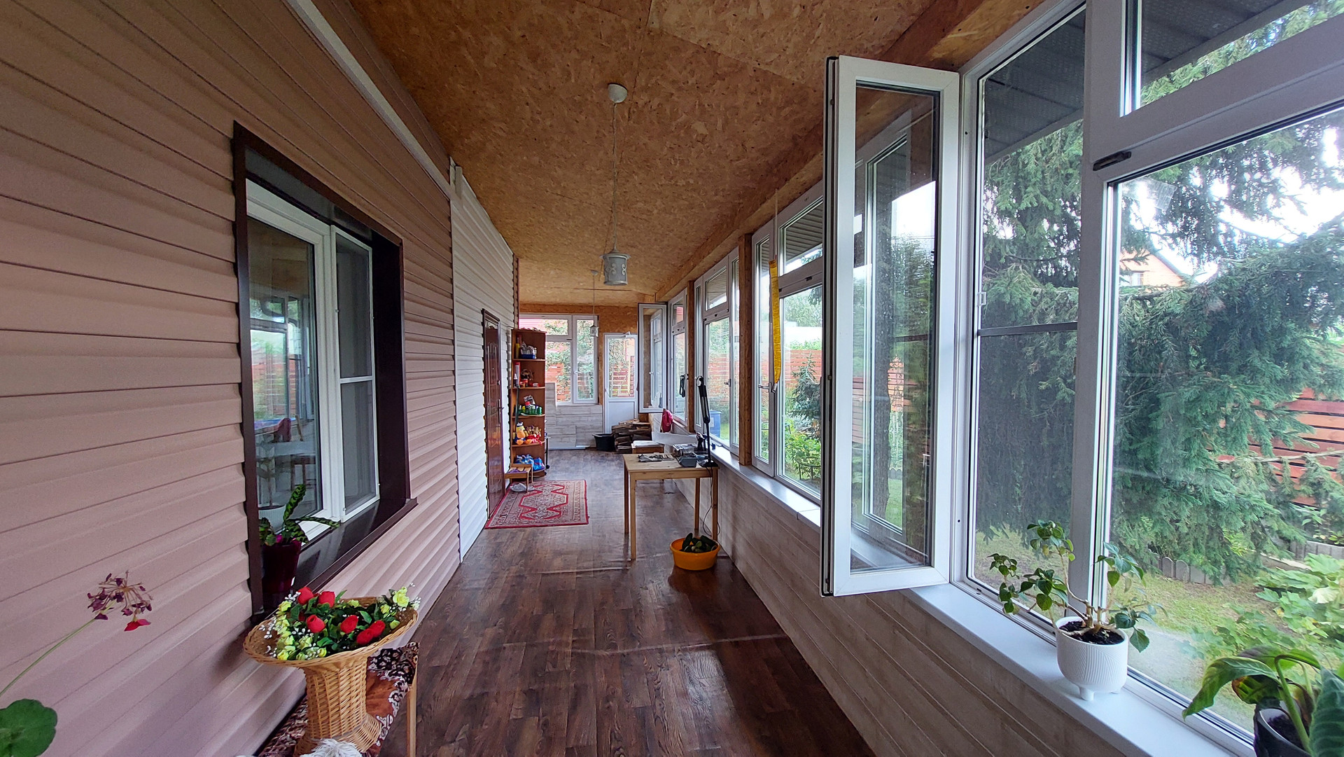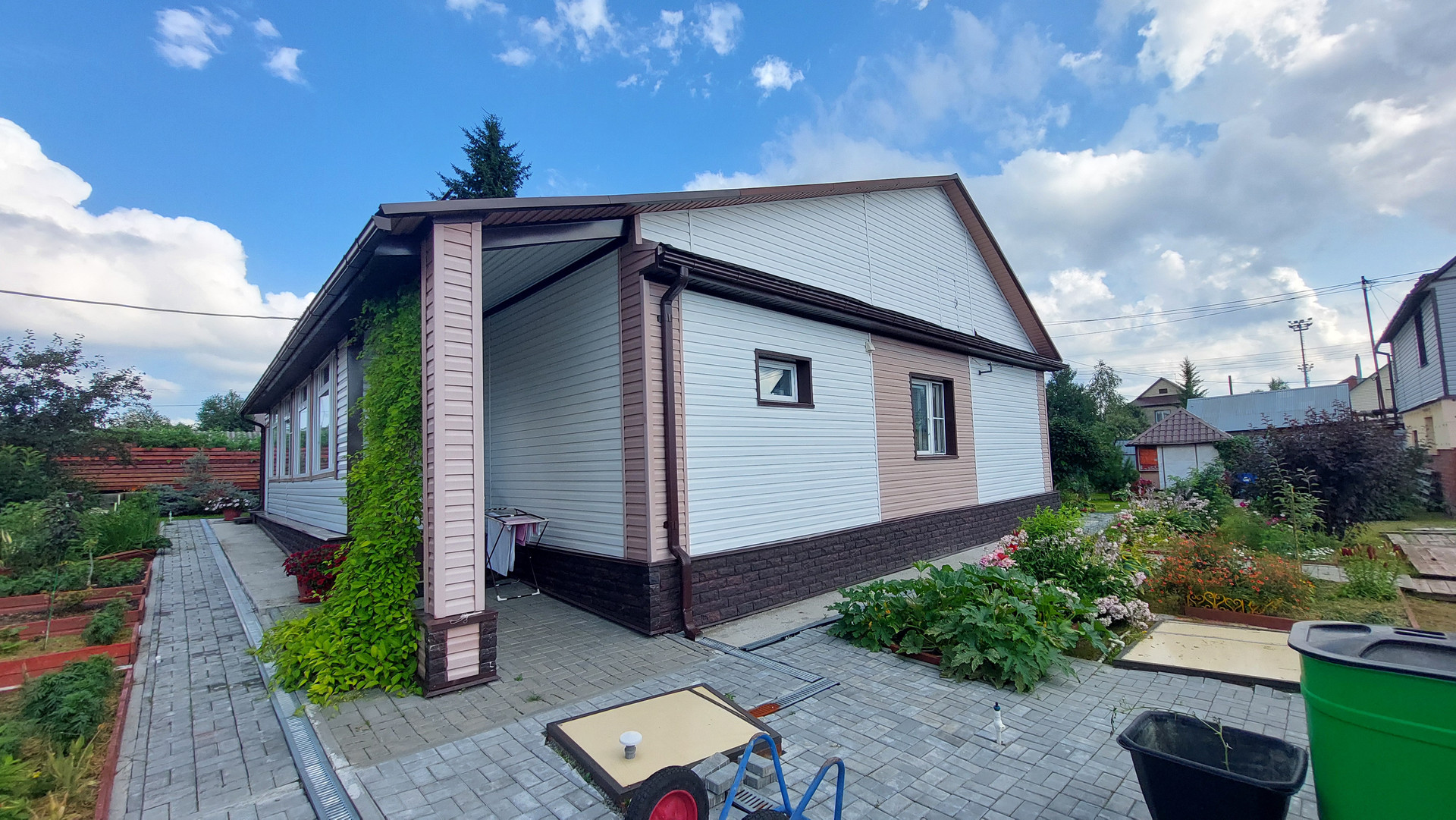 Фундамент дома ленточный, дом построен из бруса и блоков, стены утеплены и обшиты сайдингом, крыша покрыта металлочерепицей, установлен теплый пол в доме.