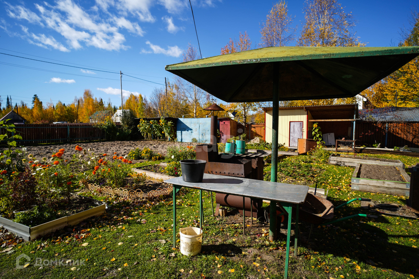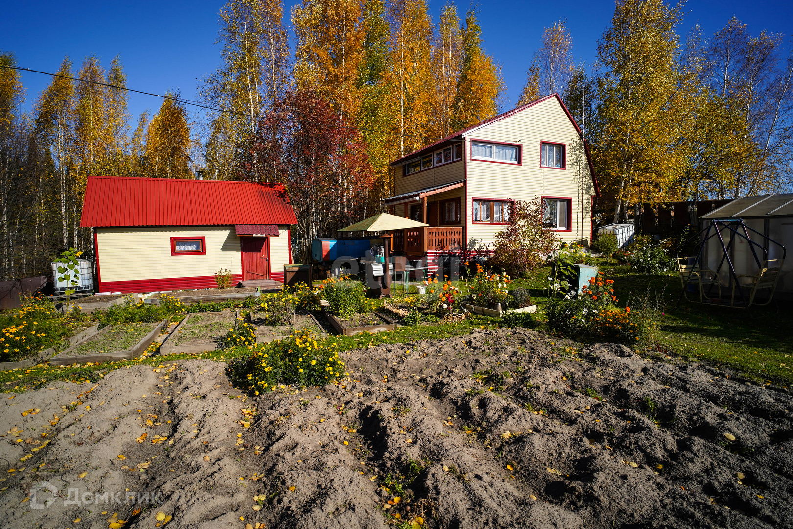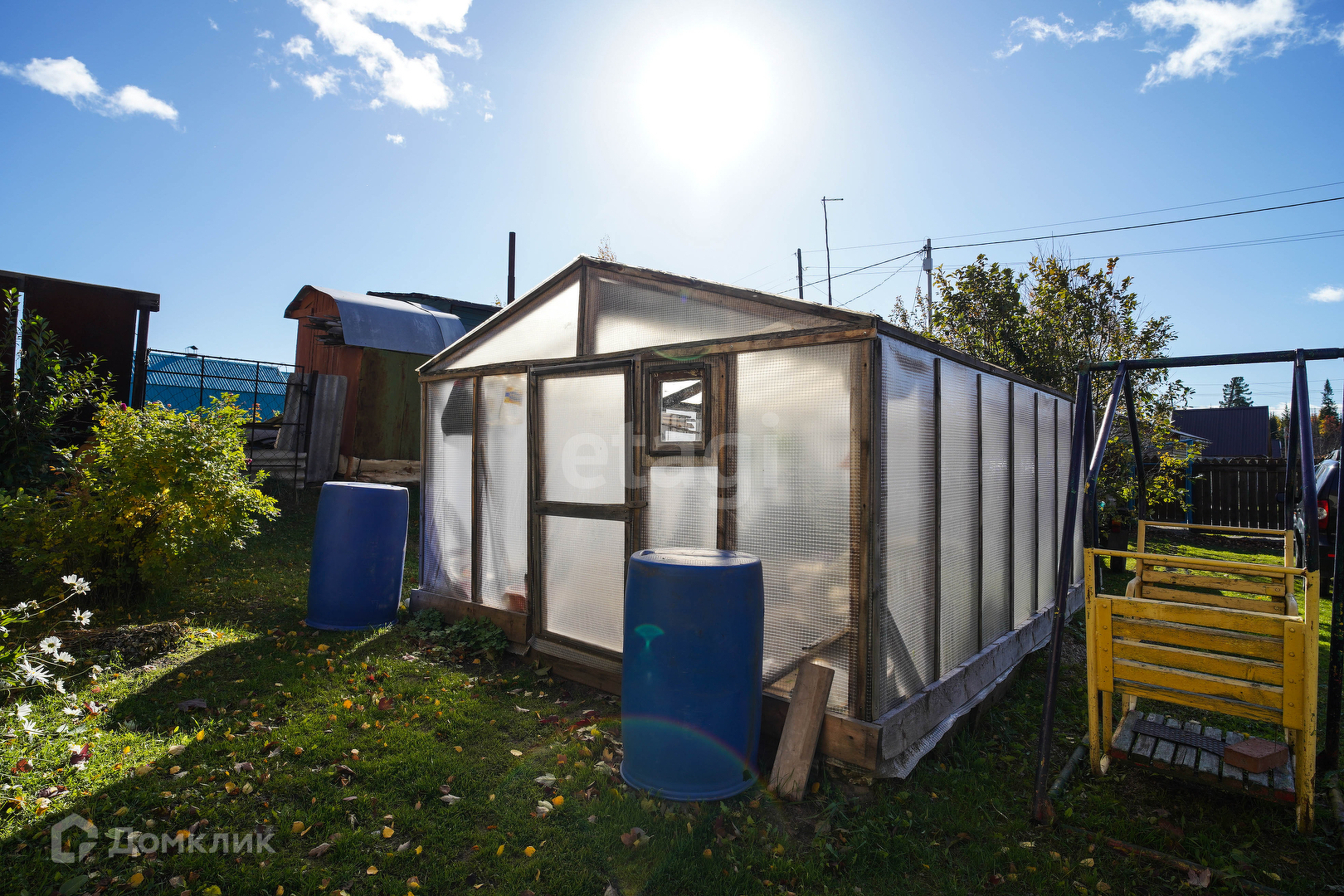 Участок разработанный: теплица, мангальная зона, качели
