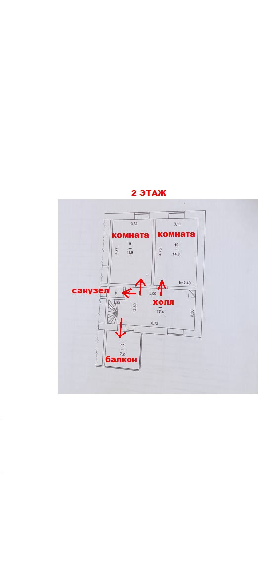 На втором этаже 2 комнаты 15,9/14,8 кв.м., холл 17,4 кв. м., лестница, санузел, высота помещений 2,40 м.