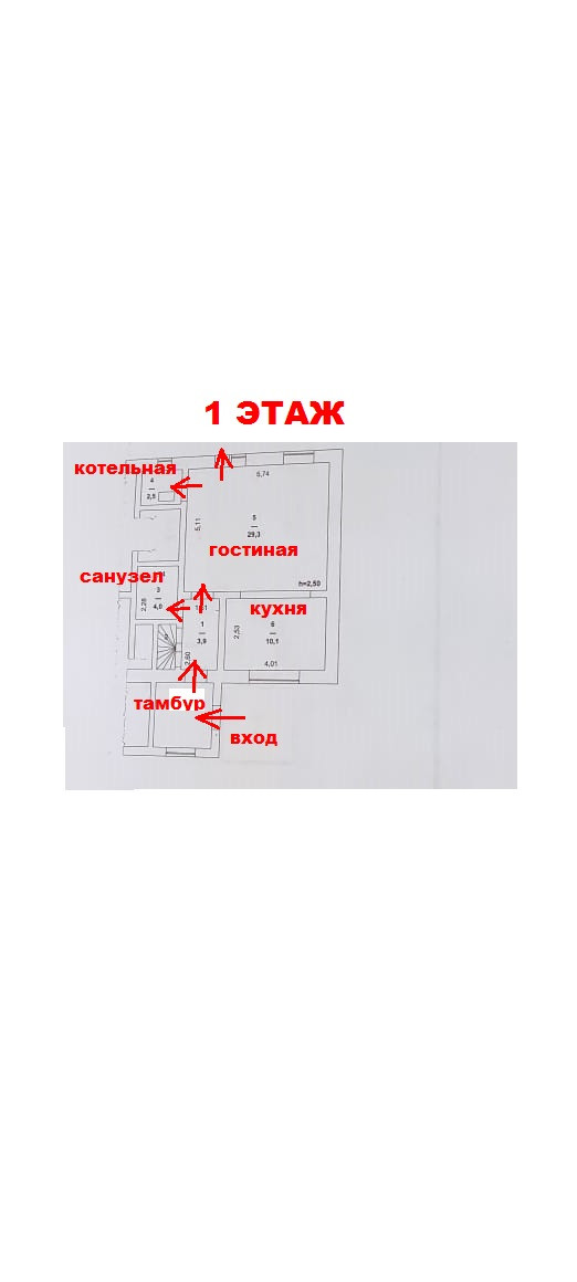 На первом этаж: расположена кухня 10,1 кв. м., гостиная 29,3 кв. м., совмещенный санузел с ванной, котельная 2,5 кв. м., высота помещений 2,50 м., прихожая, тамбур, встроенный натуральный камин.