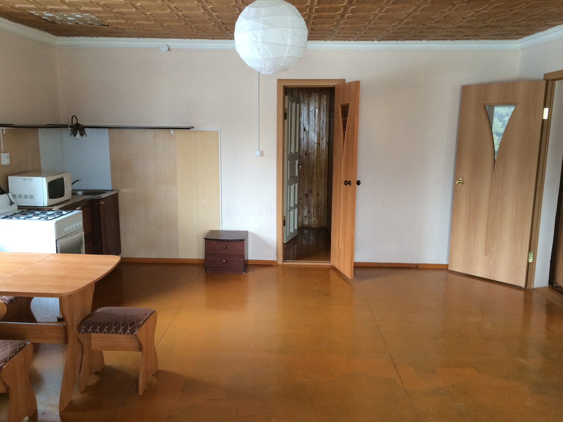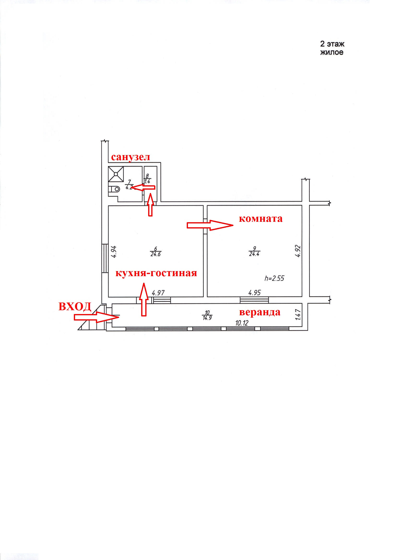 Второй этаж представляет собой изолированная квартира с отдельной входной группой состоящая из кухни-гостиной 24 кв. м., одной жилой комнаты площадью 24,4 кв. м., и совмещенного санузла 4,2 кв. м., а также веранды 14,9 кв. м., высота квартиры 2,55 метра.