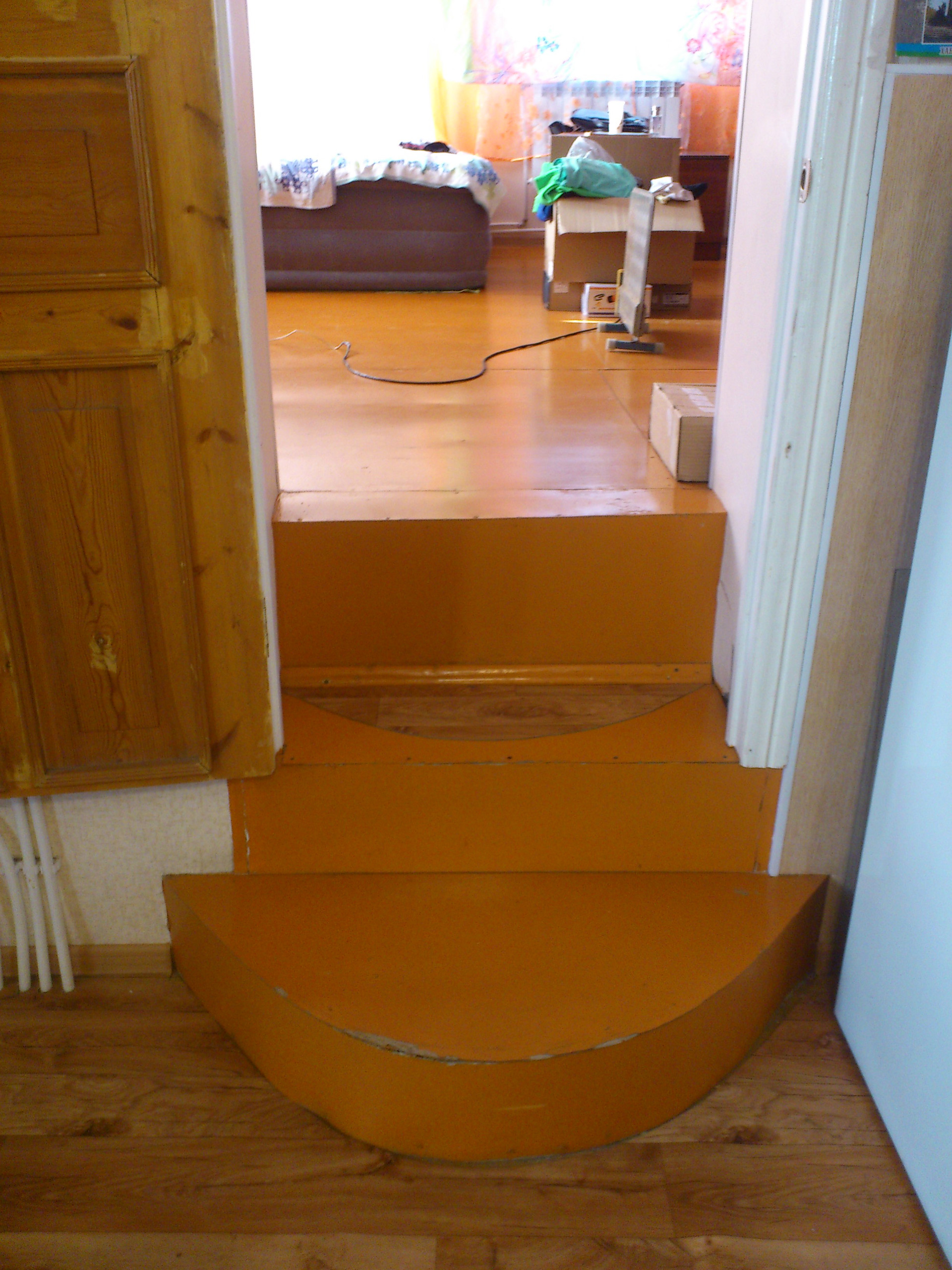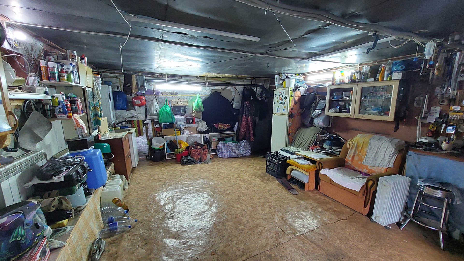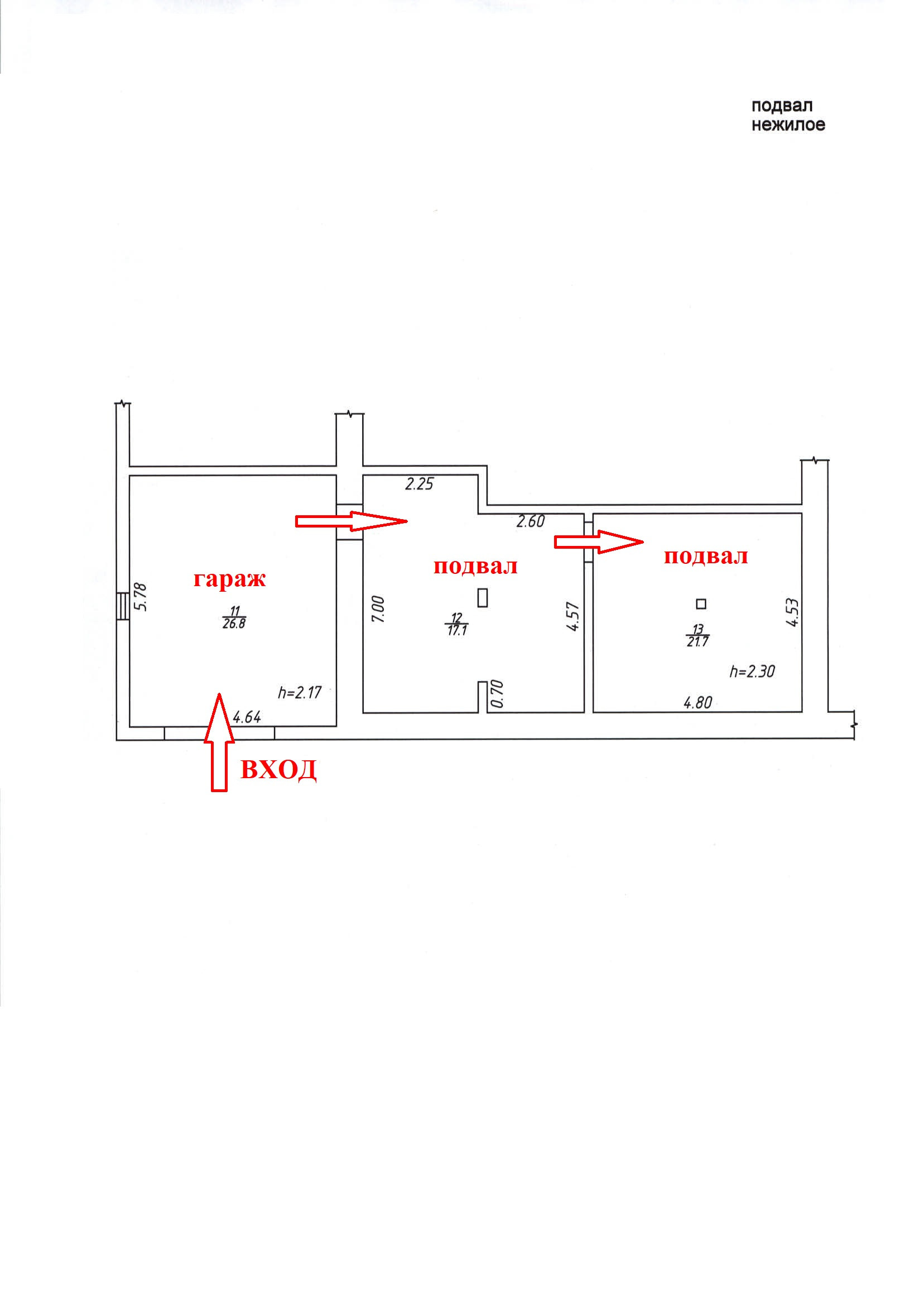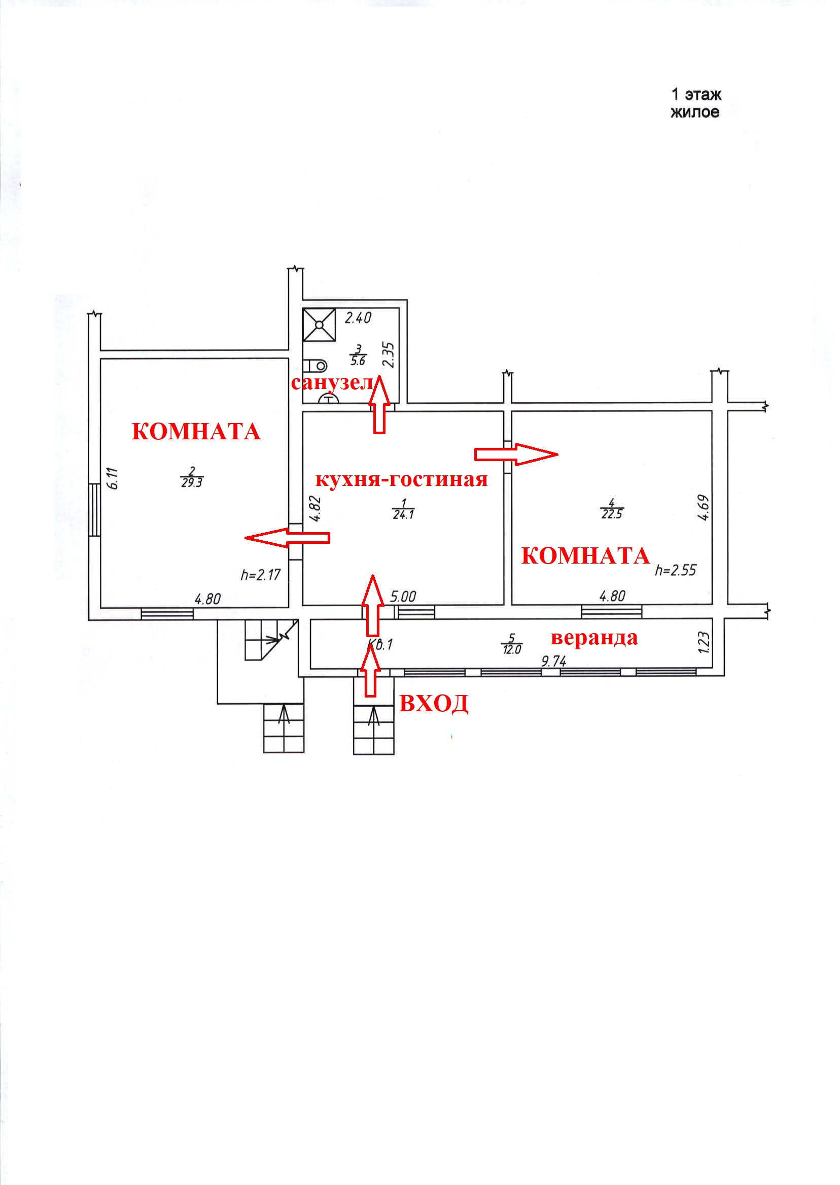 На первом этаже расположен подвал 38 кв. м. и гараж 26,8 кв. м, а также изолированная квартира с отдельной входной группой состоящая из кухни-гостиной 24 кв. м., двух жилых комнат площадью 22,5/29,3 кв. м., и совмещенного санузла 5,6 кв. м., веранды 12 кв. м., высота квартиры переменная от 2,17 до 2,55 метра.