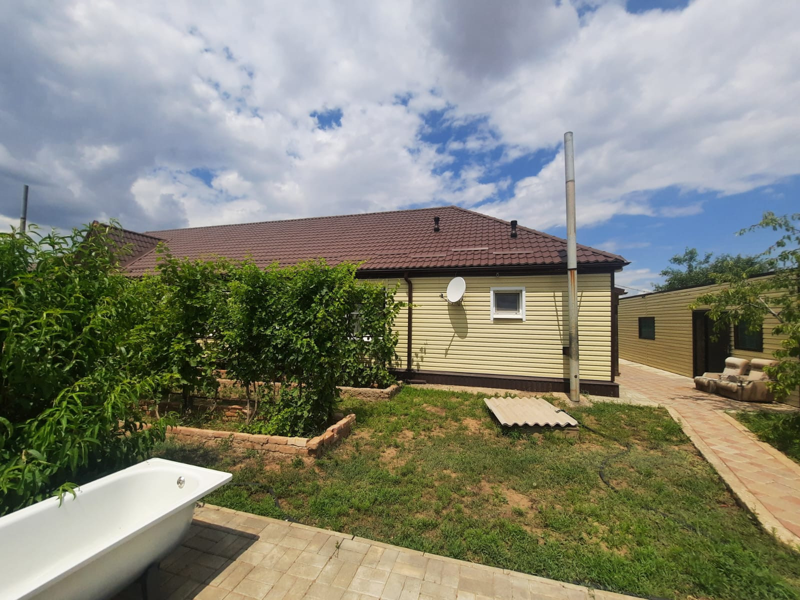 Во дворе гараж на 2 машины с ямой, также в гараже имеется подвал! баня в очччч хорошем состоянии,! Фруктовые деревья-все плодоносящие,18 сортов винограда! Очень ухоженный двор! дом обшит металлическим сайдингом! Сам по себе дом очень теплый, все делали сами!