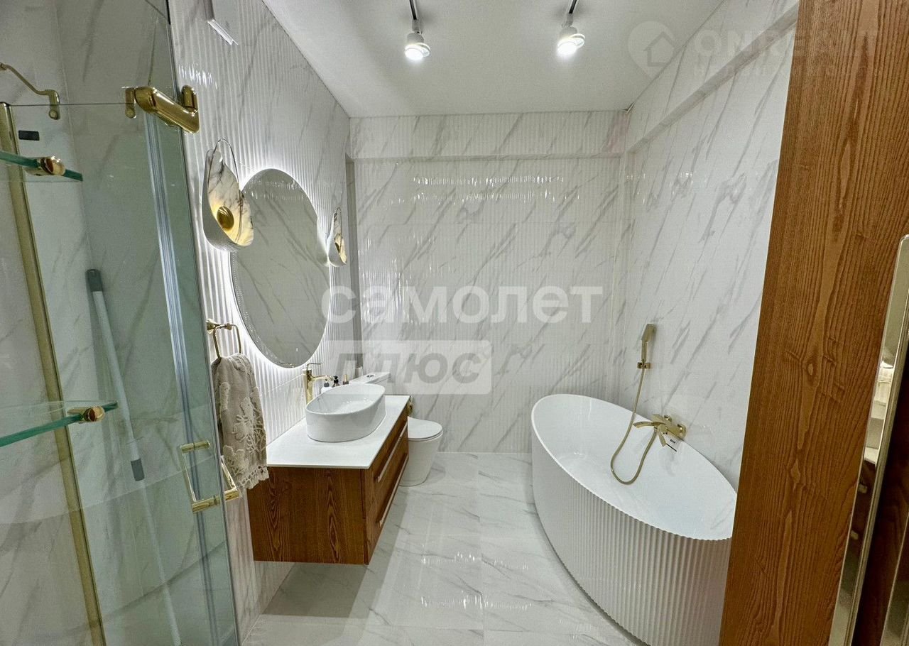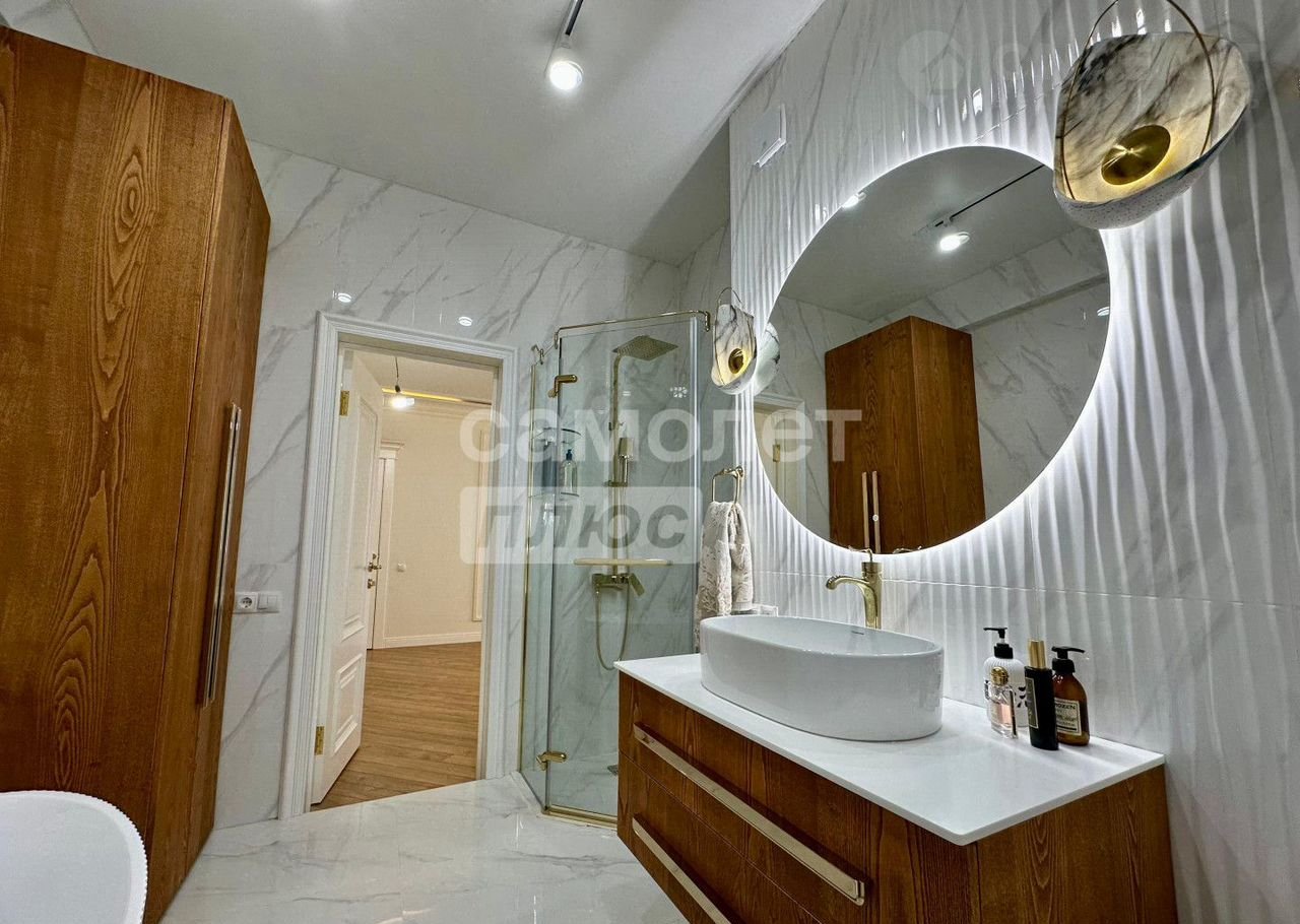 Отделка: Современный ремонт с использованием качественных материалов — светлые стены, встроенное освещение, ламинат и плитка премиум-класса.
