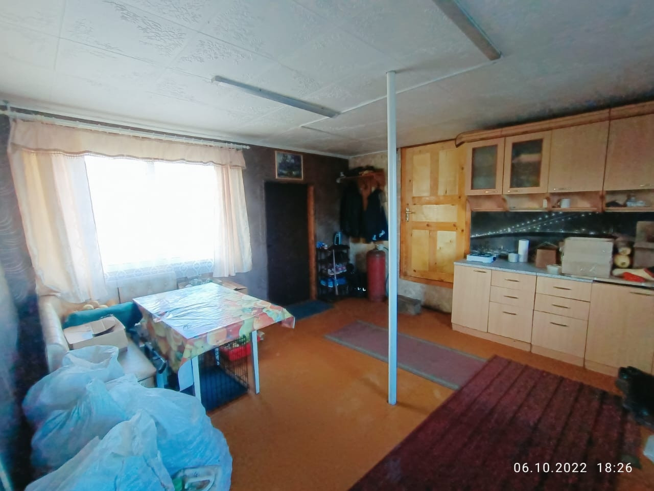 Веранда из бруса 18х18см 20м² подключена к отоплению, внутренняя отделка гипсокартон обои. На веранда установлен и остаётся новым владельцам кухонный гарнитур и кухонный уголок, а также газовый баллон и плита, летом использовалась как летняя кухня, осенью для изготовления закусок и заготовок.