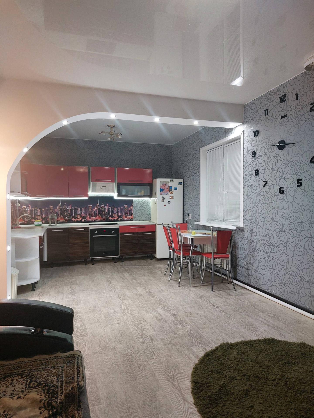 В доме остаётся кухня, встроенная дорогая духовка фирмы BOSCH, встроенная плита gorenje.