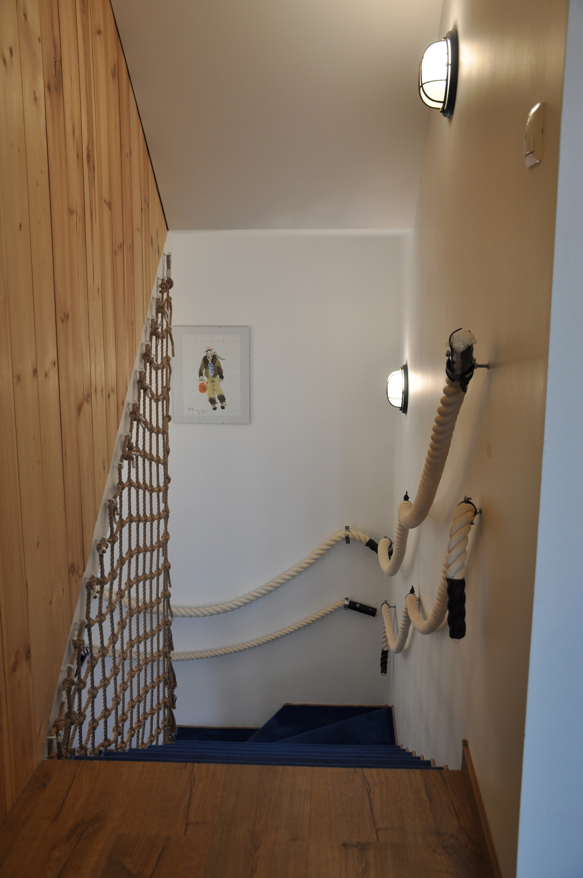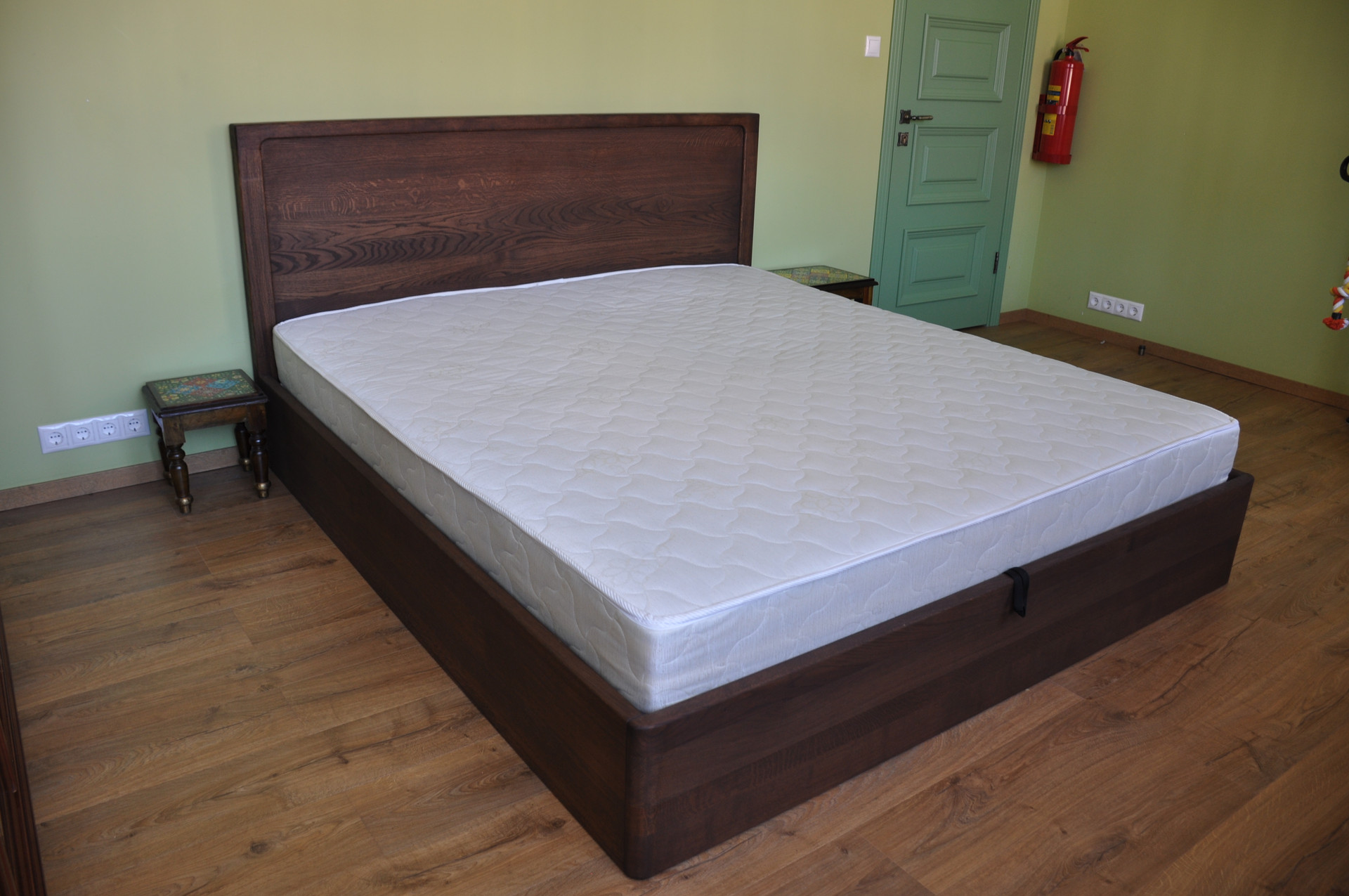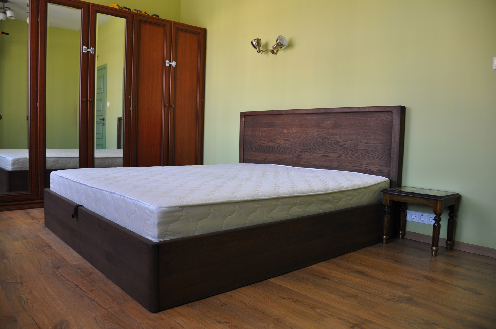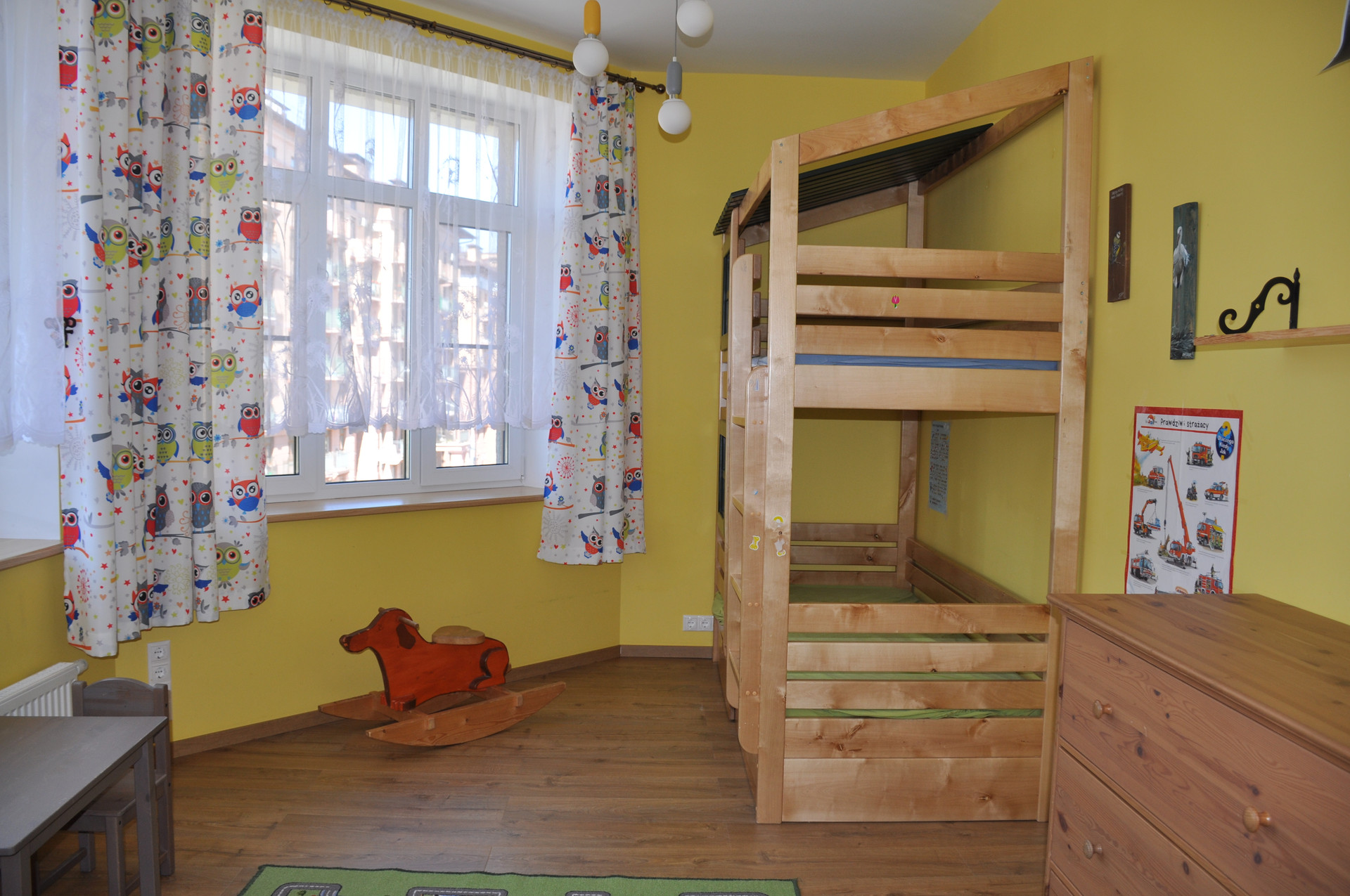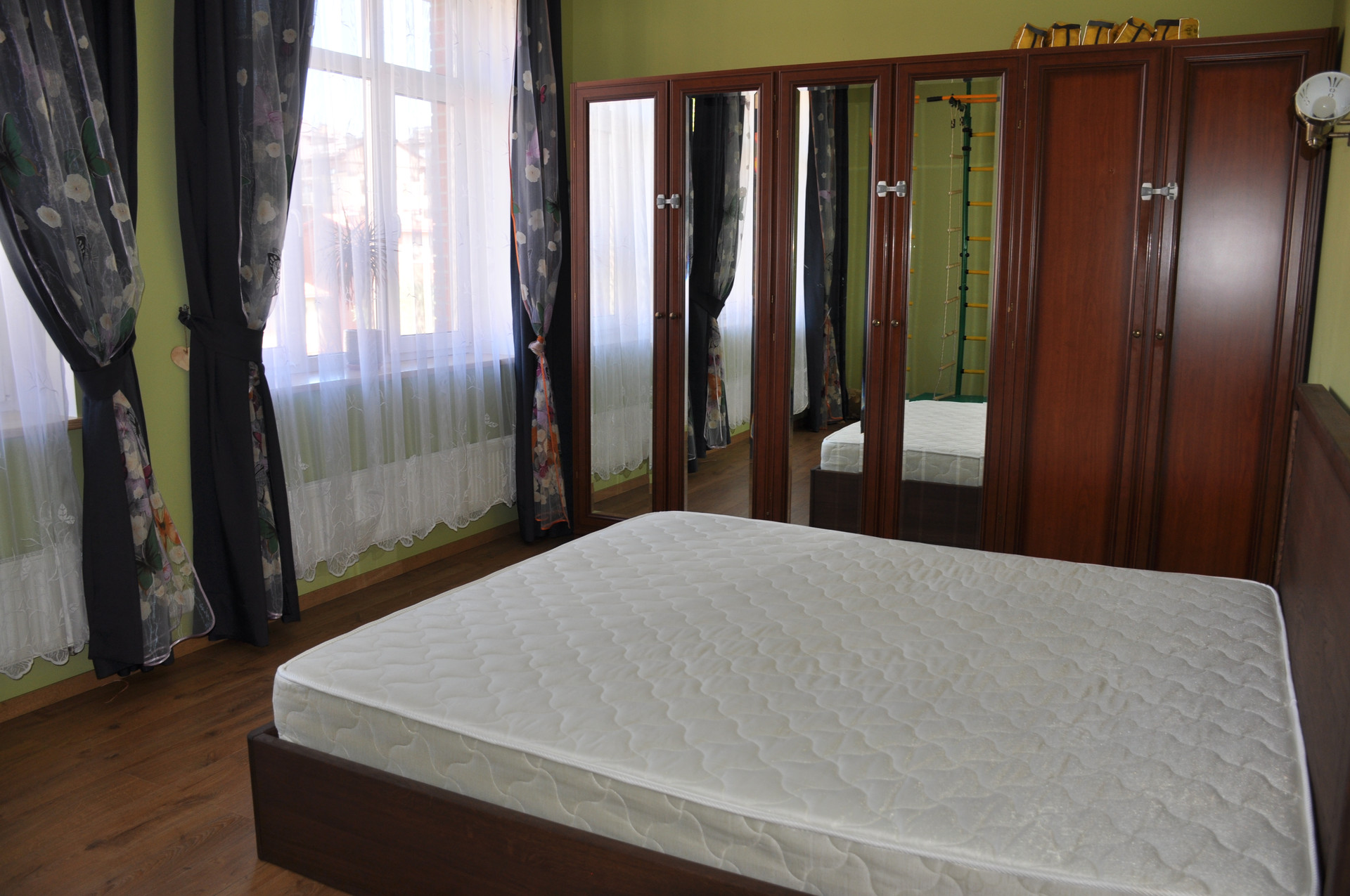 В спальне  двуспальная кровать (180 х 200) и большой шкаф для одежды, в детской  двухэтажная кровать, комоды для вещей, полка для книг, в кабинете  гостевой диван и большой письменный стол.