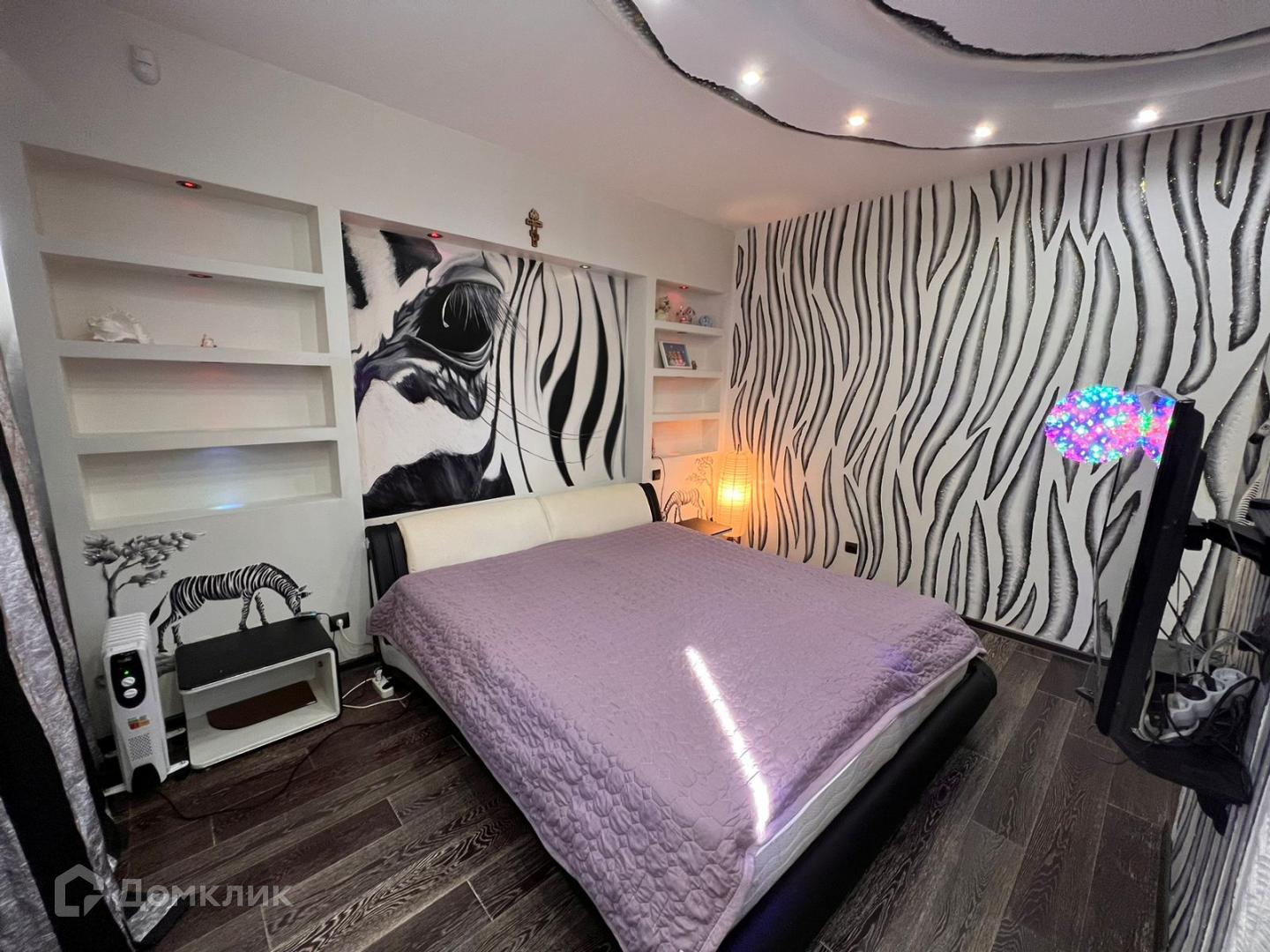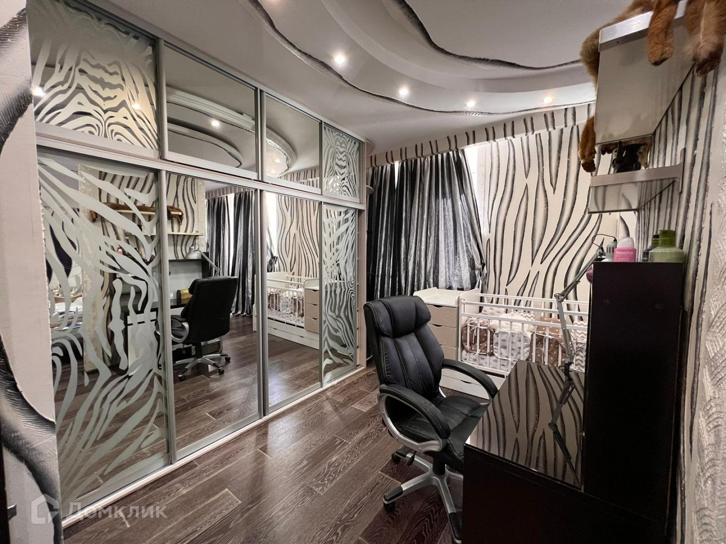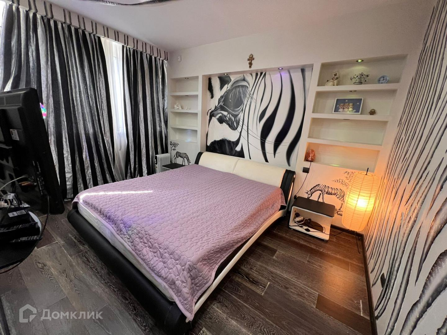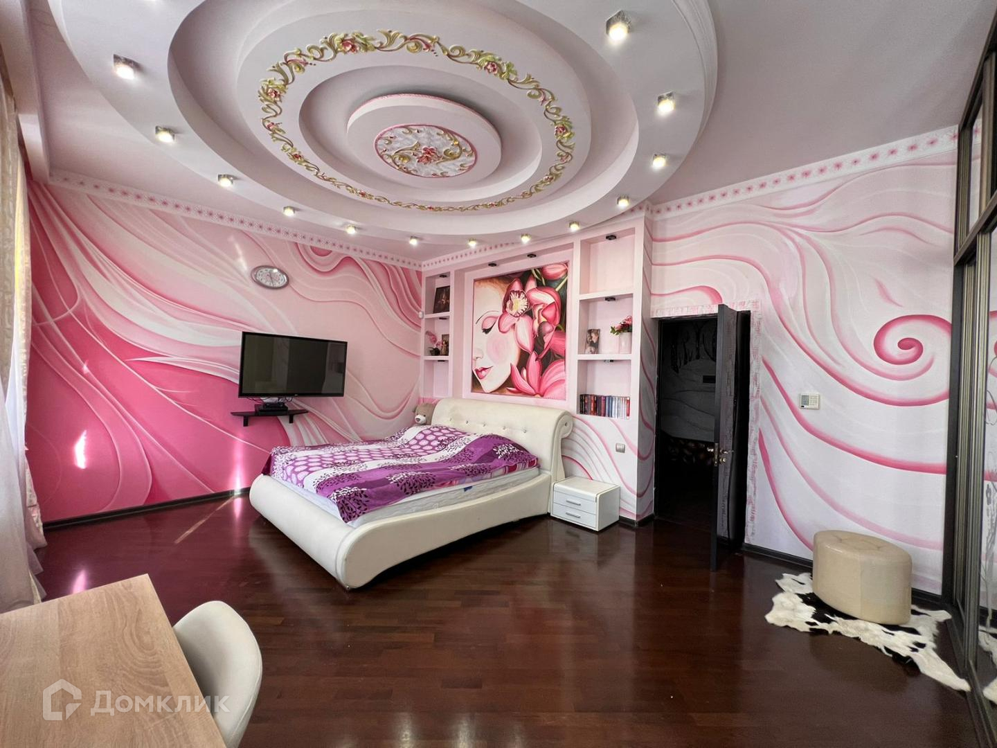 Большая гостиная с кожаными креслами, раскладывающимся диваном, телевизором и так же с встроенной зоной хранения вещей. Сделан французский балкон с прекрасным видом, где в летнее время можно поставить кофейный столик и наслаждаться свежим воздухом. Санузел и душевая кабина. Спальня выполнена в светло-розовых тонах. Есть рабочее место и большая кровать. Безусловно и в этой комнате есть встроенный зеркальный шкаф купе.