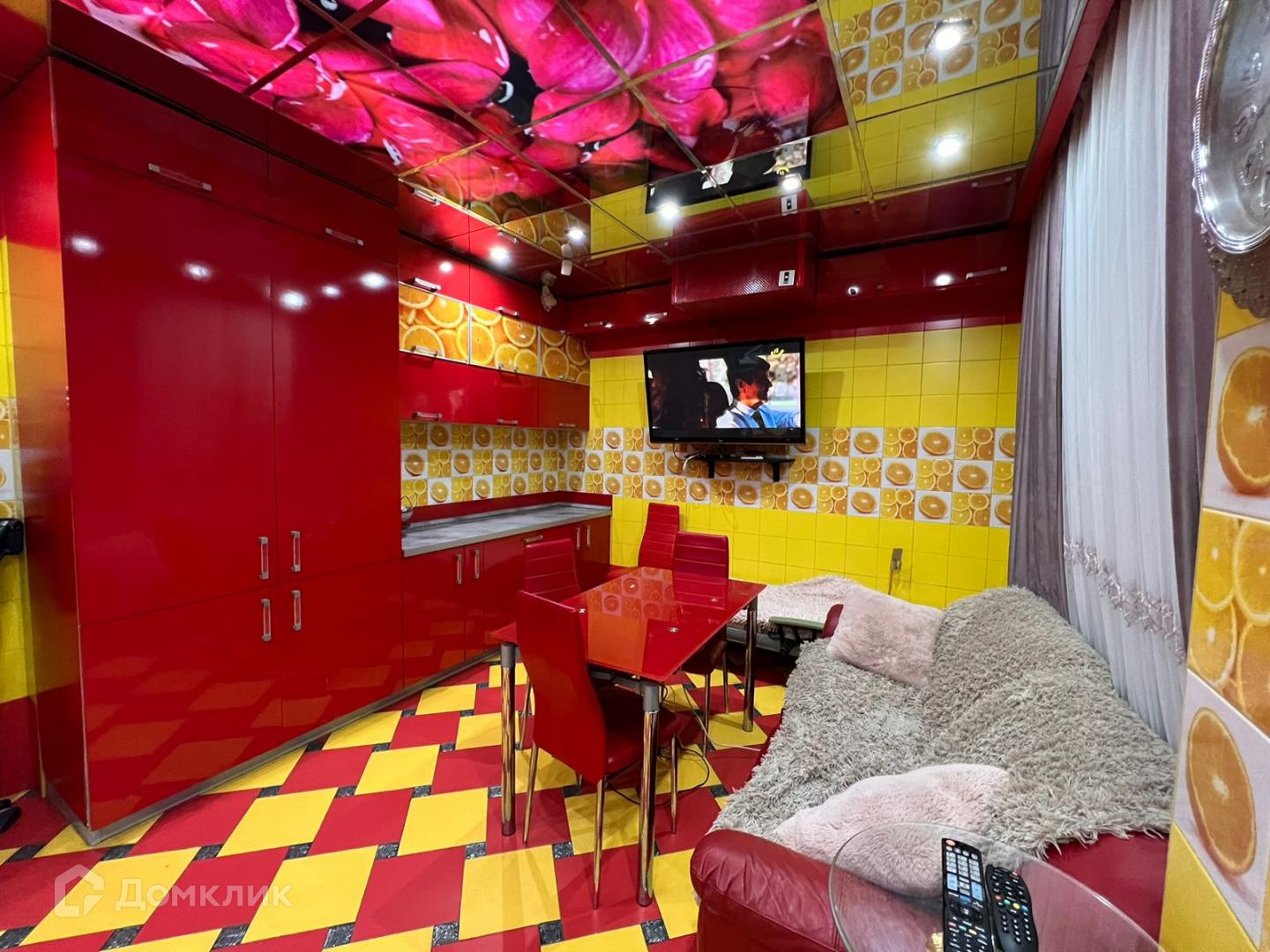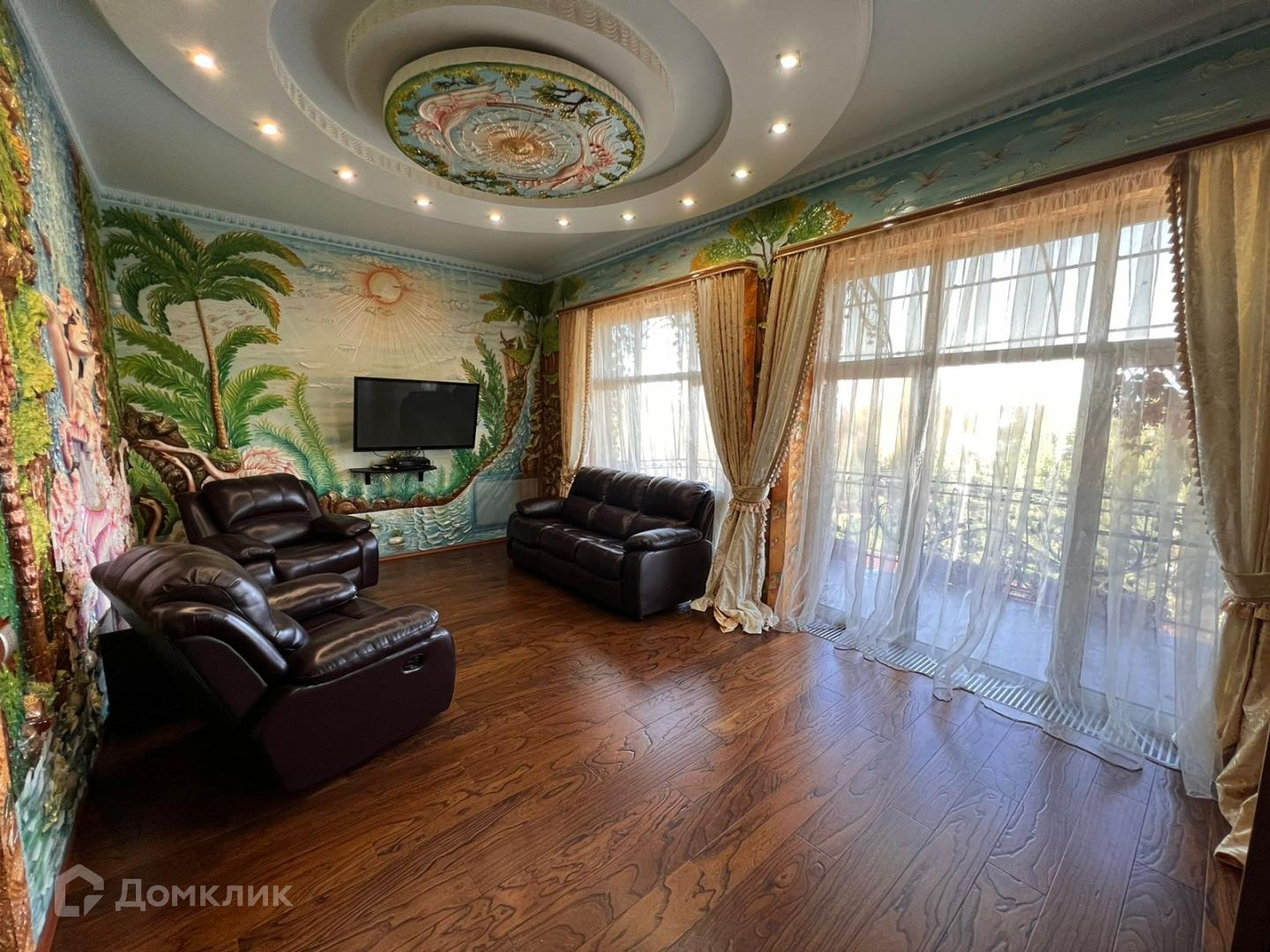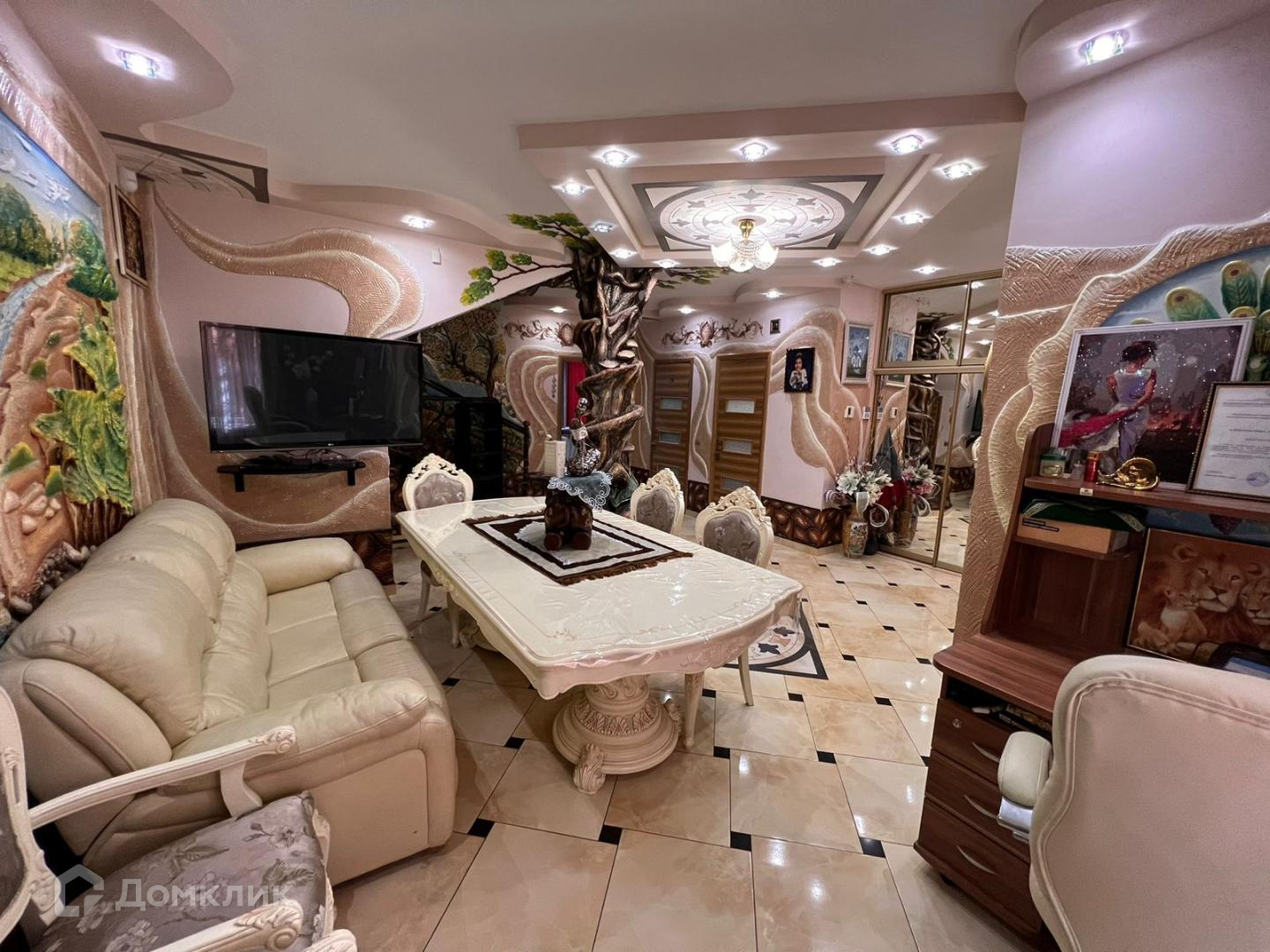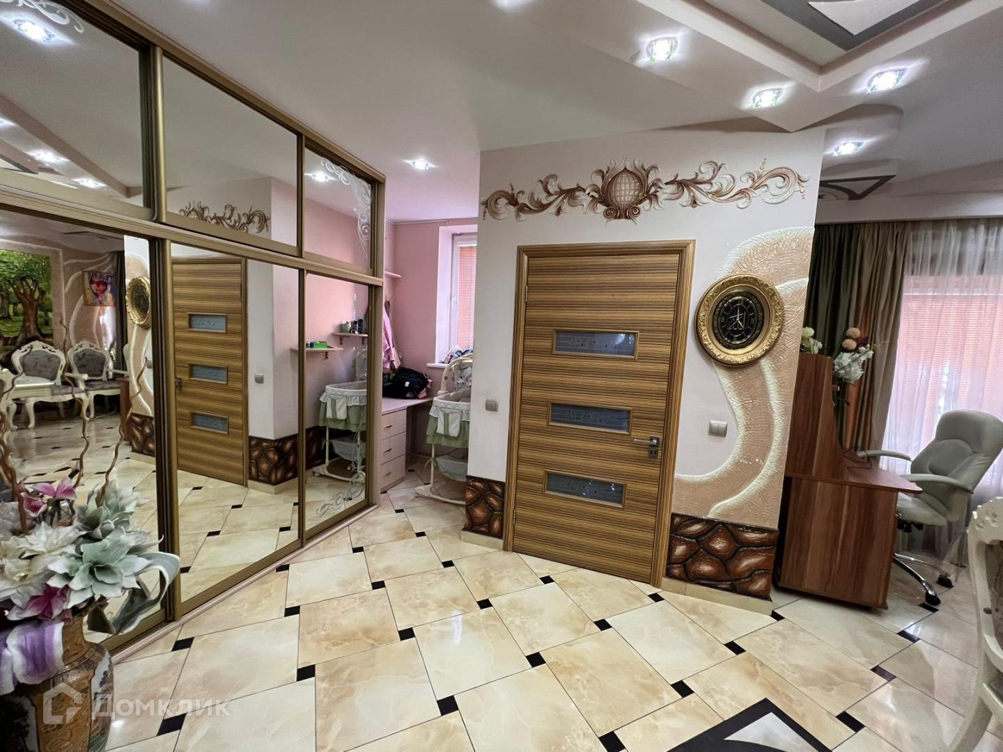 Большая гостиная с кожаными креслами, раскладывающимся диваном, телевизором и так же с встроенной зоной хранения вещей. Сделан французский балкон с прекрасным видом, где в летнее время можно поставить кофейный столик и наслаждаться свежим воздухом. Санузел и душевая кабина. Спальня выполнена в светло-розовых тонах. Есть рабочее место и большая кровать. Безусловно и в этой комнате есть встроенный зеркальный шкаф купе.