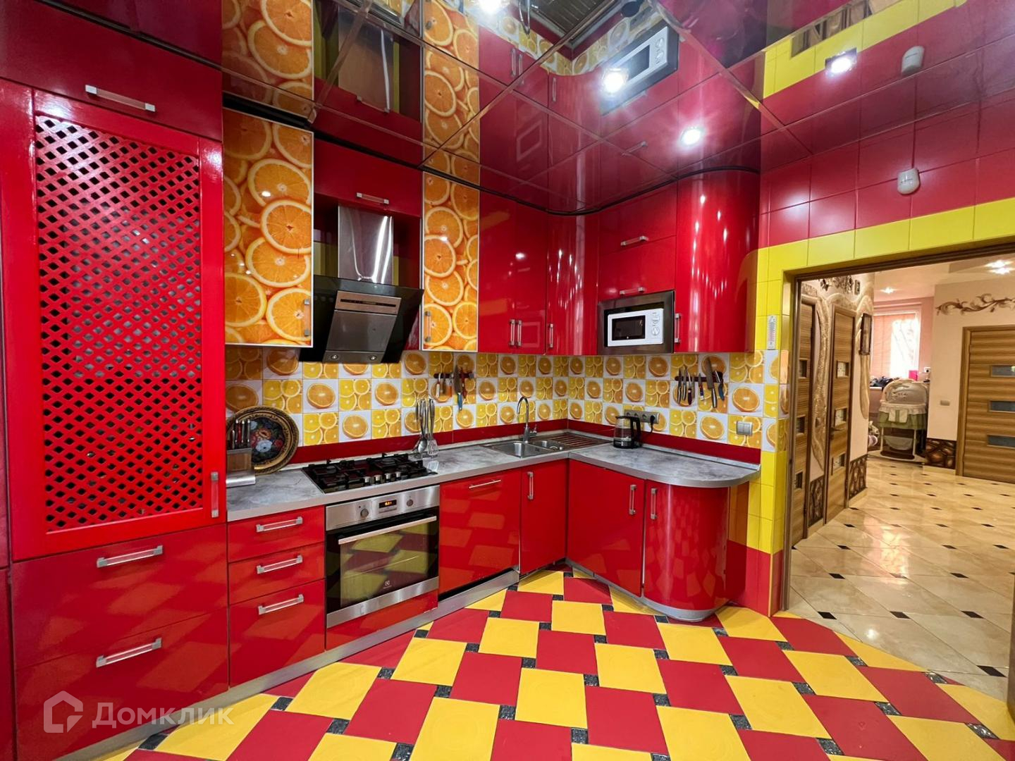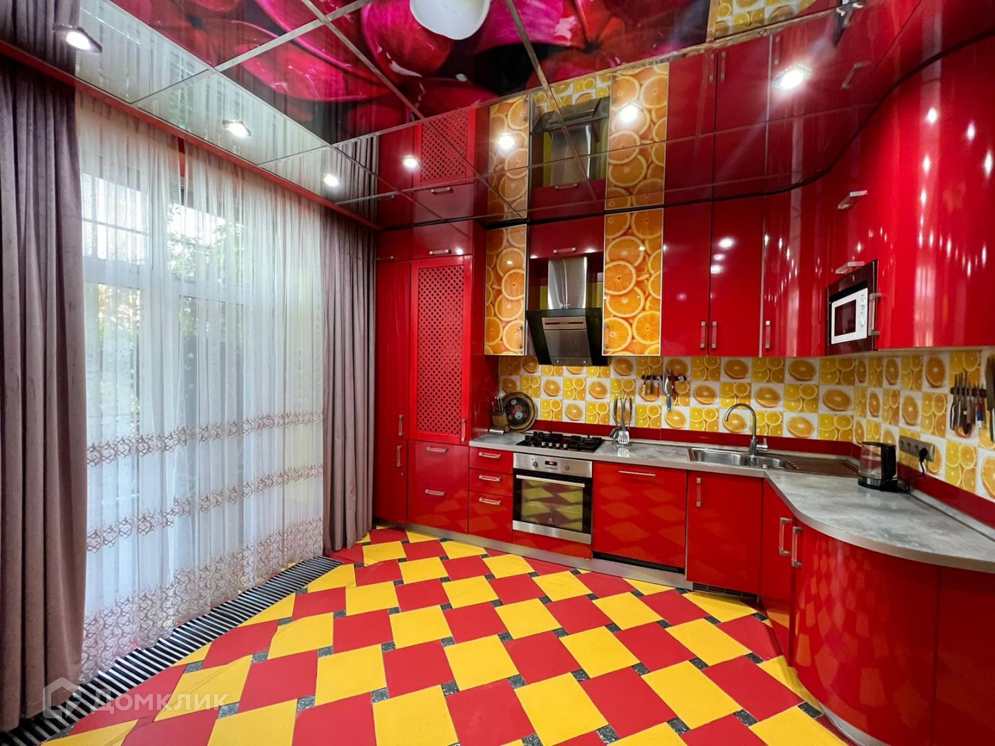 Гостиная с обеденной зоной, рабочим местом, просторным шкафом купе в светлых тонах. Так же в гостиной установлен декоративный водопад и располагаются 2 кладовых. Один гостевой санузел. Кухонная зона выполнена в ярких тонах и поделена на 2 зоны. 1 зона для приготовления блюд, 2 зона обустроена под гостиную с уютным кожаным диваном и массажной кроватью. Установлено два холодильника, телевизор, микроволновка, посудомоечная машина, стиральная машина, духовой шкаф и газовая встроенная плита. На кухне французский балкон с выходом на патио зону заднего двора.