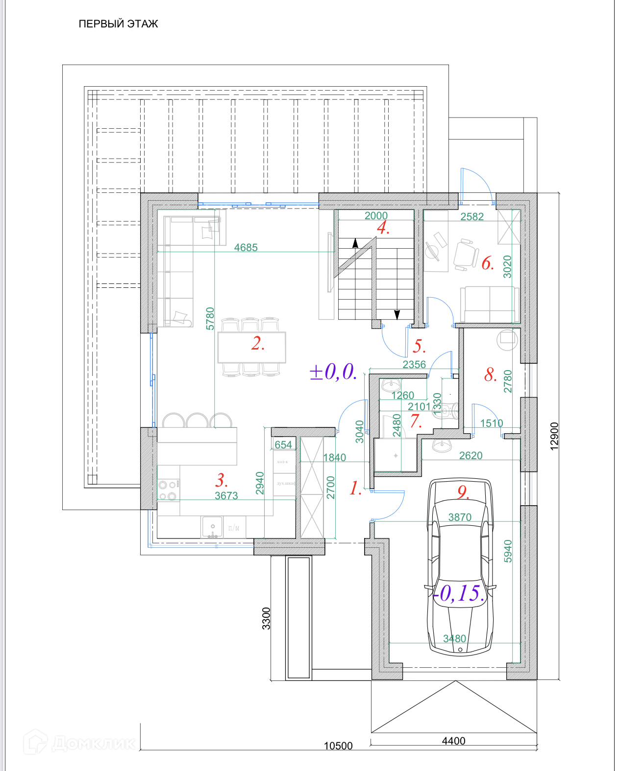 В доме удобная и продуманная планировка, на первом этаже: просторная кухня-гостиная, отдельная комната-кабинет или гостевая спальня, санузел, котельная и  теплый гараж.