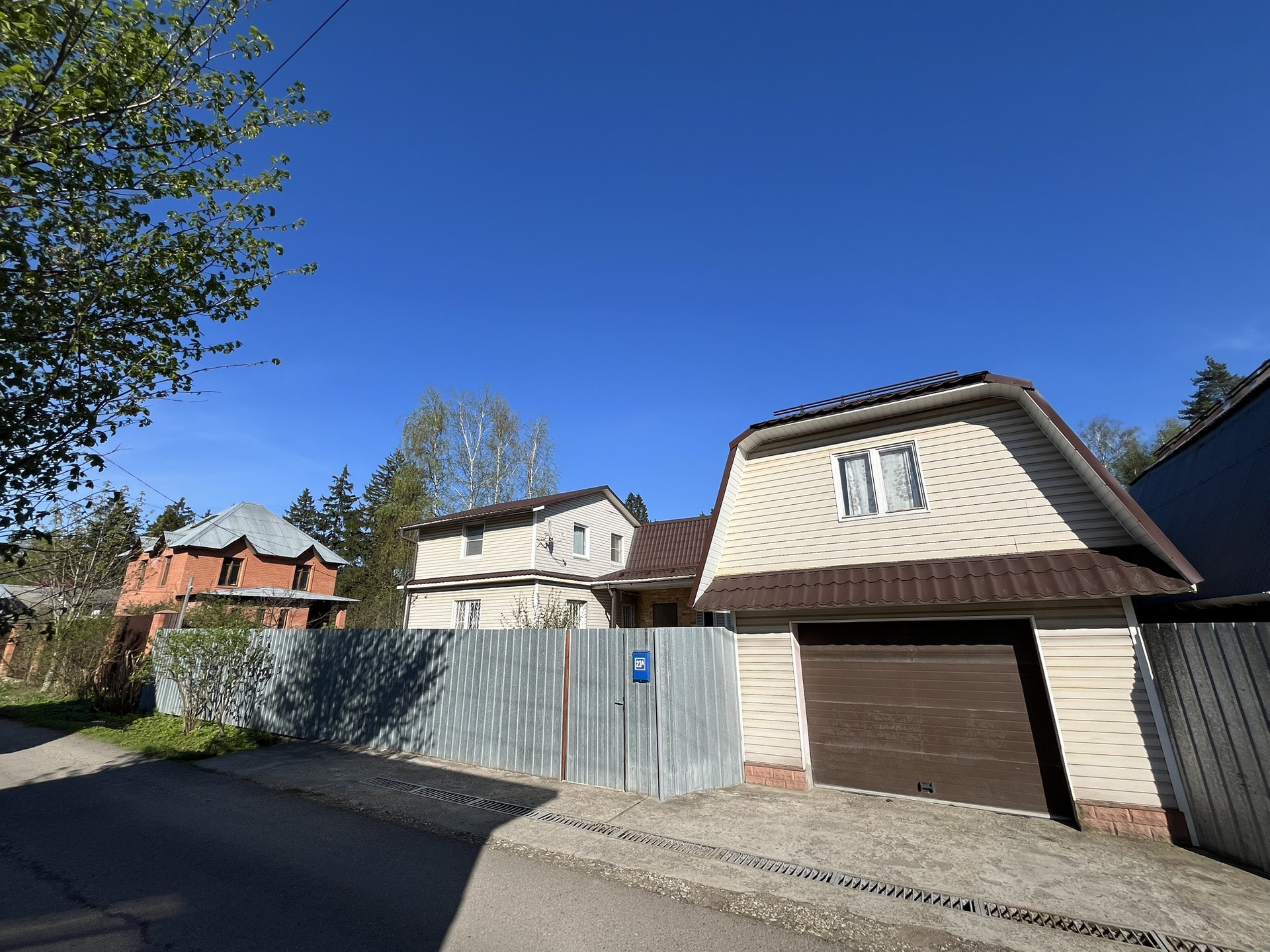 ИЖС, большой ровный облагороженный участок 9 соток, на нем расположены: 2 этажный кирпичный дом для круглогодичного проживания, 2 этажный блочный гараж, беседка, хозблок, workout зона, теплица, садовые грядки, вольер для собаки, зона отдыха и прекрасная зеленая лужайка перед окнами столовой.